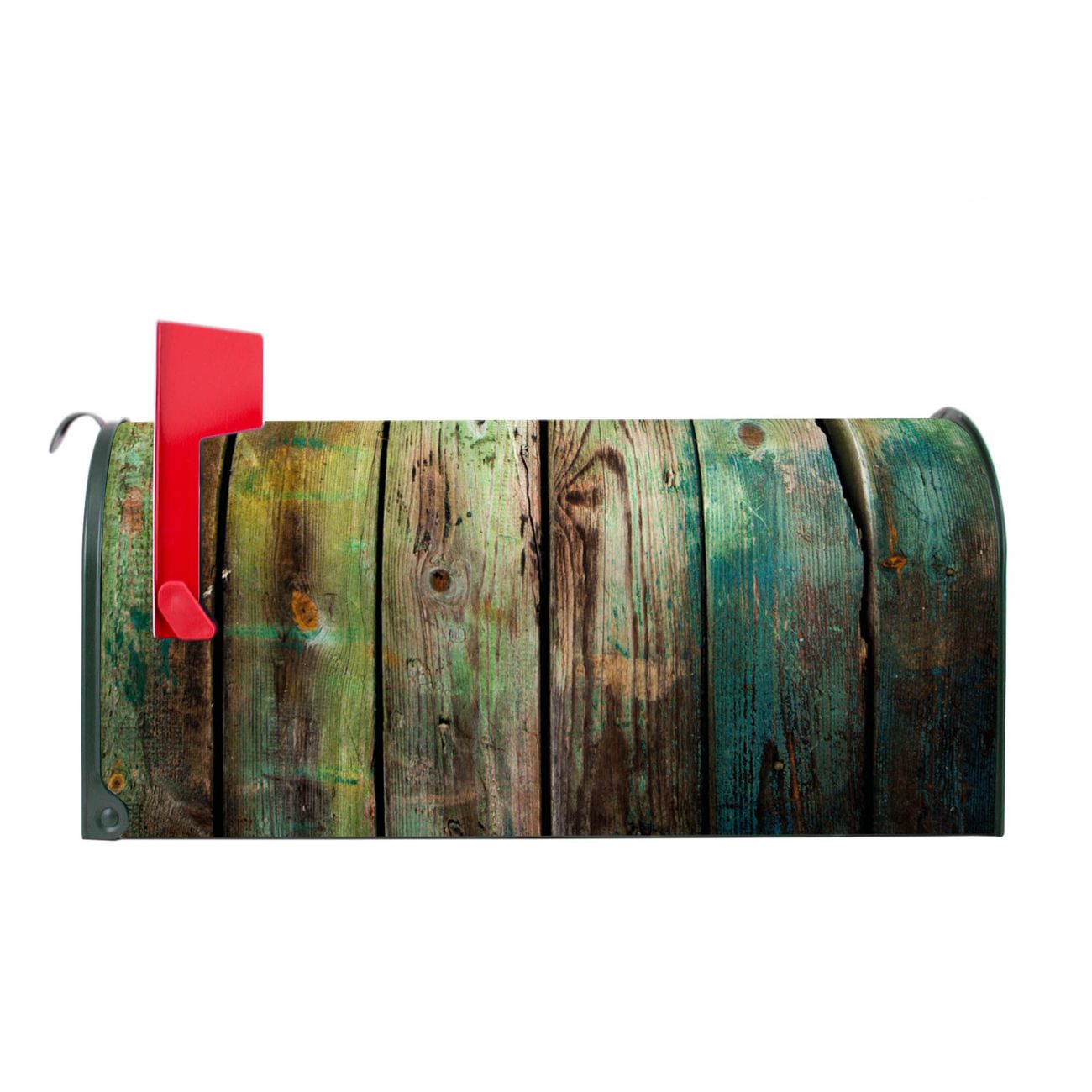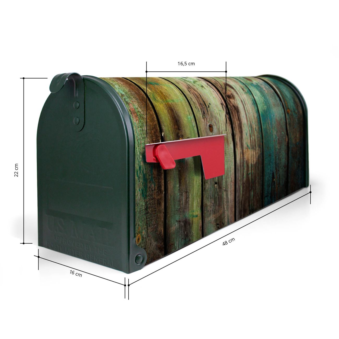 Der amerikanische Briefkasten von banjado mit Grünes Holz Motiv bietet Ihnen ausreichend Fassungsvermögen, um große A4 Sendungen und Zeitschriften zu empfangen. Die typisch amerikanische rote Fahne zeigt Ihnen an, wenn Sie Post erhalten haben. Die US-Mailbox besteht aus verzinktem Stahlblech welches lackiert wurde und ist 48 x 22 x 16 CM (BxHxT) groß. Die Folie mit Motiv Grünes Holz besteht aus einer wetter- und UV-resistenten Folie, die mit einem Schutzlaminat überzogen ist, sodass die US Mailbox zusätzlich vor Kratzern geschützt ist. An der Unterkante sind 4 Löcher je Seite um die Mailbox, typisch amerikanisch, an einem Holzpfahl oder einem Zaun zu befestigen. Auf Wunsch können Sie bei uns den passenden Standfuß oder die passende Wandhalterung kaufen um die US-Mailbox sicher zu befestigen. Wir bieten Ihnen ebenfalls Namensschilder, bereits beschriftet oder frei zu beschriften, und verschiedene selbst gestaltete Bitte-Keine-Werbung-Aufkleber.