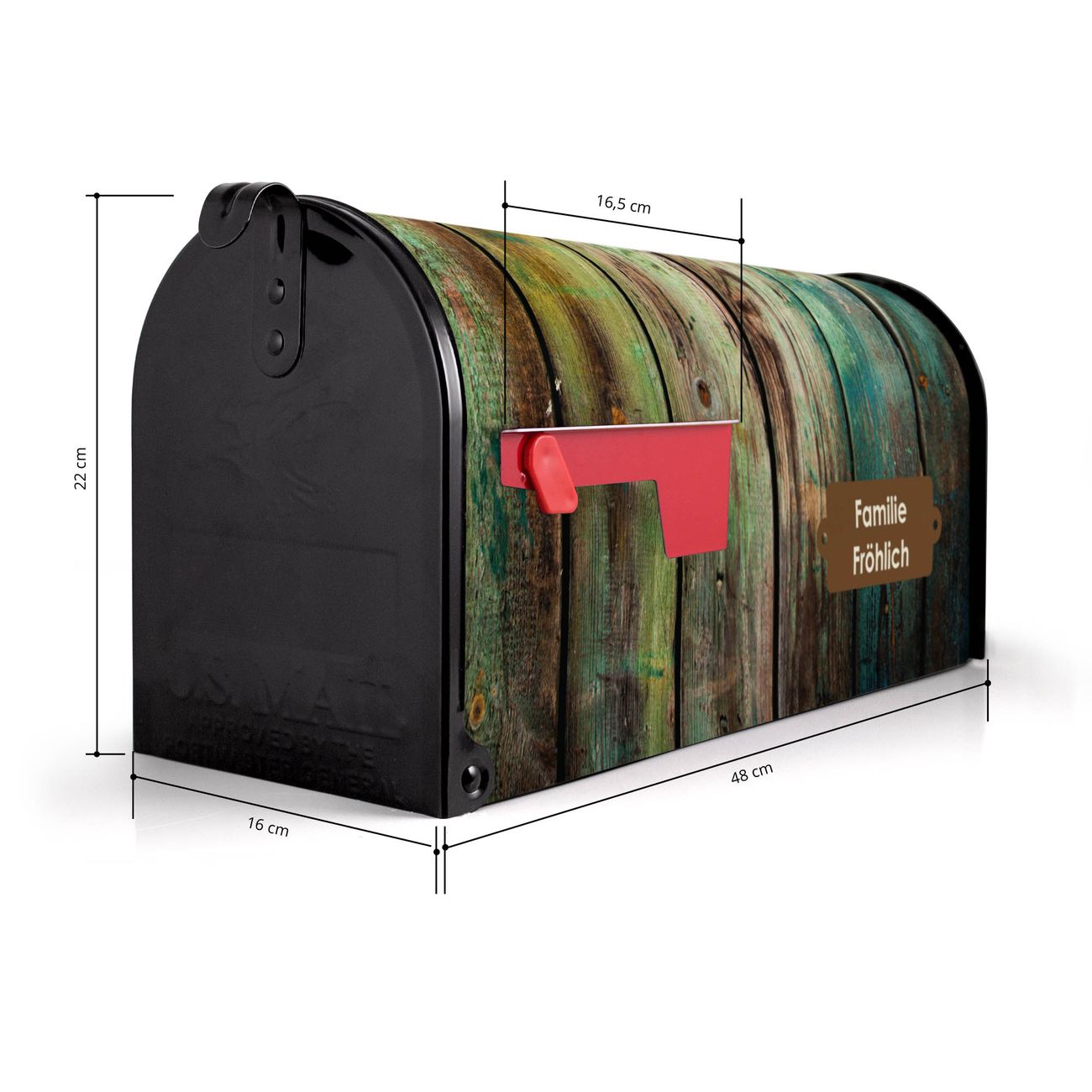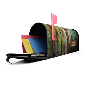 Der amerikanische Briefkasten von banjado mit Grünes Holz Motiv bietet Ihnen ausreichend Fassungsvermögen, um große A4 Sendungen und Zeitschriften zu empfangen. Die typisch amerikanische rote Fahne zeigt Ihnen an, wenn Sie Post erhalten haben. Die US-Mailbox besteht aus verzinktem Stahlblech welches lackiert wurde und ist 48 x 22 x 16 CM (BxHxT) groß. Die Folie mit Motiv Grünes Holz besteht aus einer wetter- und UV-resistenten Folie, die mit einem Schutzlaminat überzogen ist, sodass die US Mailbox zusätzlich vor Kratzern geschützt ist. An der Unterkante sind 4 Löcher je Seite um die Mailbox, typisch amerikanisch, an einem Holzpfahl oder einem Zaun zu befestigen. Auf Wunsch können Sie bei uns den passenden Standfuß oder die passende Wandhalterung kaufen um die US-Mailbox sicher zu befestigen. Wir bieten Ihnen ebenfalls Namensschilder, bereits beschriftet oder frei zu beschriften, und verschiedene selbst gestaltete Bitte-Keine-Werbung-Aufkleber.