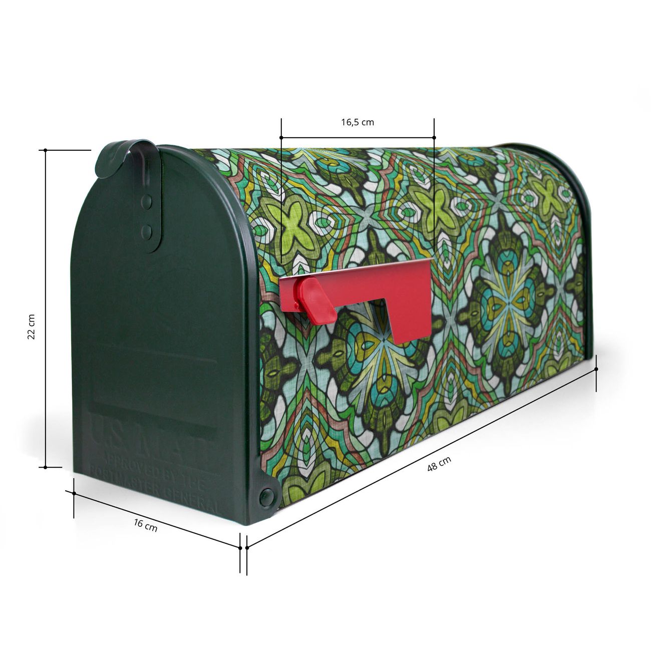 Der amerikanische Briefkasten von banjado mit Grünes Muster Motiv bietet Ihnen ausreichend Fassungsvermögen, um große A4 Sendungen und Zeitschriften zu empfangen. Die typisch amerikanische rote Fahne zeigt Ihnen an, wenn Sie Post erhalten haben. Die US-Mailbox besteht aus verzinktem Stahlblech welches lackiert wurde und ist 48 x 22 x 16 CM (BxHxT) groß. Die Folie mit Motiv Grünes Muster besteht aus einer wetter- und UV-resistenten Folie, die mit einem Schutzlaminat überzogen ist, sodass die US Mailbox zusätzlich vor Kratzern geschützt ist. An der Unterkante sind 4 Löcher je Seite um die Mailbox, typisch amerikanisch, an einem Holzpfahl oder einem Zaun zu befestigen. Auf Wunsch können Sie bei uns den passenden Standfuß oder die passende Wandhalterung kaufen um die US-Mailbox sicher zu befestigen. Wir bieten Ihnen ebenfalls Namensschilder, bereits beschriftet oder frei zu beschriften, und verschiedene selbst gestaltete Bitte-Keine-Werbung-Aufkleber.