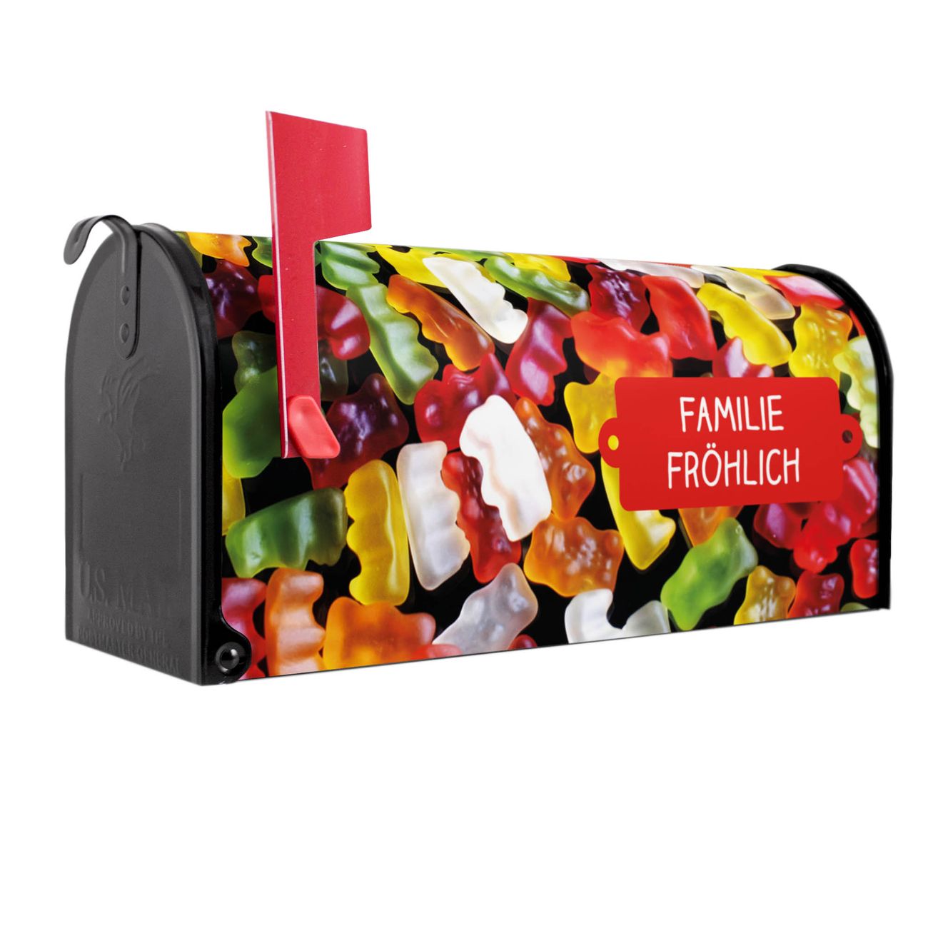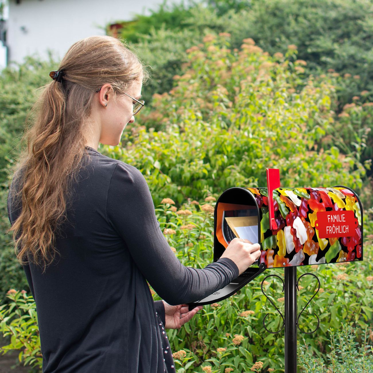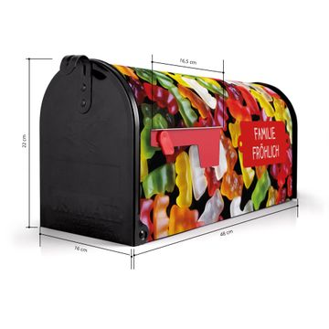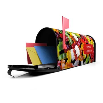 Der amerikanische Briefkasten von banjado mit Gummibaerchen Motiv bietet Ihnen ausreichend Fassungsvermögen, um große A4 Sendungen und Zeitschriften zu empfangen. Die typisch amerikanische rote Fahne zeigt Ihnen an, wenn Sie Post erhalten haben. Die US-Mailbox besteht aus verzinktem Stahlblech welches lackiert wurde und ist 48 x 22 x 16 CM (BxHxT) groß. Die Folie mit Motiv Gummibaerchen besteht aus einer wetter- und UV-resistenten Folie, die mit einem Schutzlaminat überzogen ist, sodass die US Mailbox zusätzlich vor Kratzern geschützt ist. An der Unterkante sind 4 Löcher je Seite um die Mailbox, typisch amerikanisch, an einem Holzpfahl oder einem Zaun zu befestigen. Auf Wunsch können Sie bei uns den passenden Standfuß oder die passende Wandhalterung kaufen um die US-Mailbox sicher zu befestigen. Wir bieten Ihnen ebenfalls Namensschilder, bereits beschriftet oder frei zu beschriften, und verschiedene selbst gestaltete Bitte-Keine-Werbung-Aufkleber.
