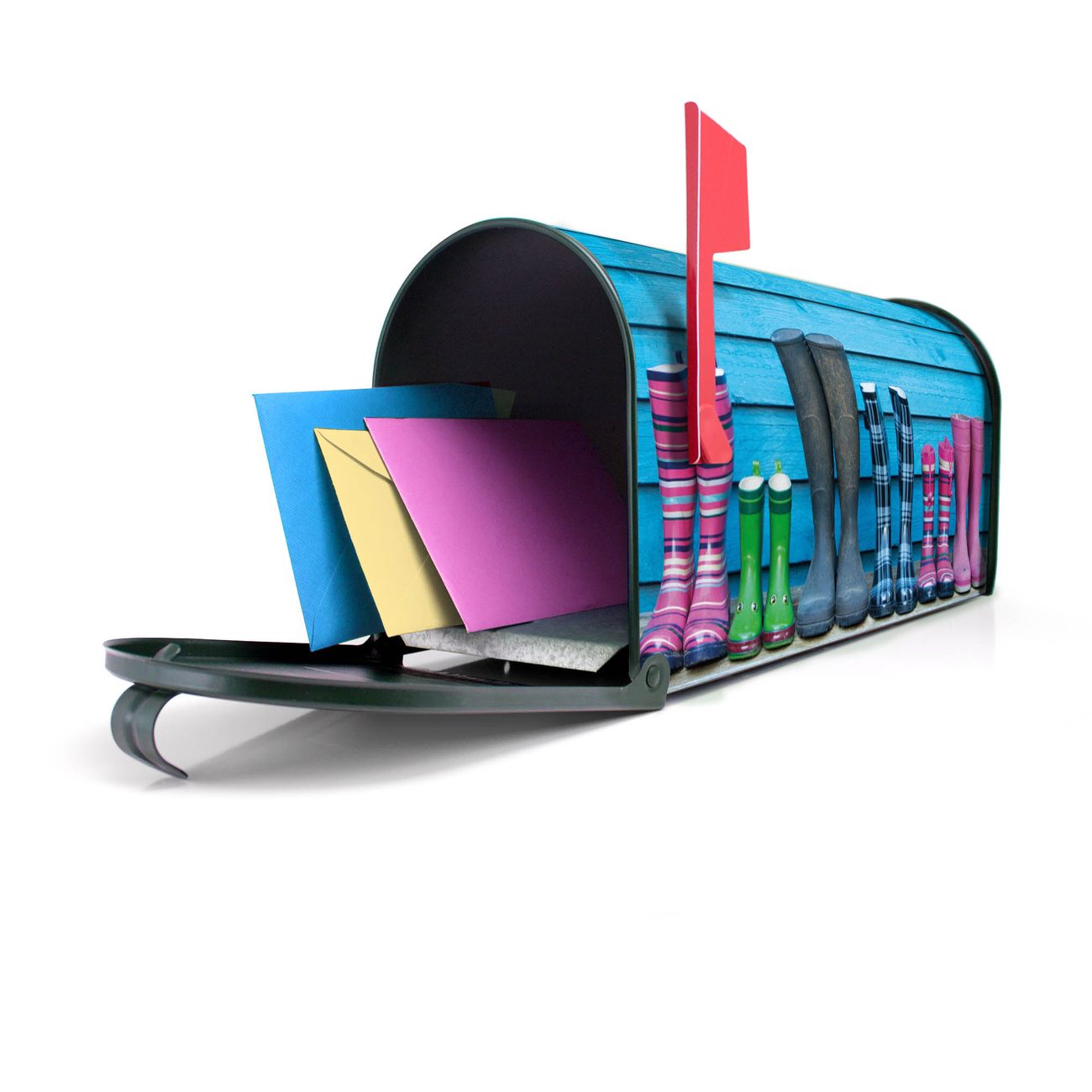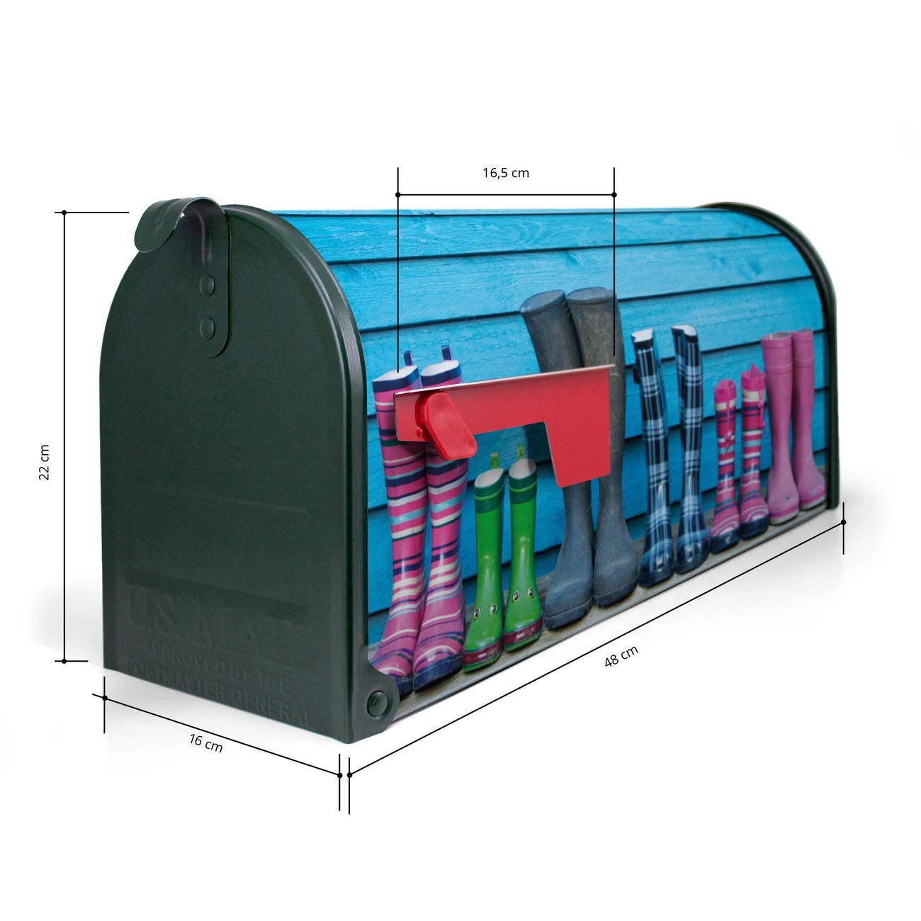 Der amerikanische Briefkasten von banjado mit Gummistiefel Motiv bietet Ihnen ausreichend Fassungsvermögen, um große A4 Sendungen und Zeitschriften zu empfangen. Die typisch amerikanische rote Fahne zeigt Ihnen an, wenn Sie Post erhalten haben. Die US-Mailbox besteht aus verzinktem Stahlblech welches lackiert wurde und ist 48 x 22 x 16 CM (BxHxT) groß. Die Folie mit Motiv Gummistiefel besteht aus einer wetter- und UV-resistenten Folie, die mit einem Schutzlaminat überzogen ist, sodass die US Mailbox zusätzlich vor Kratzern geschützt ist. An der Unterkante sind 4 Löcher je Seite um die Mailbox, typisch amerikanisch, an einem Holzpfahl oder einem Zaun zu befestigen. Auf Wunsch können Sie bei uns den passenden Standfuß oder die passende Wandhalterung kaufen um die US-Mailbox sicher zu befestigen. Wir bieten Ihnen ebenfalls Namensschilder, bereits beschriftet oder frei zu beschriften, und verschiedene selbst gestaltete Bitte-Keine-Werbung-Aufkleber.