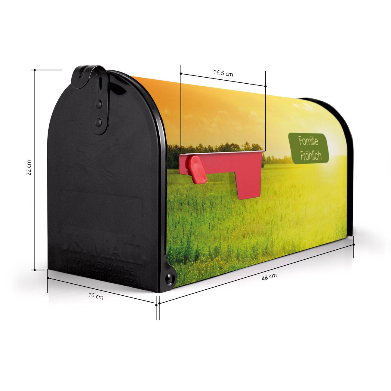 Der amerikanische Briefkasten von banjado mit Guten Morgen 2 Motiv bietet Ihnen ausreichend Fassungsvermögen, um große A4 Sendungen und Zeitschriften zu empfangen. Die typisch amerikanische rote Fahne zeigt Ihnen an, wenn Sie Post erhalten haben. Die US-Mailbox besteht aus verzinktem Stahlblech welches lackiert wurde und ist 48 x 22 x 16 CM (BxHxT) groß. Die Folie mit Motiv Guten Morgen 2 besteht aus einer wetter- und UV-resistenten Folie, die mit einem Schutzlaminat überzogen ist, sodass die US Mailbox zusätzlich vor Kratzern geschützt ist. An der Unterkante sind 4 Löcher je Seite um die Mailbox, typisch amerikanisch, an einem Holzpfahl oder einem Zaun zu befestigen. Auf Wunsch können Sie bei uns den passenden Standfuß oder die passende Wandhalterung kaufen um die US-Mailbox sicher zu befestigen. Wir bieten Ihnen ebenfalls Namensschilder, bereits beschriftet oder frei zu beschriften, und verschiedene selbst gestaltete Bitte-Keine-Werbung-Aufkleber.
