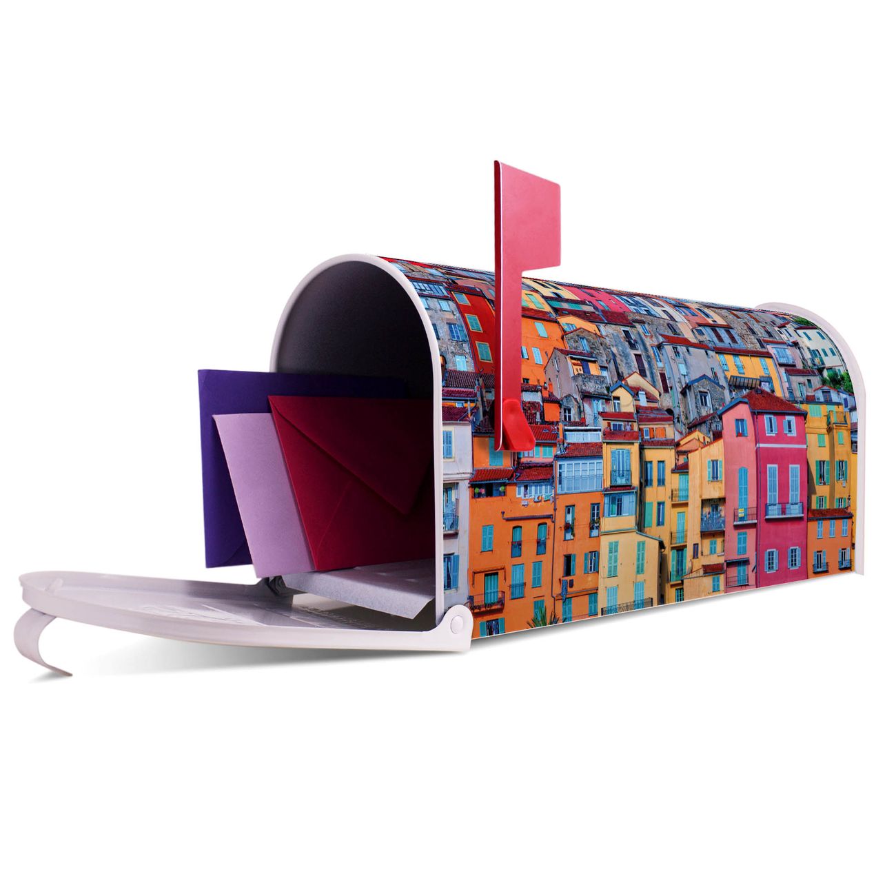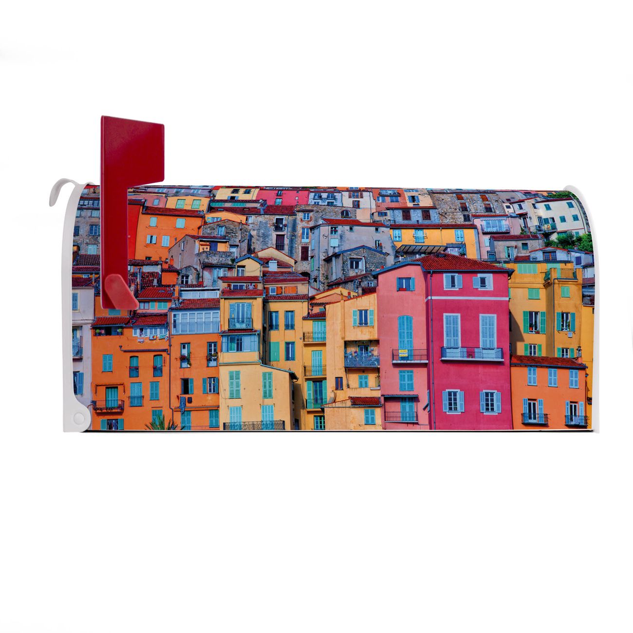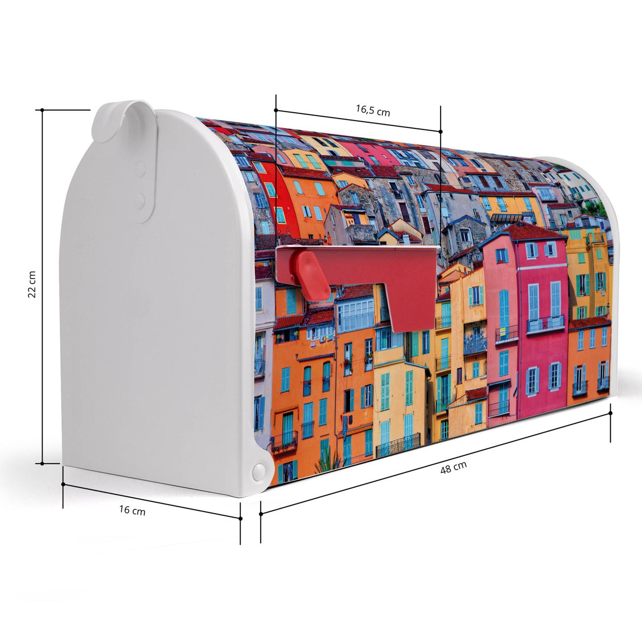 Der amerikanische Briefkasten von banjado mit Häuserberg Motiv bietet Ihnen ausreichend Fassungsvermögen, um große A4 Sendungen und Zeitschriften zu empfangen. Die typisch amerikanische rote Fahne zeigt Ihnen an, wenn Sie Post erhalten haben. Die US-Mailbox besteht aus verzinktem Stahlblech welches lackiert wurde und ist 48 x 22 x 16 CM (BxHxT) groß. Die Folie mit Motiv Häuserberg besteht aus einer wetter- und UV-resistenten Folie, die mit einem Schutzlaminat überzogen ist, sodass die US Mailbox zusätzlich vor Kratzern geschützt ist. An der Unterkante sind 4 Löcher je Seite um die Mailbox, typisch amerikanisch, an einem Holzpfahl oder einem Zaun zu befestigen. Auf Wunsch können Sie bei uns den passenden Standfuß oder die passende Wandhalterung kaufen um die US-Mailbox sicher zu befestigen. Wir bieten Ihnen ebenfalls Namensschilder, bereits beschriftet oder frei zu beschriften, und verschiedene selbst gestaltete Bitte-Keine-Werbung-Aufkleber.