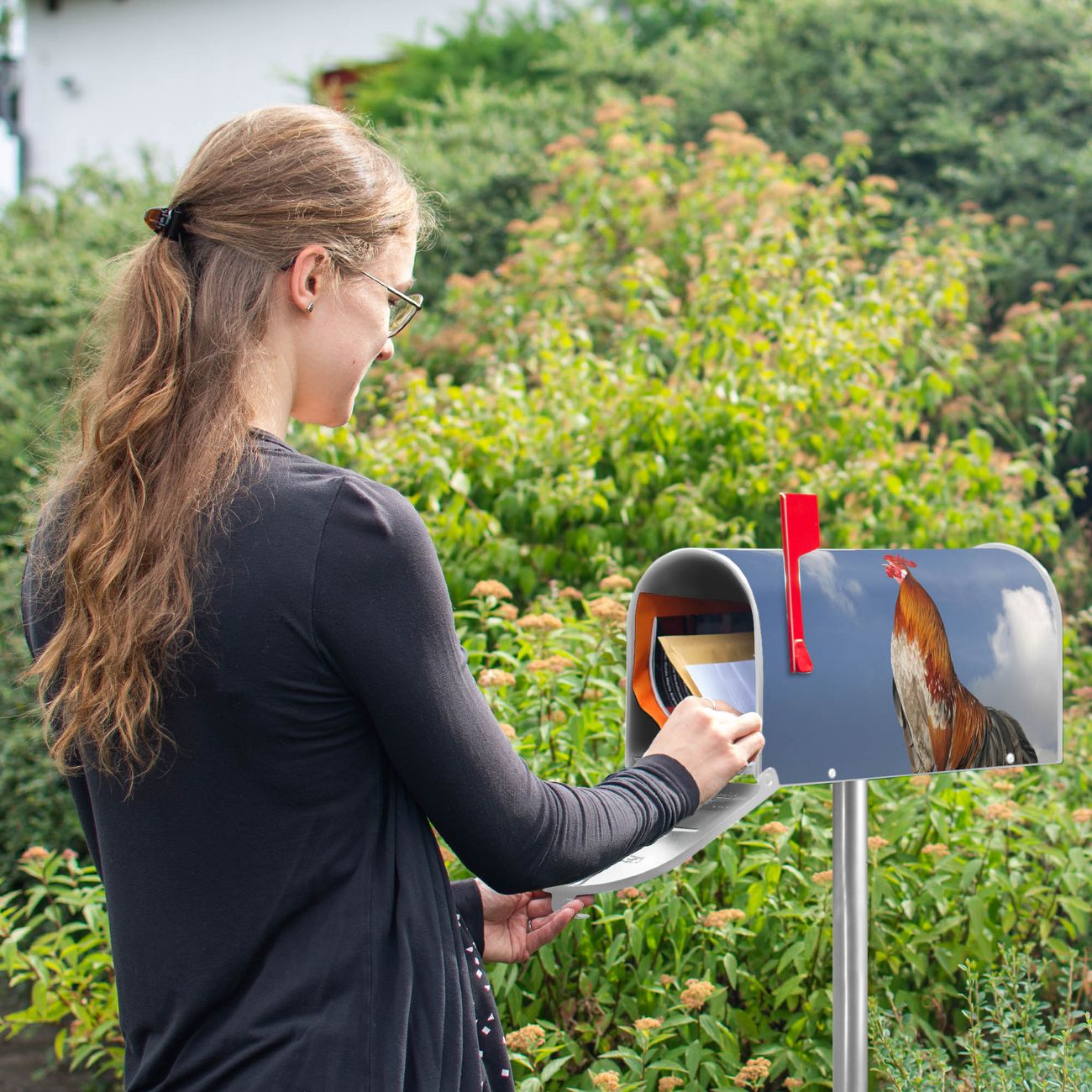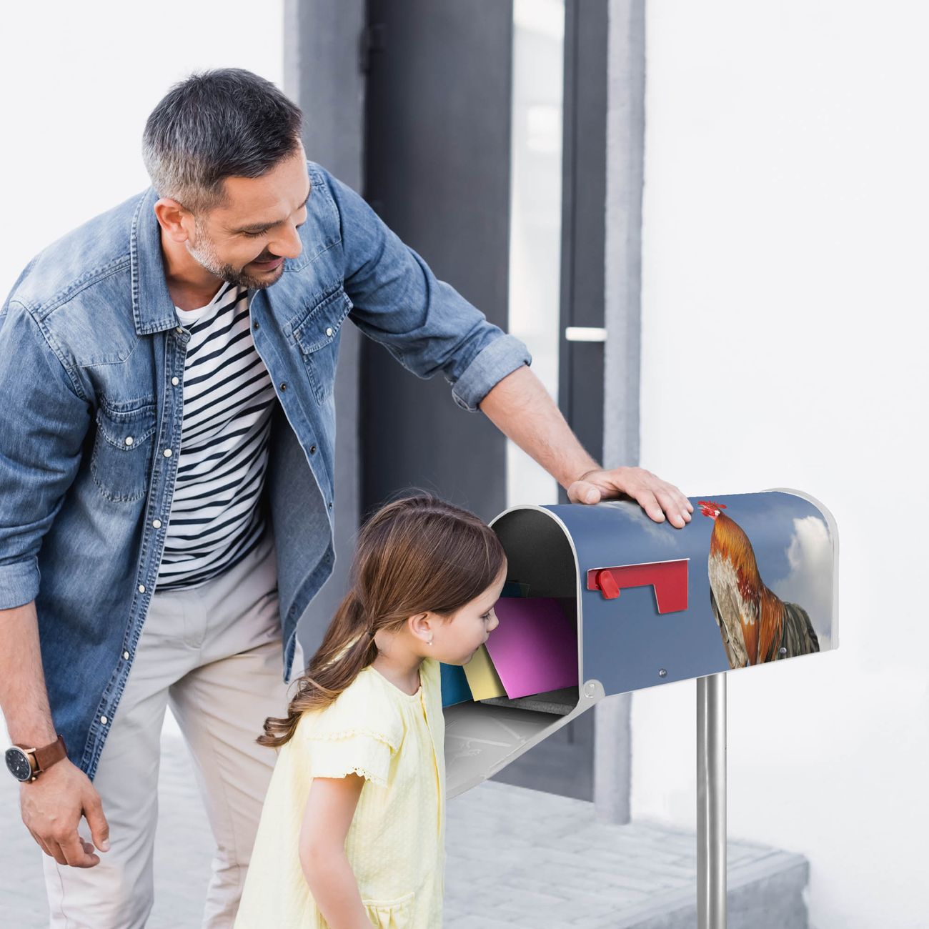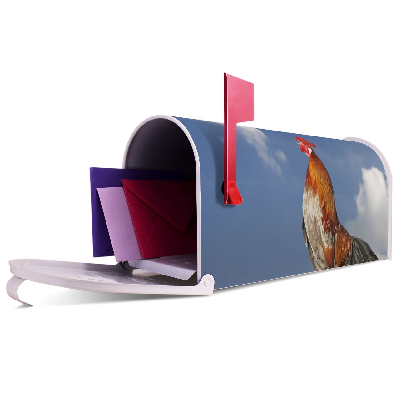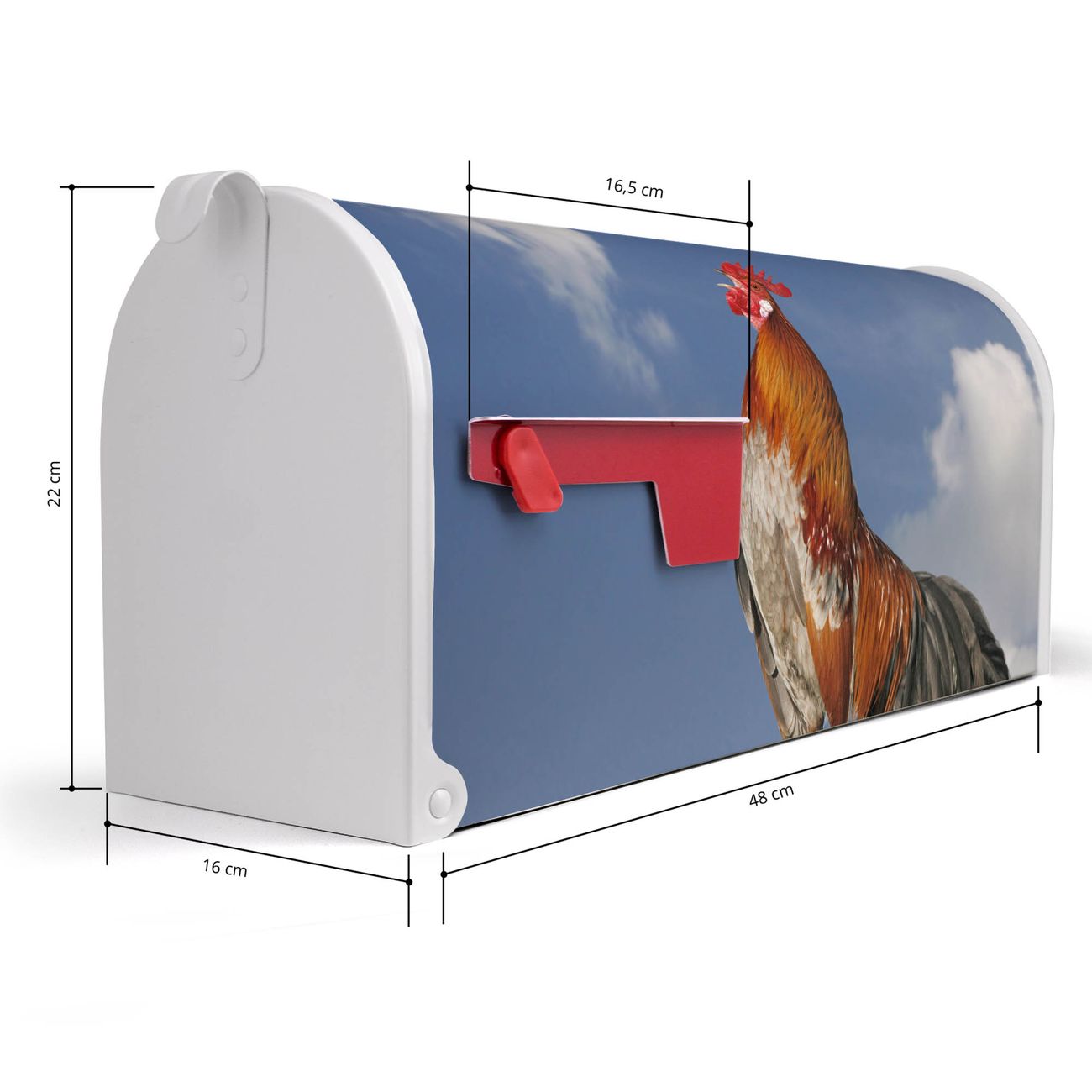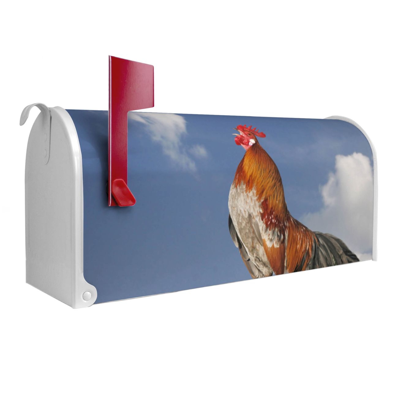 Der amerikanische Briefkasten von banjado mit Hahn Motiv bietet Ihnen ausreichend Fassungsvermögen, um große A4 Sendungen und Zeitschriften zu empfangen. Die typisch amerikanische rote Fahne zeigt Ihnen an, wenn Sie Post erhalten haben. Die US-Mailbox besteht aus verzinktem Stahlblech welches lackiert wurde und ist 48 x 22 x 16 CM (BxHxT) groß. Die Folie mit Motiv Hahn besteht aus einer wetter- und UV-resistenten Folie, die mit einem Schutzlaminat überzogen ist, sodass die US Mailbox zusätzlich vor Kratzern geschützt ist. An der Unterkante sind 4 Löcher je Seite um die Mailbox, typisch amerikanisch, an einem Holzpfahl oder einem Zaun zu befestigen. Auf Wunsch können Sie bei uns den passenden Standfuß oder die passende Wandhalterung kaufen um die US-Mailbox sicher zu befestigen. Wir bieten Ihnen ebenfalls Namensschilder, bereits beschriftet oder frei zu beschriften, und verschiedene selbst gestaltete Bitte-Keine-Werbung-Aufkleber.