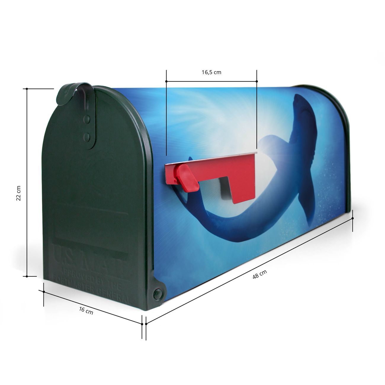 Der amerikanische Briefkasten von banjado mit Hai Motiv bietet Ihnen ausreichend Fassungsvermögen, um große A4 Sendungen und Zeitschriften zu empfangen. Die typisch amerikanische rote Fahne zeigt Ihnen an, wenn Sie Post erhalten haben. Die US-Mailbox besteht aus verzinktem Stahlblech welches lackiert wurde und ist 48 x 22 x 16 CM (BxHxT) groß. Die Folie mit Motiv Hai besteht aus einer wetter- und UV-resistenten Folie, die mit einem Schutzlaminat überzogen ist, sodass die US Mailbox zusätzlich vor Kratzern geschützt ist. An der Unterkante sind 4 Löcher je Seite um die Mailbox, typisch amerikanisch, an einem Holzpfahl oder einem Zaun zu befestigen. Auf Wunsch können Sie bei uns den passenden Standfuß oder die passende Wandhalterung kaufen um die US-Mailbox sicher zu befestigen. Wir bieten Ihnen ebenfalls Namensschilder, bereits beschriftet oder frei zu beschriften, und verschiedene selbst gestaltete Bitte-Keine-Werbung-Aufkleber.