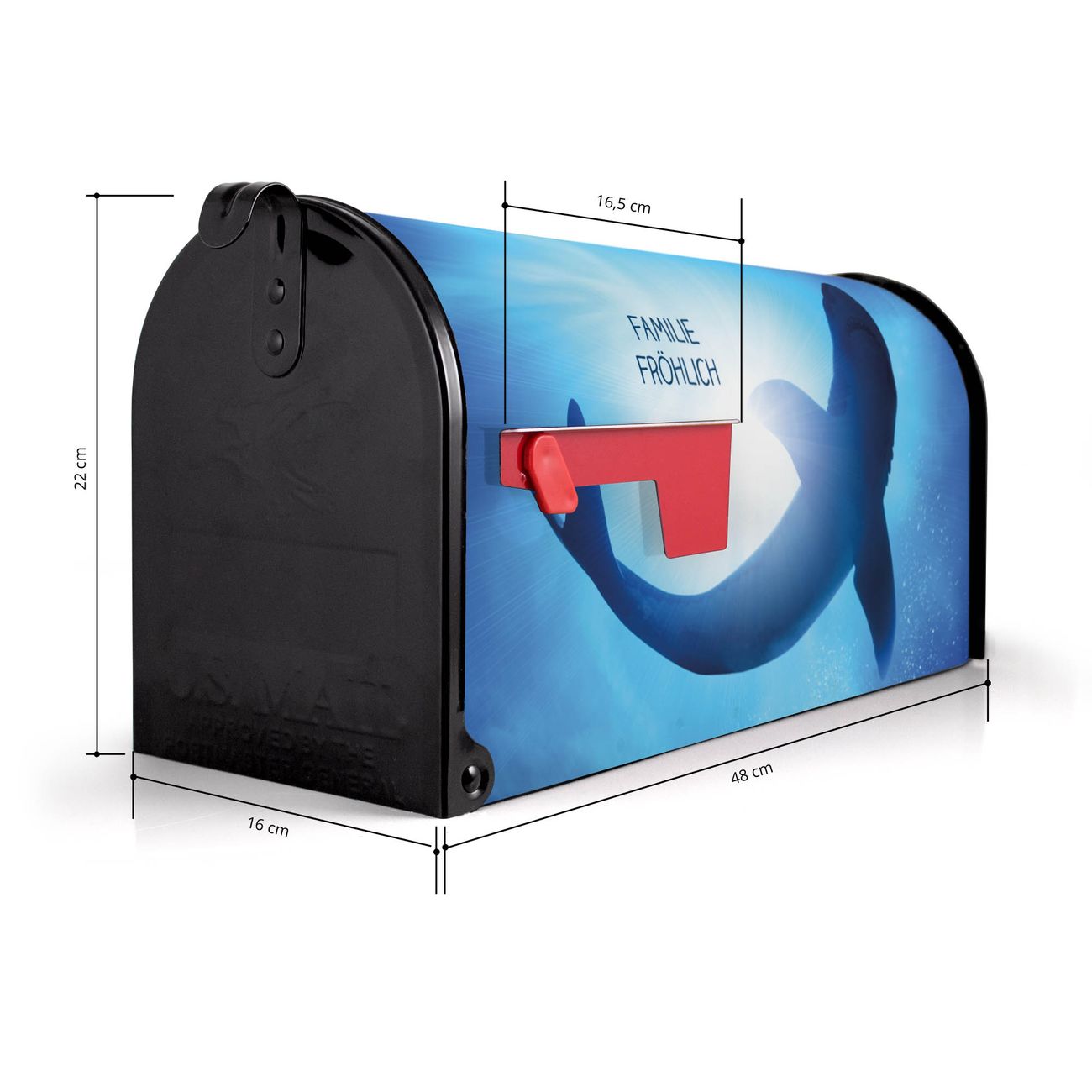 Der amerikanische Briefkasten von banjado mit Hai Motiv bietet Ihnen ausreichend Fassungsvermögen, um große A4 Sendungen und Zeitschriften zu empfangen. Die typisch amerikanische rote Fahne zeigt Ihnen an, wenn Sie Post erhalten haben. Die US-Mailbox besteht aus verzinktem Stahlblech welches lackiert wurde und ist 48 x 22 x 16 CM (BxHxT) groß. Die Folie mit Motiv Hai besteht aus einer wetter- und UV-resistenten Folie, die mit einem Schutzlaminat überzogen ist, sodass die US Mailbox zusätzlich vor Kratzern geschützt ist. An der Unterkante sind 4 Löcher je Seite um die Mailbox, typisch amerikanisch, an einem Holzpfahl oder einem Zaun zu befestigen. Auf Wunsch können Sie bei uns den passenden Standfuß oder die passende Wandhalterung kaufen um die US-Mailbox sicher zu befestigen. Wir bieten Ihnen ebenfalls Namensschilder, bereits beschriftet oder frei zu beschriften, und verschiedene selbst gestaltete Bitte-Keine-Werbung-Aufkleber.