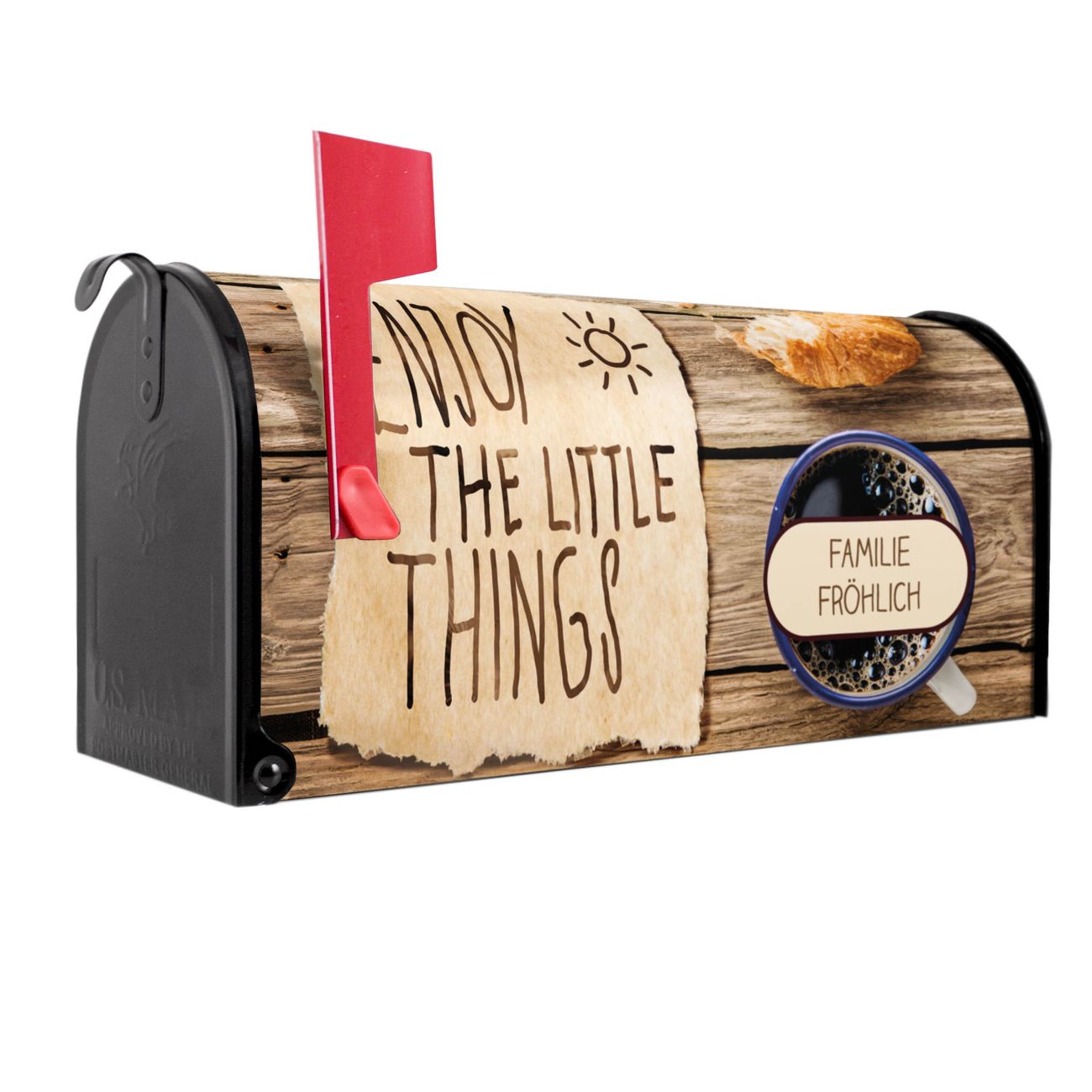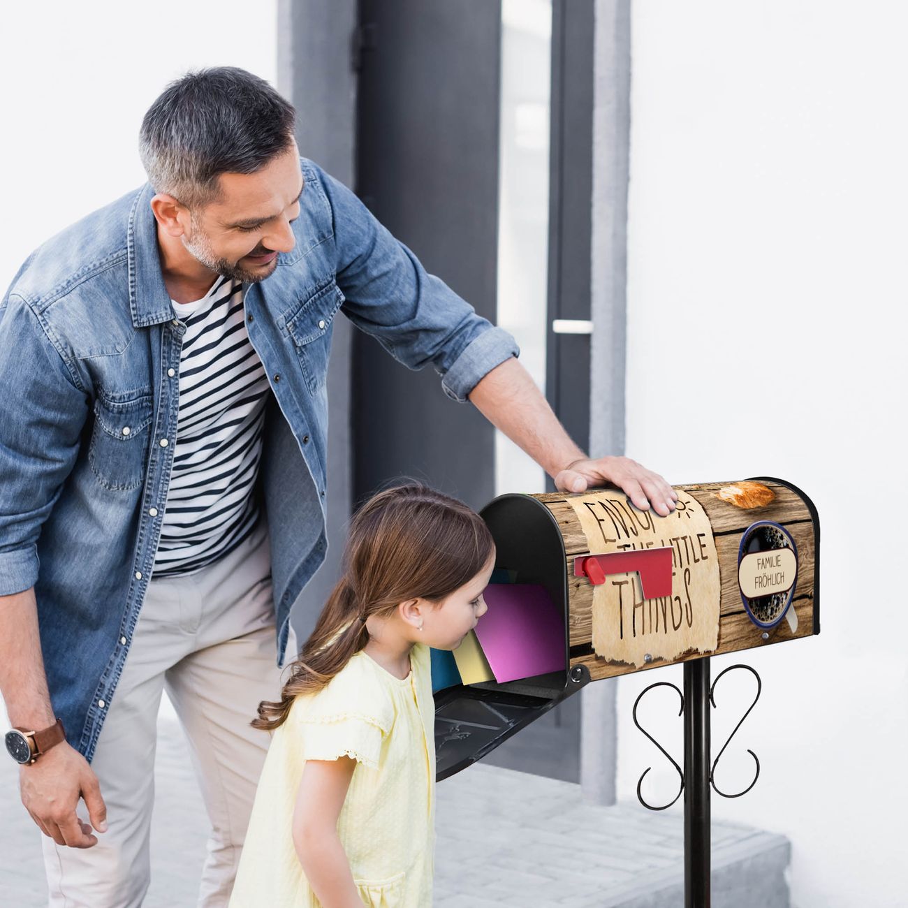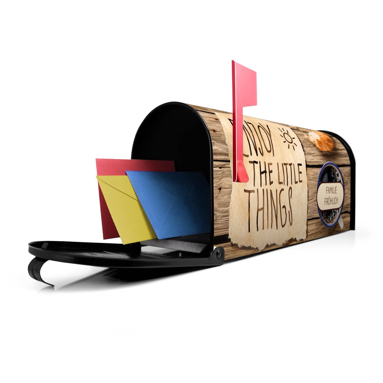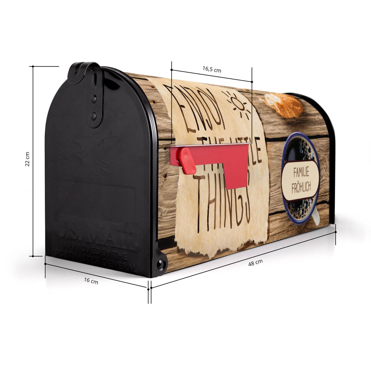 Der amerikanische Briefkasten von banjado mit Happy Day Motiv bietet Ihnen ausreichend Fassungsvermögen, um große A4 Sendungen und Zeitschriften zu empfangen. Die typisch amerikanische rote Fahne zeigt Ihnen an, wenn Sie Post erhalten haben. Die US-Mailbox besteht aus verzinktem Stahlblech welches lackiert wurde und ist 48 x 22 x 16 CM (BxHxT) groß. Die Folie mit Motiv Happy Day besteht aus einer wetter- und UV-resistenten Folie, die mit einem Schutzlaminat überzogen ist, sodass die US Mailbox zusätzlich vor Kratzern geschützt ist. An der Unterkante sind 4 Löcher je Seite um die Mailbox, typisch amerikanisch, an einem Holzpfahl oder einem Zaun zu befestigen. Auf Wunsch können Sie bei uns den passenden Standfuß oder die passende Wandhalterung kaufen um die US-Mailbox sicher zu befestigen. Wir bieten Ihnen ebenfalls Namensschilder, bereits beschriftet oder frei zu beschriften, und verschiedene selbst gestaltete Bitte-Keine-Werbung-Aufkleber.