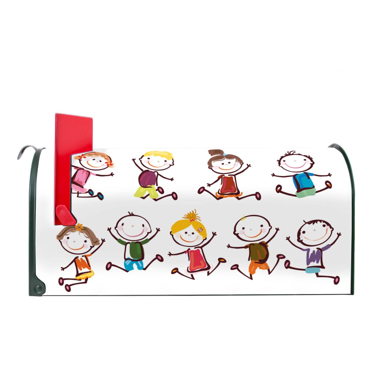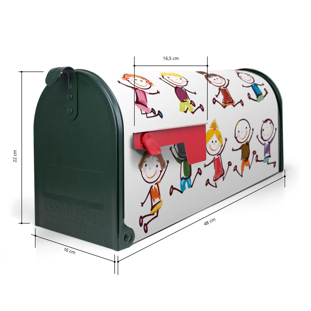 Der amerikanische Briefkasten von banjado mit Happy Kids Motiv bietet Ihnen ausreichend Fassungsvermögen, um große A4 Sendungen und Zeitschriften zu empfangen. Die typisch amerikanische rote Fahne zeigt Ihnen an, wenn Sie Post erhalten haben. Die US-Mailbox besteht aus verzinktem Stahlblech welches lackiert wurde und ist 48 x 22 x 16 CM (BxHxT) groß. Die Folie mit Motiv Happy Kids besteht aus einer wetter- und UV-resistenten Folie, die mit einem Schutzlaminat überzogen ist, sodass die US Mailbox zusätzlich vor Kratzern geschützt ist. An der Unterkante sind 4 Löcher je Seite um die Mailbox, typisch amerikanisch, an einem Holzpfahl oder einem Zaun zu befestigen. Auf Wunsch können Sie bei uns den passenden Standfuß oder die passende Wandhalterung kaufen um die US-Mailbox sicher zu befestigen. Wir bieten Ihnen ebenfalls Namensschilder, bereits beschriftet oder frei zu beschriften, und verschiedene selbst gestaltete Bitte-Keine-Werbung-Aufkleber.