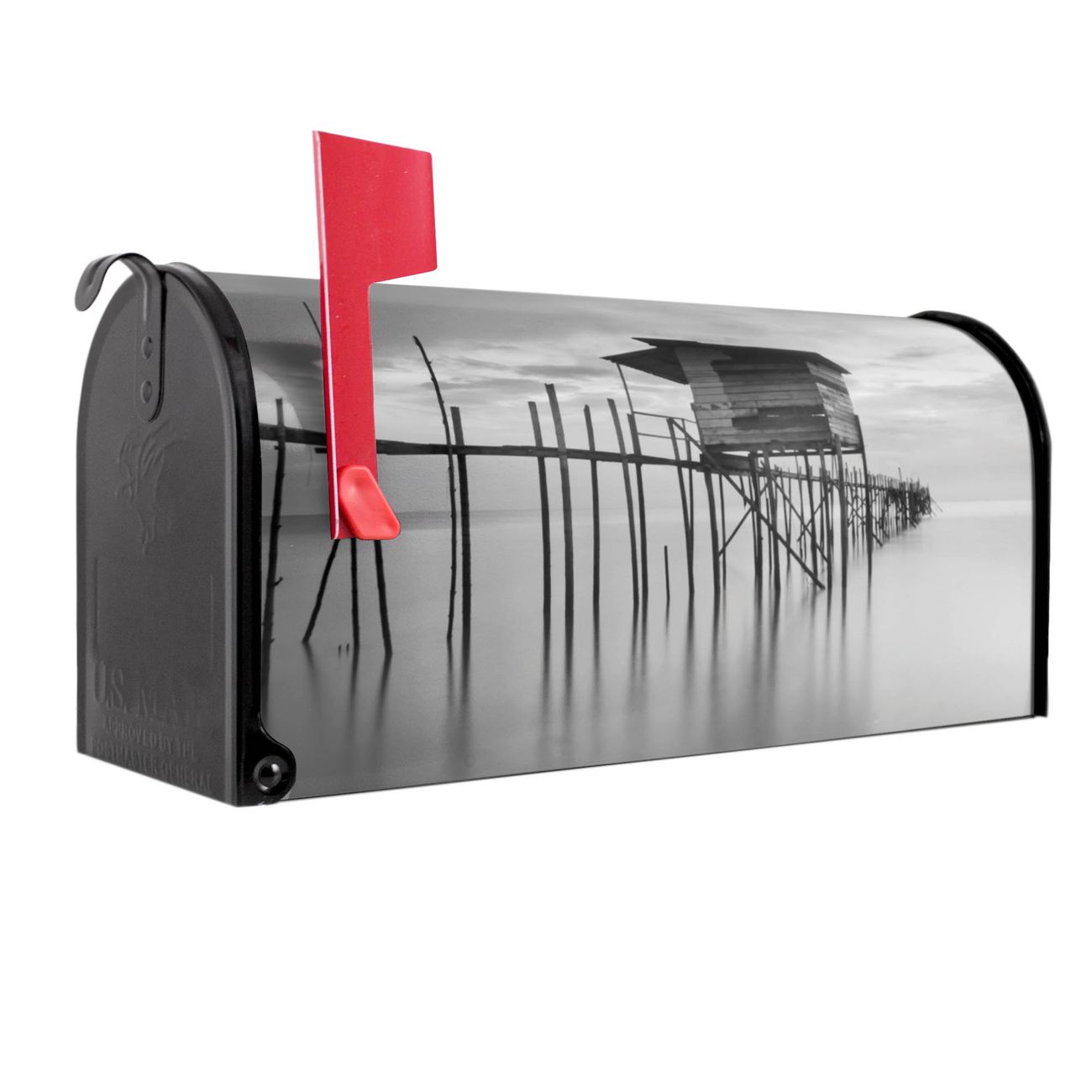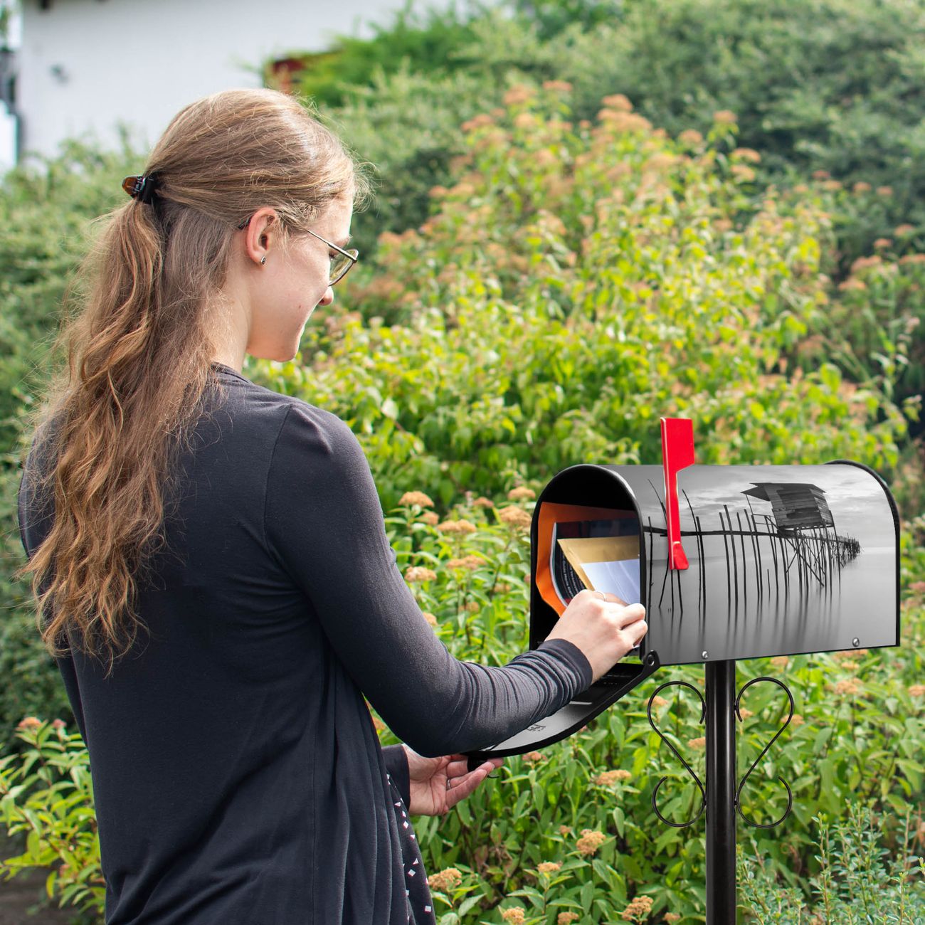 Der amerikanische Briefkasten von banjado mit Haus am See Motiv bietet Ihnen ausreichend Fassungsvermögen, um große A4 Sendungen und Zeitschriften zu empfangen. Die typisch amerikanische rote Fahne zeigt Ihnen an, wenn Sie Post erhalten haben. Die US-Mailbox besteht aus verzinktem Stahlblech welches lackiert wurde und ist 48 x 22 x 16 CM (BxHxT) groß. Die Folie mit Motiv Haus am See besteht aus einer wetter- und UV-resistenten Folie, die mit einem Schutzlaminat überzogen ist, sodass die US Mailbox zusätzlich vor Kratzern geschützt ist. An der Unterkante sind 4 Löcher je Seite um die Mailbox, typisch amerikanisch, an einem Holzpfahl oder einem Zaun zu befestigen. Auf Wunsch können Sie bei uns den passenden Standfuß oder die passende Wandhalterung kaufen um die US-Mailbox sicher zu befestigen. Wir bieten Ihnen ebenfalls Namensschilder, bereits beschriftet oder frei zu beschriften, und verschiedene selbst gestaltete Bitte-Keine-Werbung-Aufkleber.
