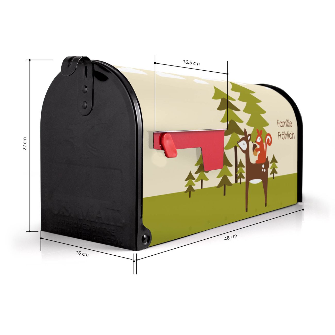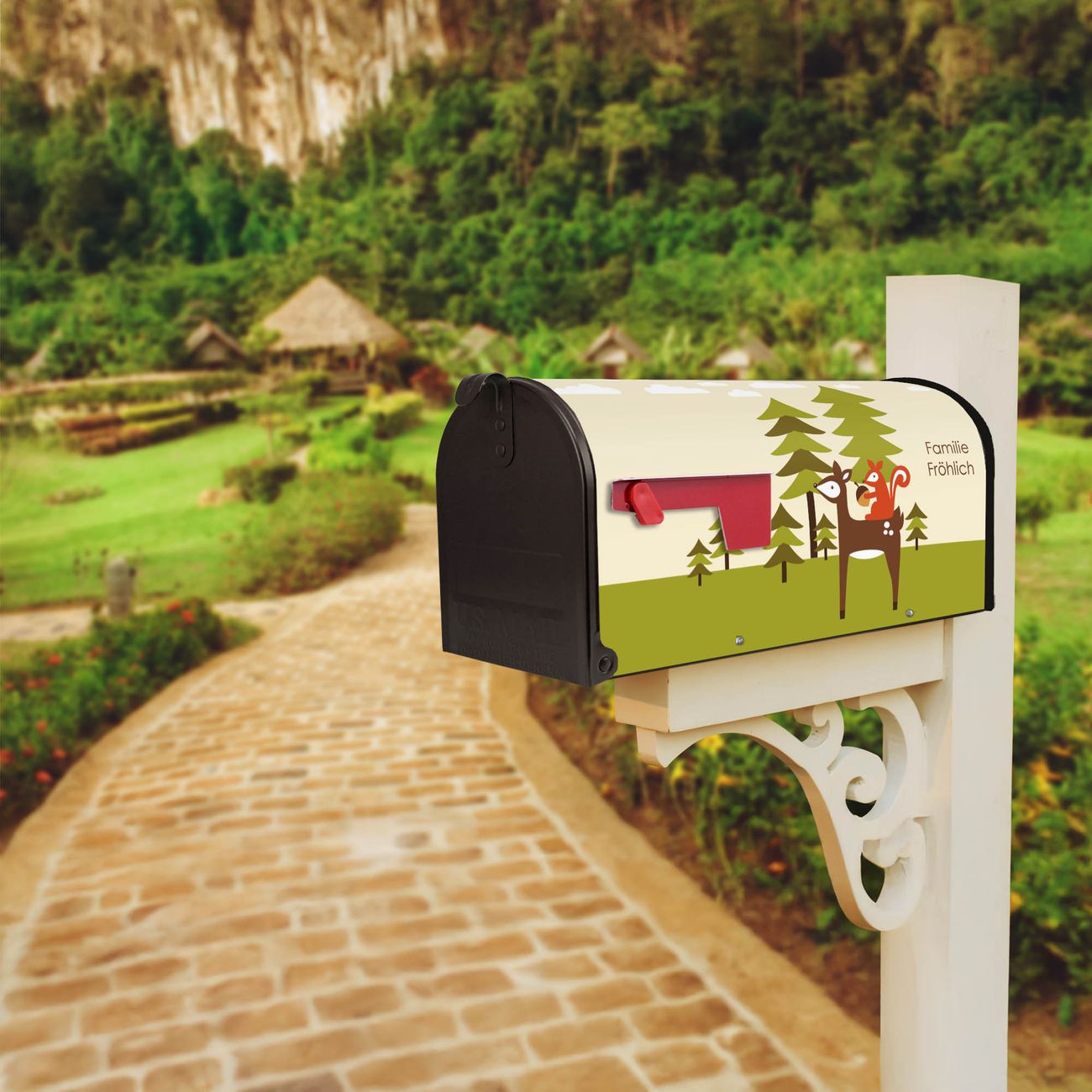 Der amerikanische Briefkasten von banjado mit Heimweg Motiv bietet Ihnen ausreichend Fassungsvermögen, um große A4 Sendungen und Zeitschriften zu empfangen. Die typisch amerikanische rote Fahne zeigt Ihnen an, wenn Sie Post erhalten haben. Die US-Mailbox besteht aus verzinktem Stahlblech welches lackiert wurde und ist 48 x 22 x 16 CM (BxHxT) groß. Die Folie mit Motiv Heimweg besteht aus einer wetter- und UV-resistenten Folie, die mit einem Schutzlaminat überzogen ist, sodass die US Mailbox zusätzlich vor Kratzern geschützt ist. An der Unterkante sind 4 Löcher je Seite um die Mailbox, typisch amerikanisch, an einem Holzpfahl oder einem Zaun zu befestigen. Auf Wunsch können Sie bei uns den passenden Standfuß oder die passende Wandhalterung kaufen um die US-Mailbox sicher zu befestigen. Wir bieten Ihnen ebenfalls Namensschilder, bereits beschriftet oder frei zu beschriften, und verschiedene selbst gestaltete Bitte-Keine-Werbung-Aufkleber.