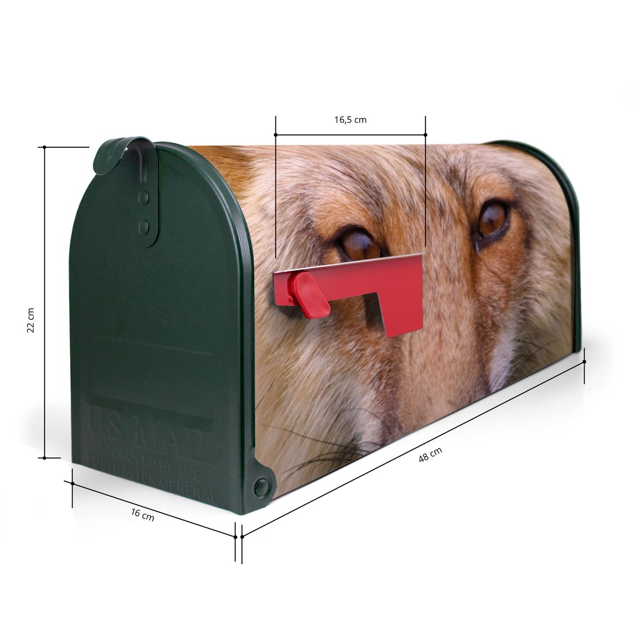 Der amerikanische Briefkasten von banjado mit Henryk Motiv bietet Ihnen ausreichend Fassungsvermögen, um große A4 Sendungen und Zeitschriften zu empfangen. Die typisch amerikanische rote Fahne zeigt Ihnen an, wenn Sie Post erhalten haben. Die US-Mailbox besteht aus verzinktem Stahlblech welches lackiert wurde und ist 48 x 22 x 16 CM (BxHxT) groß. Die Folie mit Motiv Henryk besteht aus einer wetter- und UV-resistenten Folie, die mit einem Schutzlaminat überzogen ist, sodass die US Mailbox zusätzlich vor Kratzern geschützt ist. An der Unterkante sind 4 Löcher je Seite um die Mailbox, typisch amerikanisch, an einem Holzpfahl oder einem Zaun zu befestigen. Auf Wunsch können Sie bei uns den passenden Standfuß oder die passende Wandhalterung kaufen um die US-Mailbox sicher zu befestigen. Wir bieten Ihnen ebenfalls Namensschilder, bereits beschriftet oder frei zu beschriften, und verschiedene selbst gestaltete Bitte-Keine-Werbung-Aufkleber.