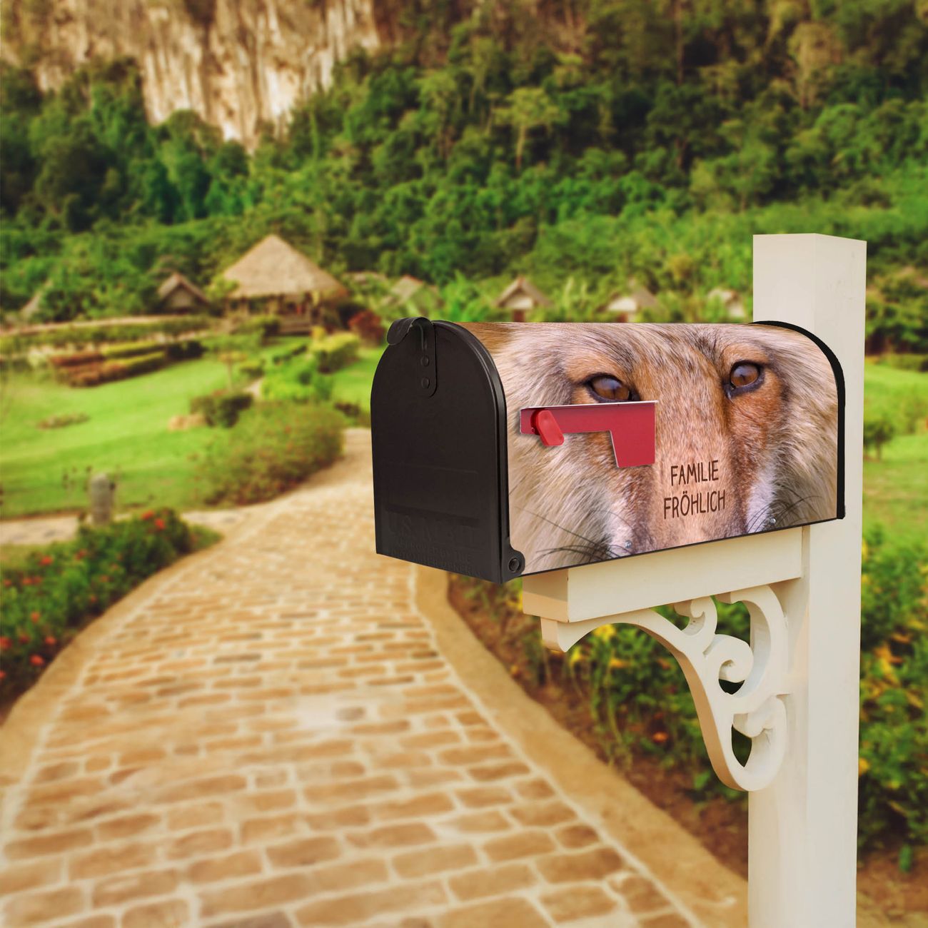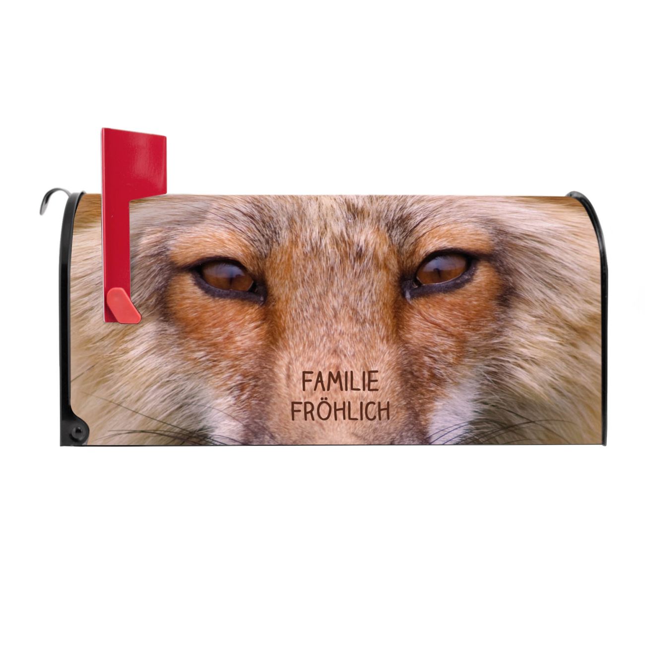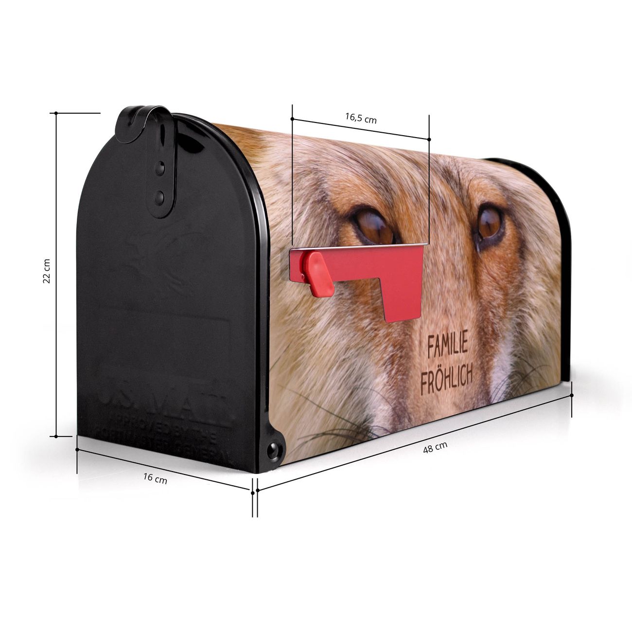 Der amerikanische Briefkasten von banjado mit Henryk Motiv bietet Ihnen ausreichend Fassungsvermögen, um große A4 Sendungen und Zeitschriften zu empfangen. Die typisch amerikanische rote Fahne zeigt Ihnen an, wenn Sie Post erhalten haben. Die US-Mailbox besteht aus verzinktem Stahlblech welches lackiert wurde und ist 48 x 22 x 16 CM (BxHxT) groß. Die Folie mit Motiv Henryk besteht aus einer wetter- und UV-resistenten Folie, die mit einem Schutzlaminat überzogen ist, sodass die US Mailbox zusätzlich vor Kratzern geschützt ist. An der Unterkante sind 4 Löcher je Seite um die Mailbox, typisch amerikanisch, an einem Holzpfahl oder einem Zaun zu befestigen. Auf Wunsch können Sie bei uns den passenden Standfuß oder die passende Wandhalterung kaufen um die US-Mailbox sicher zu befestigen. Wir bieten Ihnen ebenfalls Namensschilder, bereits beschriftet oder frei zu beschriften, und verschiedene selbst gestaltete Bitte-Keine-Werbung-Aufkleber.