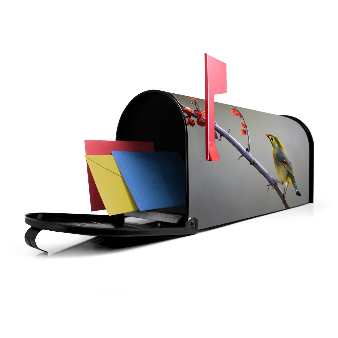 Der amerikanische Briefkasten von banjado mit Herbst Vogel Motiv bietet Ihnen ausreichend Fassungsvermögen, um große A4 Sendungen und Zeitschriften zu empfangen. Die typisch amerikanische rote Fahne zeigt Ihnen an, wenn Sie Post erhalten haben. Die US-Mailbox besteht aus verzinktem Stahlblech welches lackiert wurde und ist 48 x 22 x 16 CM (BxHxT) groß. Die Folie mit Motiv Herbst Vogel besteht aus einer wetter- und UV-resistenten Folie, die mit einem Schutzlaminat überzogen ist, sodass die US Mailbox zusätzlich vor Kratzern geschützt ist. An der Unterkante sind 4 Löcher je Seite um die Mailbox, typisch amerikanisch, an einem Holzpfahl oder einem Zaun zu befestigen. Auf Wunsch können Sie bei uns den passenden Standfuß oder die passende Wandhalterung kaufen um die US-Mailbox sicher zu befestigen. Wir bieten Ihnen ebenfalls Namensschilder, bereits beschriftet oder frei zu beschriften, und verschiedene selbst gestaltete Bitte-Keine-Werbung-Aufkleber.