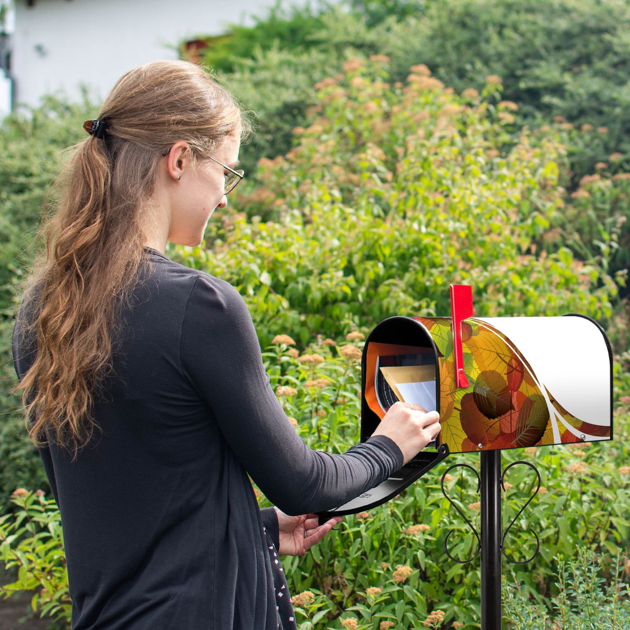 Der amerikanische Briefkasten von banjado mit Herbstlaub Motiv bietet Ihnen ausreichend Fassungsvermögen, um große A4 Sendungen und Zeitschriften zu empfangen. Die typisch amerikanische rote Fahne zeigt Ihnen an, wenn Sie Post erhalten haben. Die US-Mailbox besteht aus verzinktem Stahlblech welches lackiert wurde und ist 48 x 22 x 16 CM (BxHxT) groß. Die Folie mit Motiv Herbstlaub besteht aus einer wetter- und UV-resistenten Folie, die mit einem Schutzlaminat überzogen ist, sodass die US Mailbox zusätzlich vor Kratzern geschützt ist. An der Unterkante sind 4 Löcher je Seite um die Mailbox, typisch amerikanisch, an einem Holzpfahl oder einem Zaun zu befestigen. Auf Wunsch können Sie bei uns den passenden Standfuß oder die passende Wandhalterung kaufen um die US-Mailbox sicher zu befestigen. Wir bieten Ihnen ebenfalls Namensschilder, bereits beschriftet oder frei zu beschriften, und verschiedene selbst gestaltete Bitte-Keine-Werbung-Aufkleber.