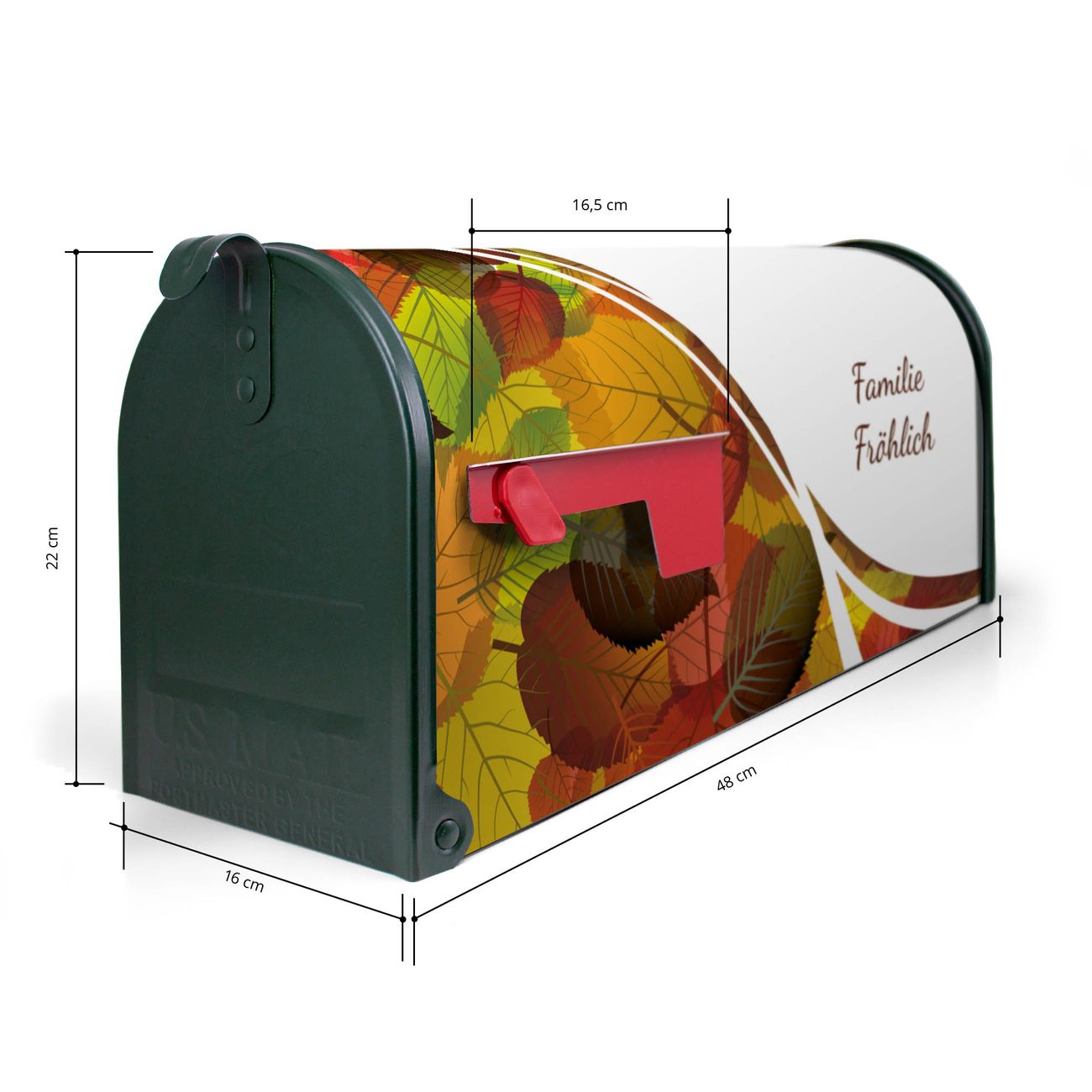 Der amerikanische Briefkasten von banjado mit WT Herbstlaub Motiv bietet Ihnen ausreichend Fassungsvermögen, um große A4 Sendungen und Zeitschriften zu empfangen. Die typisch amerikanische rote Fahne zeigt Ihnen an, wenn Sie Post erhalten haben. Die US-Mailbox besteht aus verzinktem Stahlblech welches lackiert wurde und ist 48 x 22 x 16 CM (BxHxT) groß. Die Folie mit Motiv WT Herbstlaub besteht aus einer wetter- und UV-resistenten Folie, die mit einem Schutzlaminat überzogen ist, sodass die US Mailbox zusätzlich vor Kratzern geschützt ist. An der Unterkante sind 4 Löcher je Seite um die Mailbox, typisch amerikanisch, an einem Holzpfahl oder einem Zaun zu befestigen. Auf Wunsch können Sie bei uns den passenden Standfuß oder die passende Wandhalterung kaufen um die US-Mailbox sicher zu befestigen. Wir bieten Ihnen ebenfalls Namensschilder, bereits beschriftet oder frei zu beschriften, und verschiedene selbst gestaltete Bitte-Keine-Werbung-Aufkleber.