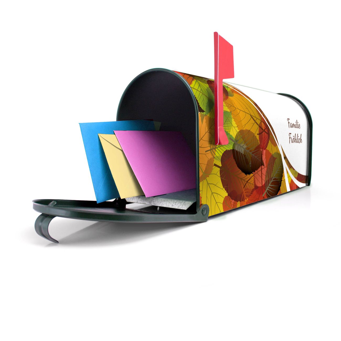 Unser amerikanischer Briefkasten mit dem Motiv WT Herbstlaub hat ein sehr ansprechendes und ausgefallenes Design, ist in der Grundfarbe weiß, grün oder schwarz erhältlich. Damit entlocken Sie Ihren Nachbarn und dem Postboten immer wieder ein Lächeln. Die Mailbox ist ein Original Import aus Mississippi USA und wird von unserer kleinen Manufaktur in Sachsen von Hand veredelt. Die US-Mailbox bietet ausreichend Platz auch für große Sendungen, eine Fahne die Ihnen Post anzeigt, wetterfestes und äußerst stabiles Material - so macht Post empfangen Freude.