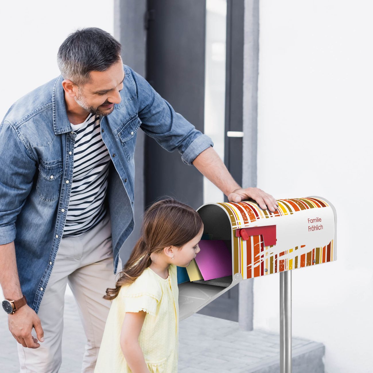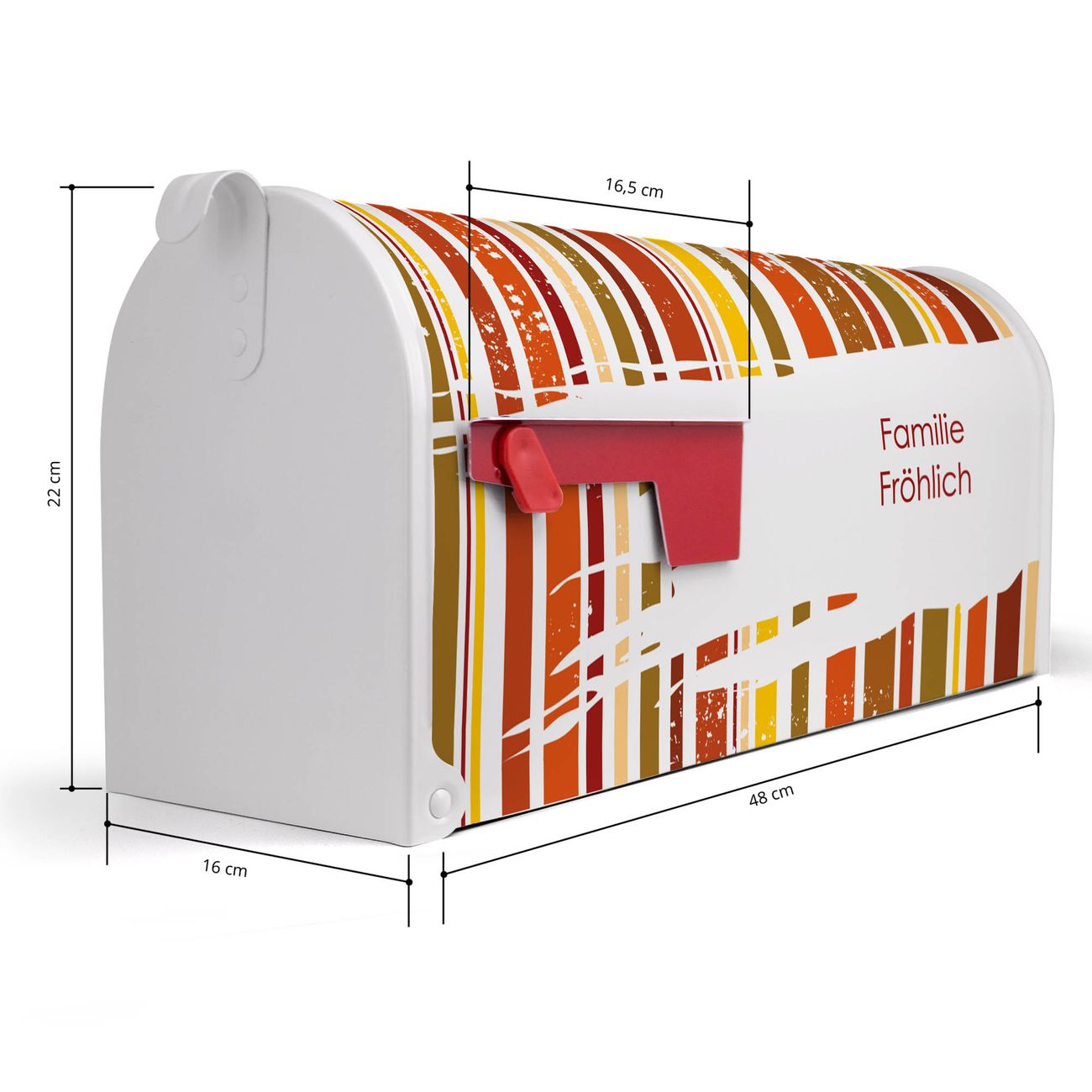 Unser amerikanischer Briefkasten mit dem Motiv WT Herbststreifen hat ein sehr ansprechendes und ausgefallenes Design, ist in der Grundfarbe weiß, grün oder schwarz erhältlich. Damit entlocken Sie Ihren Nachbarn und dem Postboten immer wieder ein Lächeln. Die Mailbox ist ein Original Import aus Mississippi USA und wird von unserer kleinen Manufaktur in Sachsen von Hand veredelt. Die US-Mailbox bietet ausreichend Platz auch für große Sendungen, eine Fahne die Ihnen Post anzeigt, wetterfestes und äußerst stabiles Material - so macht Post empfangen Freude.