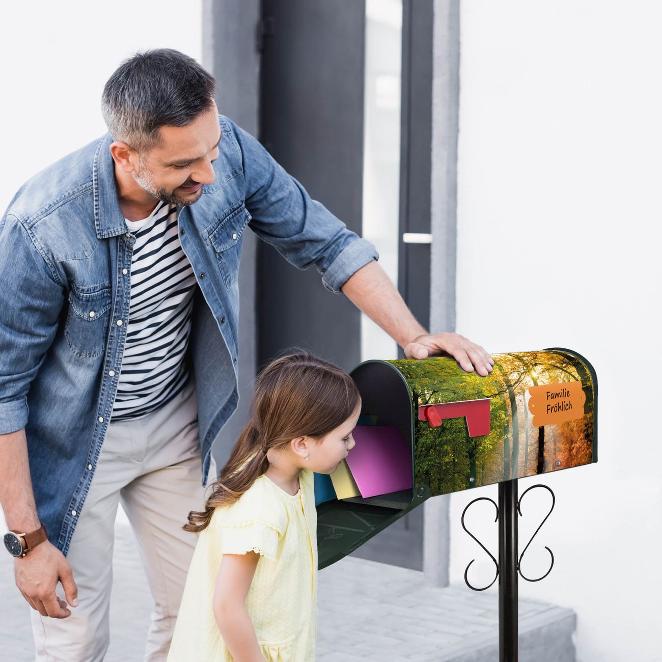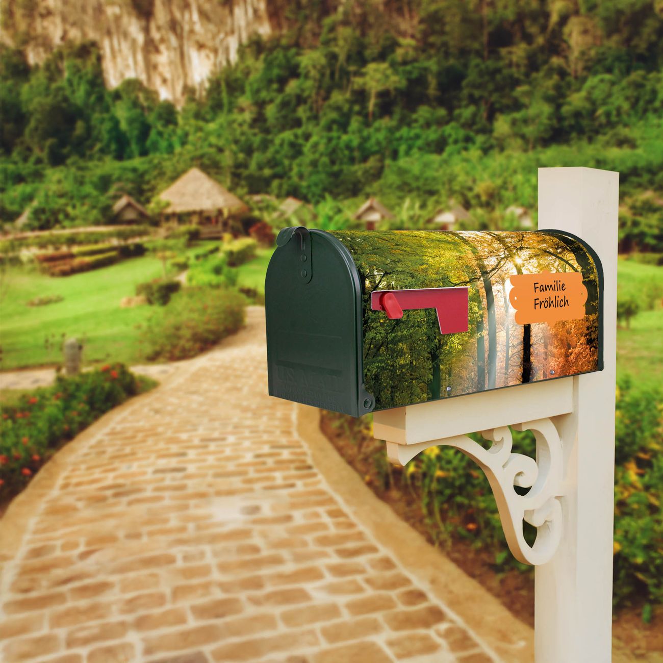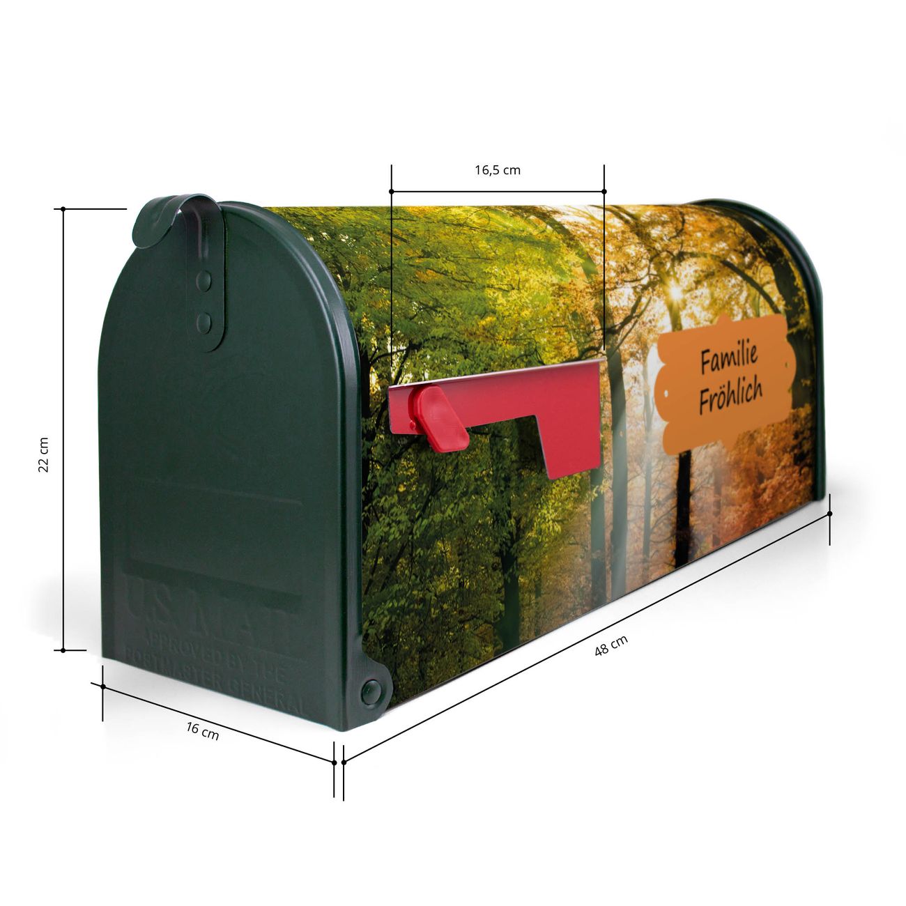Der amerikanische Briefkasten von banjado mit Herbstwald Motiv bietet Ihnen ausreichend Fassungsvermögen, um große A4 Sendungen und Zeitschriften zu empfangen. Die typisch amerikanische rote Fahne zeigt Ihnen an, wenn Sie Post erhalten haben. Die US-Mailbox besteht aus verzinktem Stahlblech welches lackiert wurde und ist 48 x 22 x 16 CM (BxHxT) groß. Die Folie mit Motiv Herbstwald besteht aus einer wetter- und UV-resistenten Folie, die mit einem Schutzlaminat überzogen ist, sodass die US Mailbox zusätzlich vor Kratzern geschützt ist. An der Unterkante sind 4 Löcher je Seite um die Mailbox, typisch amerikanisch, an einem Holzpfahl oder einem Zaun zu befestigen. Auf Wunsch können Sie bei uns den passenden Standfuß oder die passende Wandhalterung kaufen um die US-Mailbox sicher zu befestigen. Wir bieten Ihnen ebenfalls Namensschilder, bereits beschriftet oder frei zu beschriften, und verschiedene selbst gestaltete Bitte-Keine-Werbung-Aufkleber.