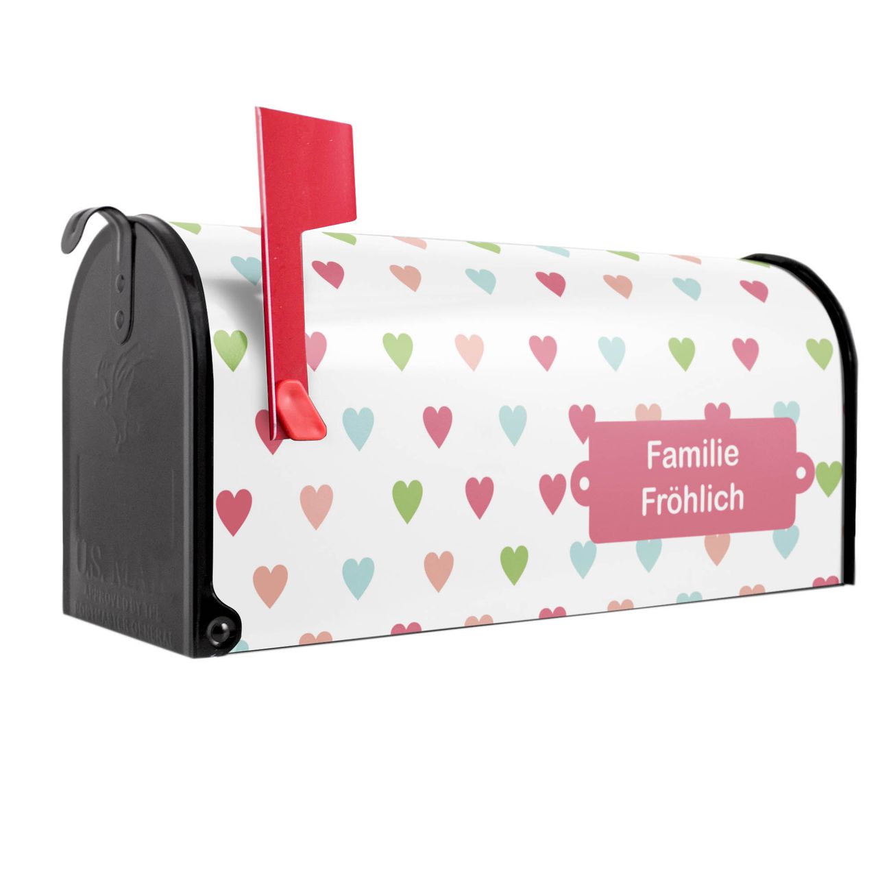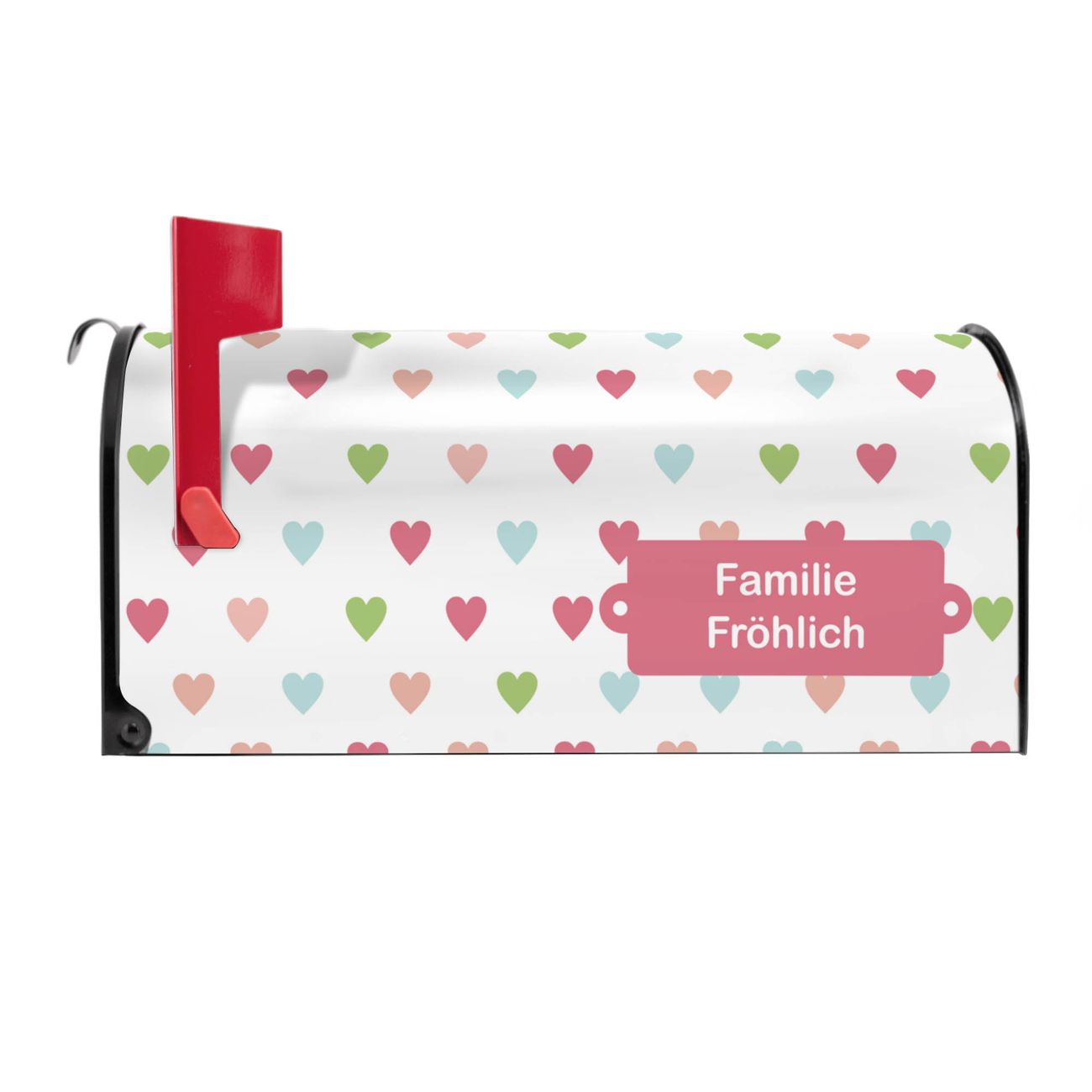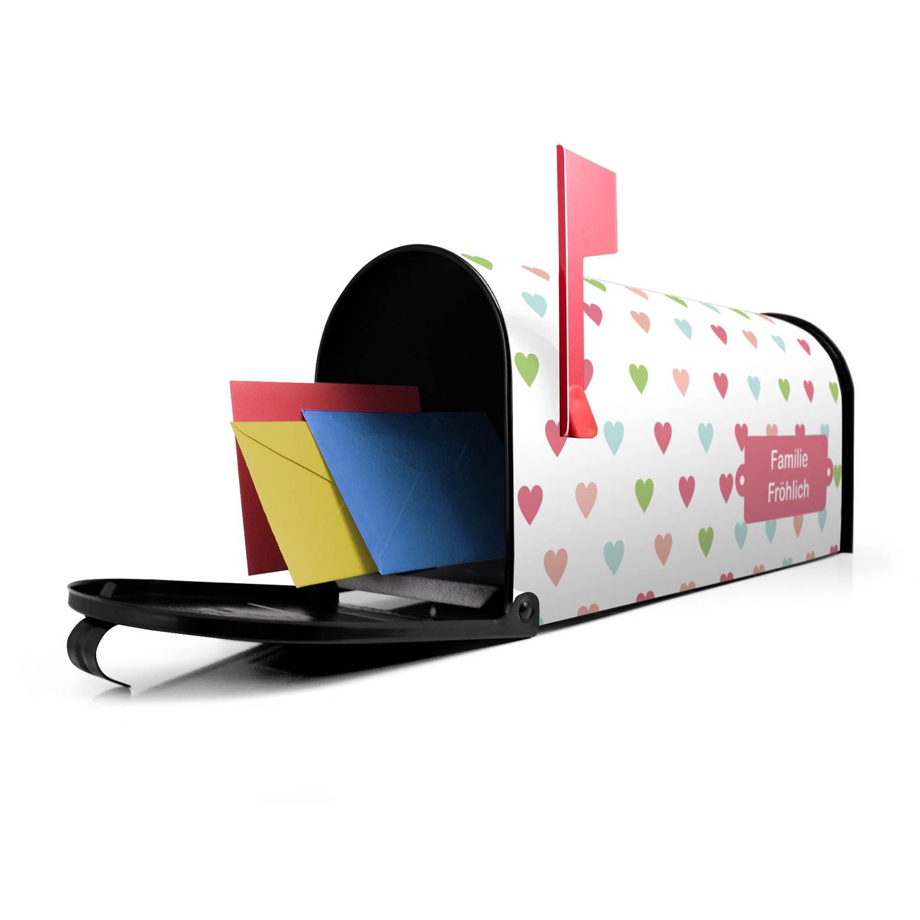Unser amerikanischer Briefkasten mit dem Motiv Herzen Auf Weiß hat ein sehr ansprechendes und ausgefallenes Design, ist in der Grundfarbe weiß, grün oder schwarz erhältlich. Damit entlocken Sie Ihren Nachbarn und dem Postboten immer wieder ein Lächeln. Die Mailbox ist ein Original Import aus Mississippi USA und wird von unserer kleinen Manufaktur in Sachsen von Hand veredelt. Die US-Mailbox bietet ausreichend Platz auch für große Sendungen, eine Fahne die Ihnen Post anzeigt, wetterfestes und äußerst stabiles Material - so macht Post empfangen Freude.