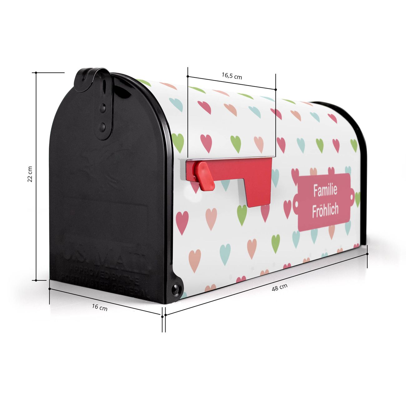 Der amerikanische Briefkasten von banjado mit Herzen Auf Weiß Motiv bietet Ihnen ausreichend Fassungsvermögen, um große A4 Sendungen und Zeitschriften zu empfangen. Die typisch amerikanische rote Fahne zeigt Ihnen an, wenn Sie Post erhalten haben. Die US-Mailbox besteht aus verzinktem Stahlblech welches lackiert wurde und ist 48 x 22 x 16 CM (BxHxT) groß. Die Folie mit Motiv Herzen Auf Weiß besteht aus einer wetter- und UV-resistenten Folie, die mit einem Schutzlaminat überzogen ist, sodass die US Mailbox zusätzlich vor Kratzern geschützt ist. An der Unterkante sind 4 Löcher je Seite um die Mailbox, typisch amerikanisch, an einem Holzpfahl oder einem Zaun zu befestigen. Auf Wunsch können Sie bei uns den passenden Standfuß oder die passende Wandhalterung kaufen um die US-Mailbox sicher zu befestigen. Wir bieten Ihnen ebenfalls Namensschilder, bereits beschriftet oder frei zu beschriften, und verschiedene selbst gestaltete Bitte-Keine-Werbung-Aufkleber.