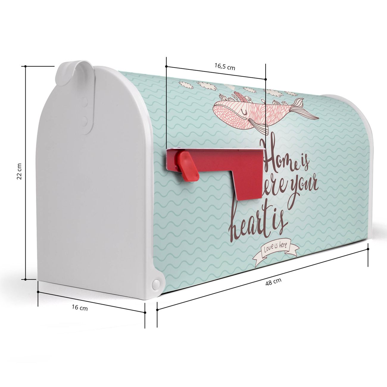Der amerikanische Briefkasten von banjado mit Herzensangelegenheit Motiv bietet Ihnen ausreichend Fassungsvermögen, um große A4 Sendungen und Zeitschriften zu empfangen. Die typisch amerikanische rote Fahne zeigt Ihnen an, wenn Sie Post erhalten haben. Die US-Mailbox besteht aus verzinktem Stahlblech welches lackiert wurde und ist 48 x 22 x 16 CM (BxHxT) groß. Die Folie mit Motiv Herzensangelegenheit besteht aus einer wetter- und UV-resistenten Folie, die mit einem Schutzlaminat überzogen ist, sodass die US Mailbox zusätzlich vor Kratzern geschützt ist. An der Unterkante sind 4 Löcher je Seite um die Mailbox, typisch amerikanisch, an einem Holzpfahl oder einem Zaun zu befestigen. Auf Wunsch können Sie bei uns den passenden Standfuß oder die passende Wandhalterung kaufen um die US-Mailbox sicher zu befestigen. Wir bieten Ihnen ebenfalls Namensschilder, bereits beschriftet oder frei zu beschriften, und verschiedene selbst gestaltete Bitte-Keine-Werbung-Aufkleber.