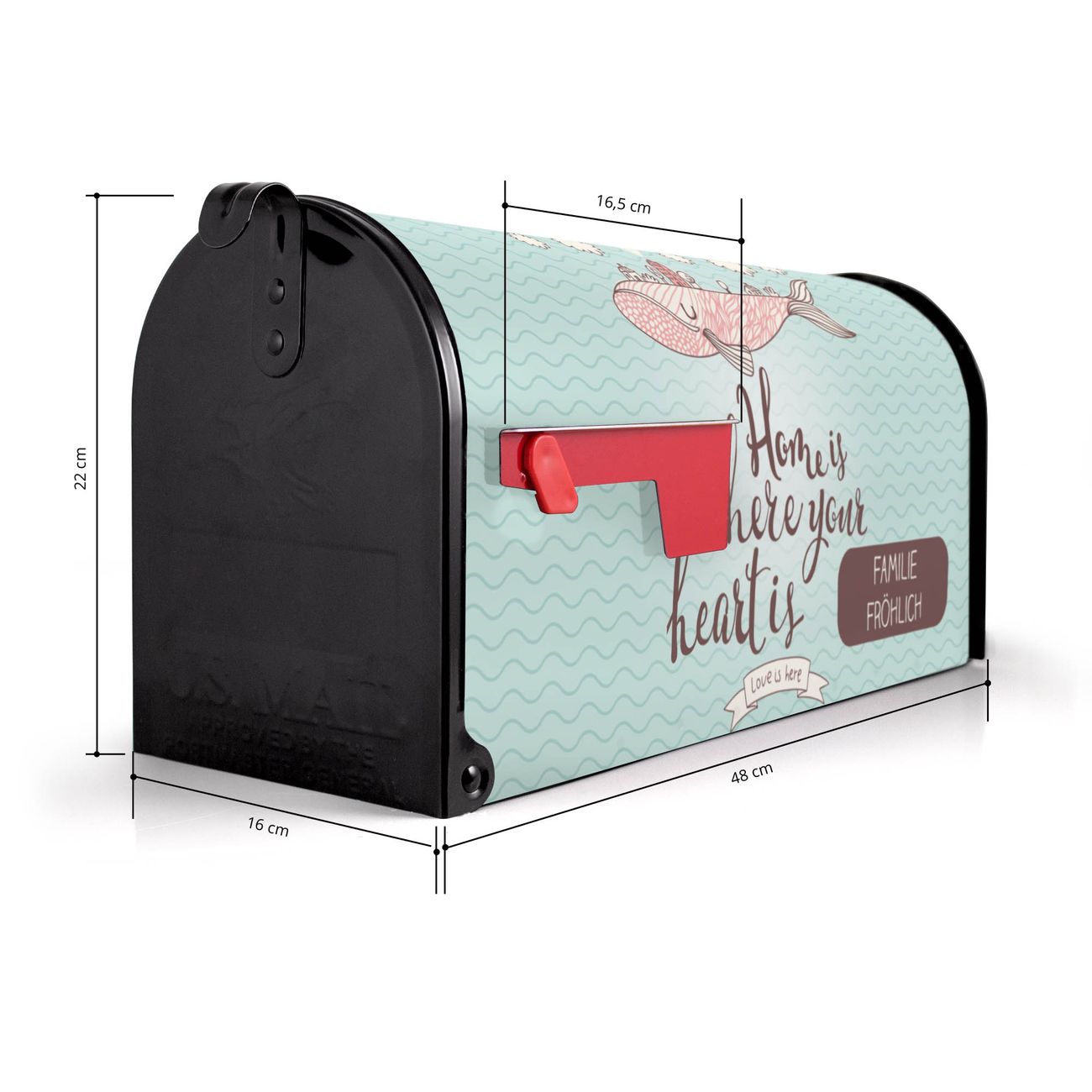 Der amerikanische Briefkasten von banjado mit Herzensangelegenheit Motiv bietet Ihnen ausreichend Fassungsvermögen, um große A4 Sendungen und Zeitschriften zu empfangen. Die typisch amerikanische rote Fahne zeigt Ihnen an, wenn Sie Post erhalten haben. Die US-Mailbox besteht aus verzinktem Stahlblech welches lackiert wurde und ist 48 x 22 x 16 CM (BxHxT) groß. Die Folie mit Motiv Herzensangelegenheit besteht aus einer wetter- und UV-resistenten Folie, die mit einem Schutzlaminat überzogen ist, sodass die US Mailbox zusätzlich vor Kratzern geschützt ist. An der Unterkante sind 4 Löcher je Seite um die Mailbox, typisch amerikanisch, an einem Holzpfahl oder einem Zaun zu befestigen. Auf Wunsch können Sie bei uns den passenden Standfuß oder die passende Wandhalterung kaufen um die US-Mailbox sicher zu befestigen. Wir bieten Ihnen ebenfalls Namensschilder, bereits beschriftet oder frei zu beschriften, und verschiedene selbst gestaltete Bitte-Keine-Werbung-Aufkleber.