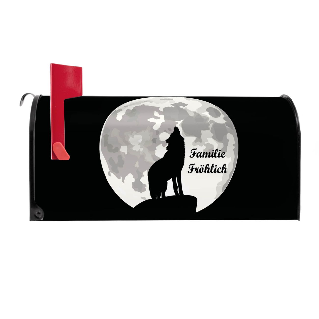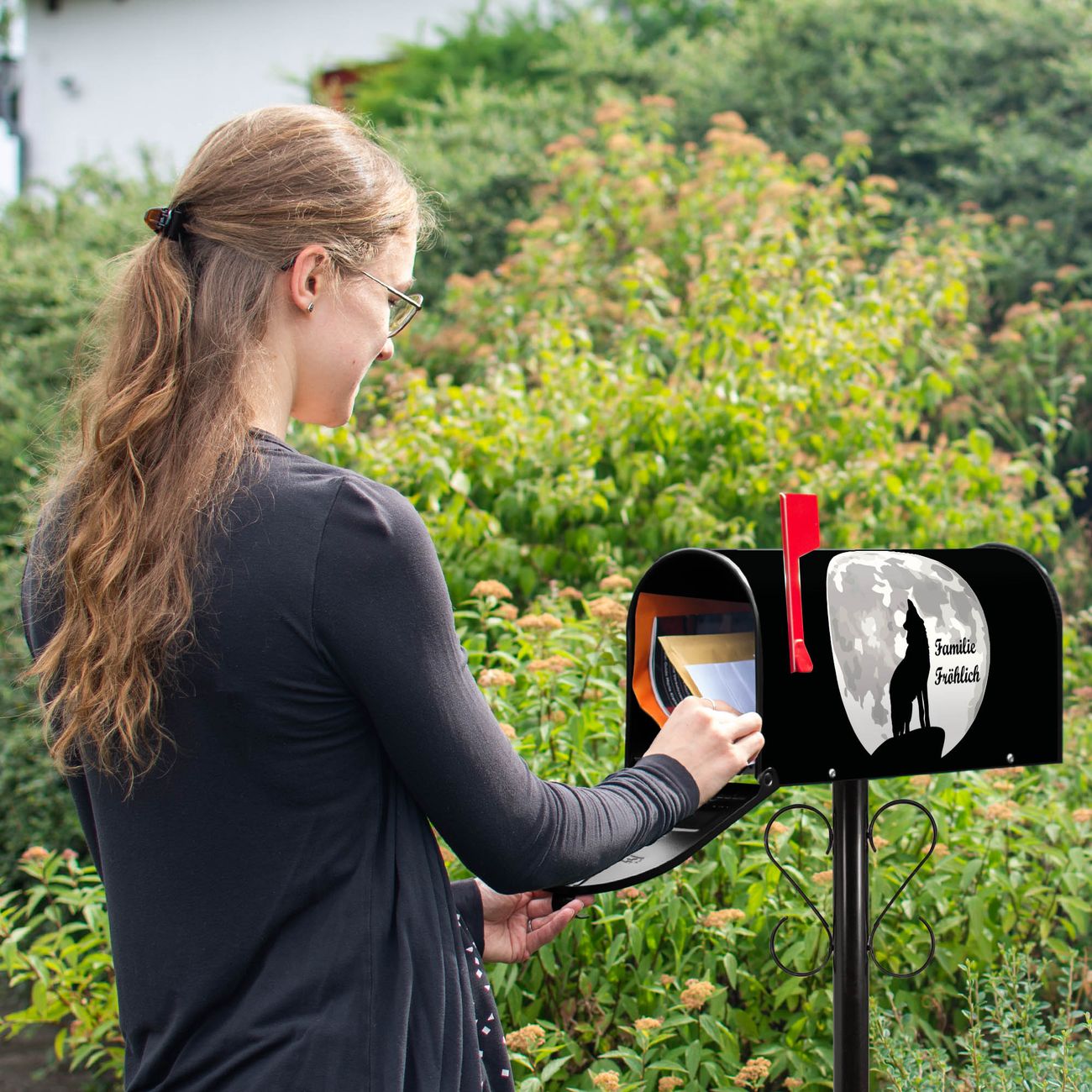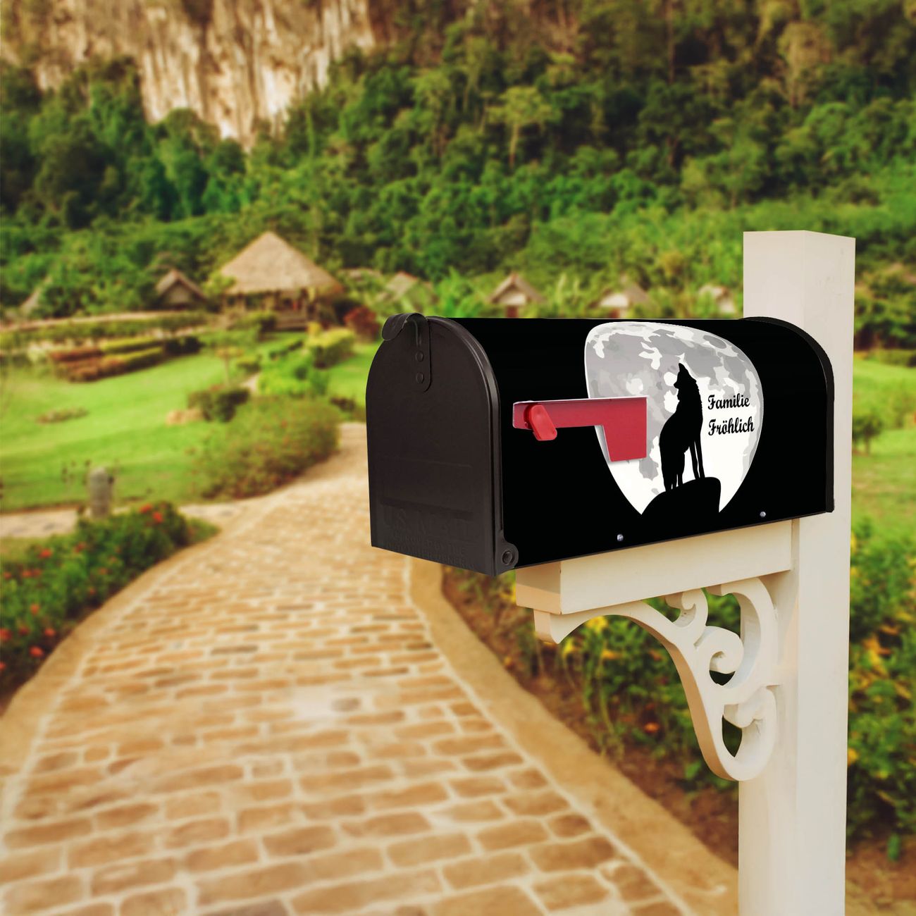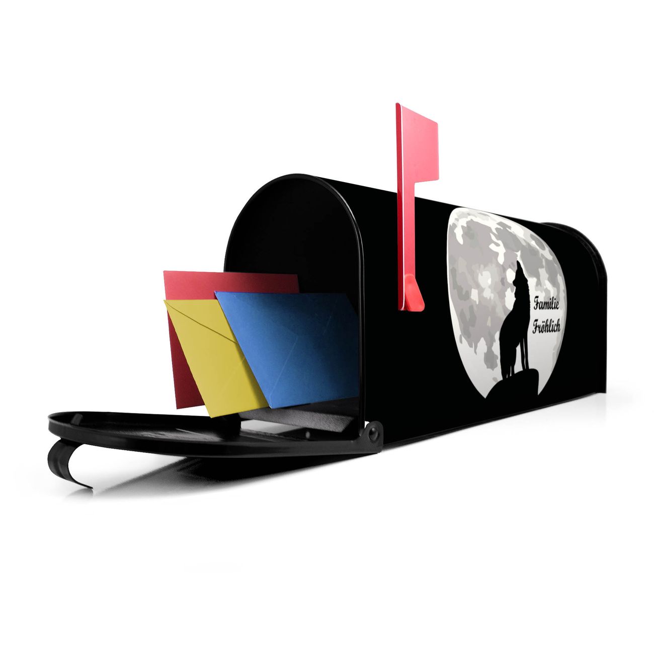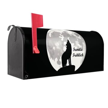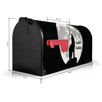 Der amerikanische Briefkasten von banjado mit Heulender Wolf SW Motiv bietet Ihnen ausreichend Fassungsvermögen, um große A4 Sendungen und Zeitschriften zu empfangen. Die typisch amerikanische rote Fahne zeigt Ihnen an, wenn Sie Post erhalten haben. Die US-Mailbox besteht aus verzinktem Stahlblech welches lackiert wurde und ist 48 x 22 x 16 CM (BxHxT) groß. Die Folie mit Motiv Heulender Wolf SW besteht aus einer wetter- und UV-resistenten Folie, die mit einem Schutzlaminat überzogen ist, sodass die US Mailbox zusätzlich vor Kratzern geschützt ist. An der Unterkante sind 4 Löcher je Seite um die Mailbox, typisch amerikanisch, an einem Holzpfahl oder einem Zaun zu befestigen. Auf Wunsch können Sie bei uns den passenden Standfuß oder die passende Wandhalterung kaufen um die US-Mailbox sicher zu befestigen. Wir bieten Ihnen ebenfalls Namensschilder, bereits beschriftet oder frei zu beschriften, und verschiedene selbst gestaltete Bitte-Keine-Werbung-Aufkleber.
