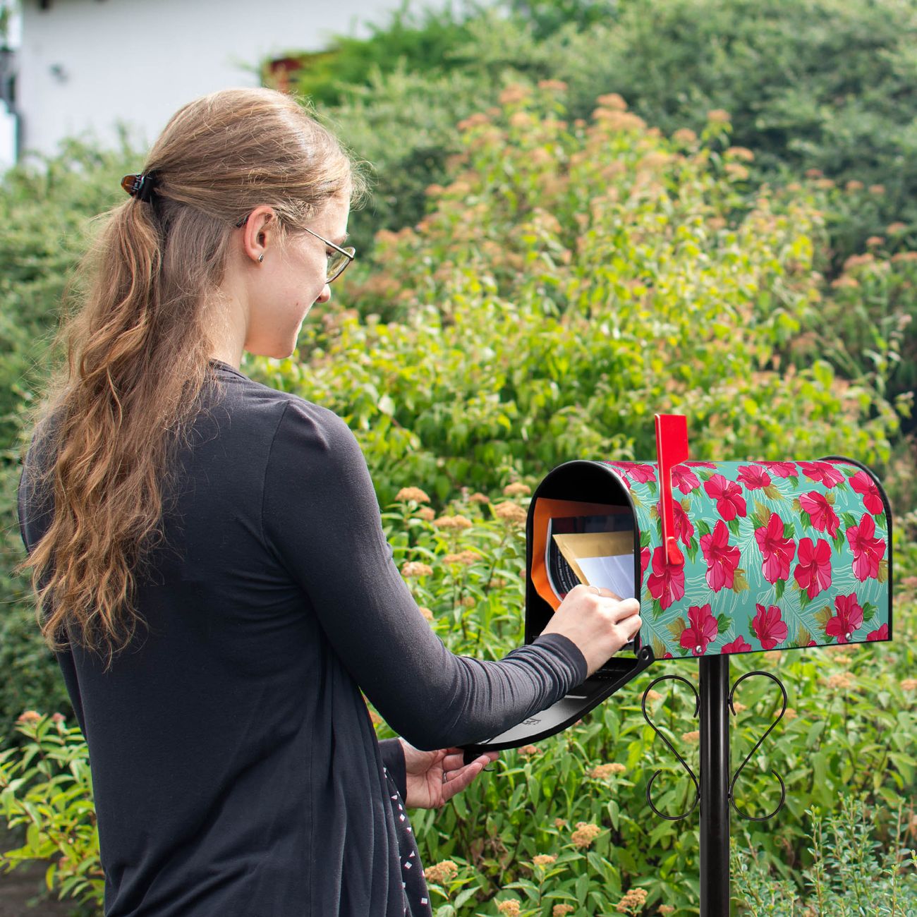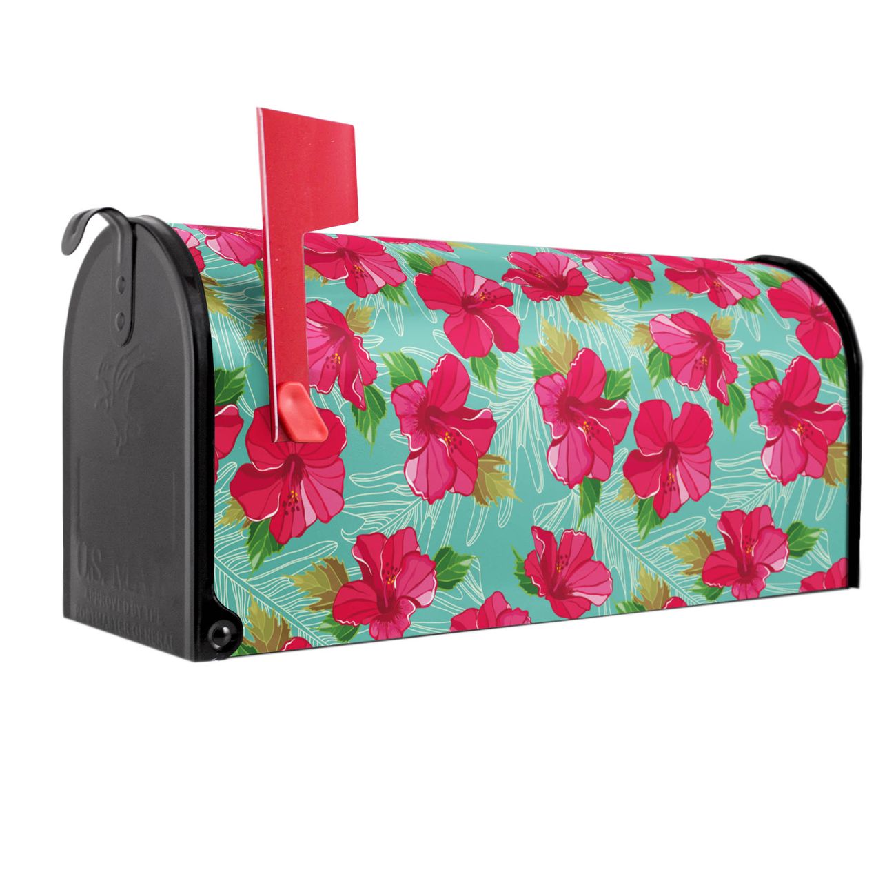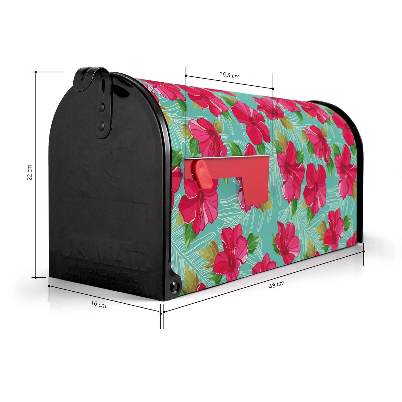 Der amerikanische Briefkasten von banjado mit Hibiskus Motiv bietet Ihnen ausreichend Fassungsvermögen, um große A4 Sendungen und Zeitschriften zu empfangen. Die typisch amerikanische rote Fahne zeigt Ihnen an, wenn Sie Post erhalten haben. Die US-Mailbox besteht aus verzinktem Stahlblech welches lackiert wurde und ist 48 x 22 x 16 CM (BxHxT) groß. Die Folie mit Motiv Hibiskus besteht aus einer wetter- und UV-resistenten Folie, die mit einem Schutzlaminat überzogen ist, sodass die US Mailbox zusätzlich vor Kratzern geschützt ist. An der Unterkante sind 4 Löcher je Seite um die Mailbox, typisch amerikanisch, an einem Holzpfahl oder einem Zaun zu befestigen. Auf Wunsch können Sie bei uns den passenden Standfuß oder die passende Wandhalterung kaufen um die US-Mailbox sicher zu befestigen. Wir bieten Ihnen ebenfalls Namensschilder, bereits beschriftet oder frei zu beschriften, und verschiedene selbst gestaltete Bitte-Keine-Werbung-Aufkleber.