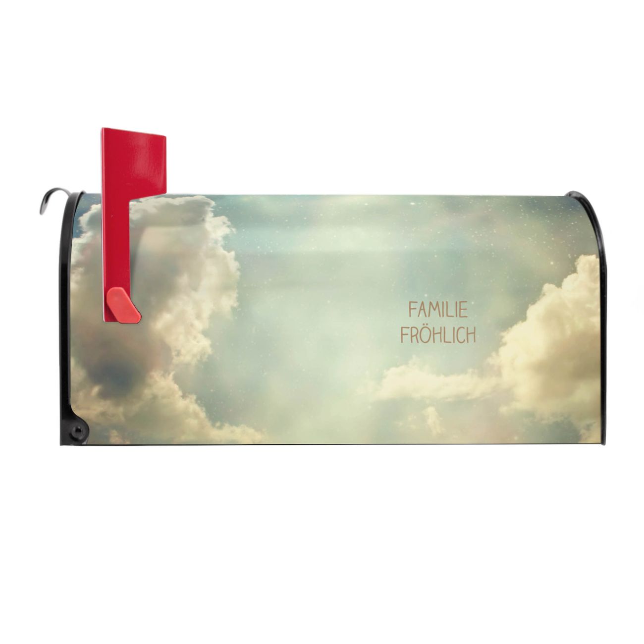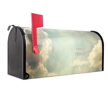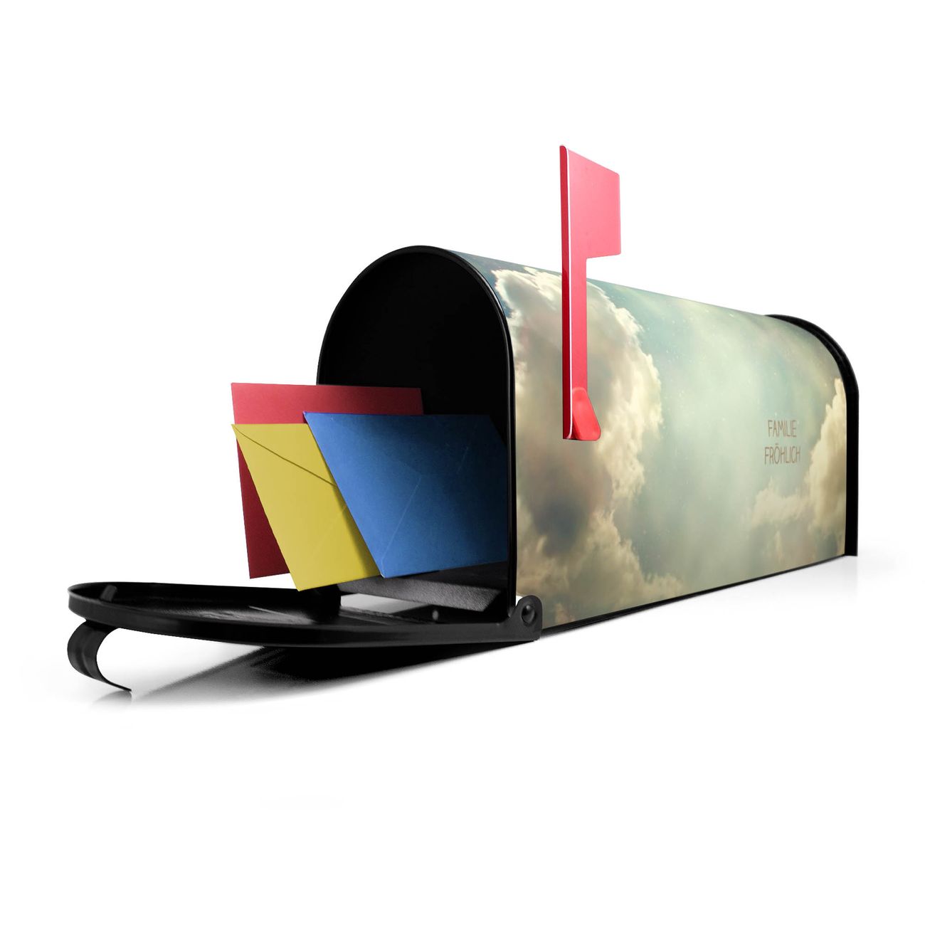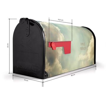 Der amerikanische Briefkasten von banjado mit Himmel Vintage Motiv bietet Ihnen ausreichend Fassungsvermögen, um große A4 Sendungen und Zeitschriften zu empfangen. Die typisch amerikanische rote Fahne zeigt Ihnen an, wenn Sie Post erhalten haben. Die US-Mailbox besteht aus verzinktem Stahlblech welches lackiert wurde und ist 48 x 22 x 16 CM (BxHxT) groß. Die Folie mit Motiv Himmel Vintage besteht aus einer wetter- und UV-resistenten Folie, die mit einem Schutzlaminat überzogen ist, sodass die US Mailbox zusätzlich vor Kratzern geschützt ist. An der Unterkante sind 4 Löcher je Seite um die Mailbox, typisch amerikanisch, an einem Holzpfahl oder einem Zaun zu befestigen. Auf Wunsch können Sie bei uns den passenden Standfuß oder die passende Wandhalterung kaufen um die US-Mailbox sicher zu befestigen. Wir bieten Ihnen ebenfalls Namensschilder, bereits beschriftet oder frei zu beschriften, und verschiedene selbst gestaltete Bitte-Keine-Werbung-Aufkleber.