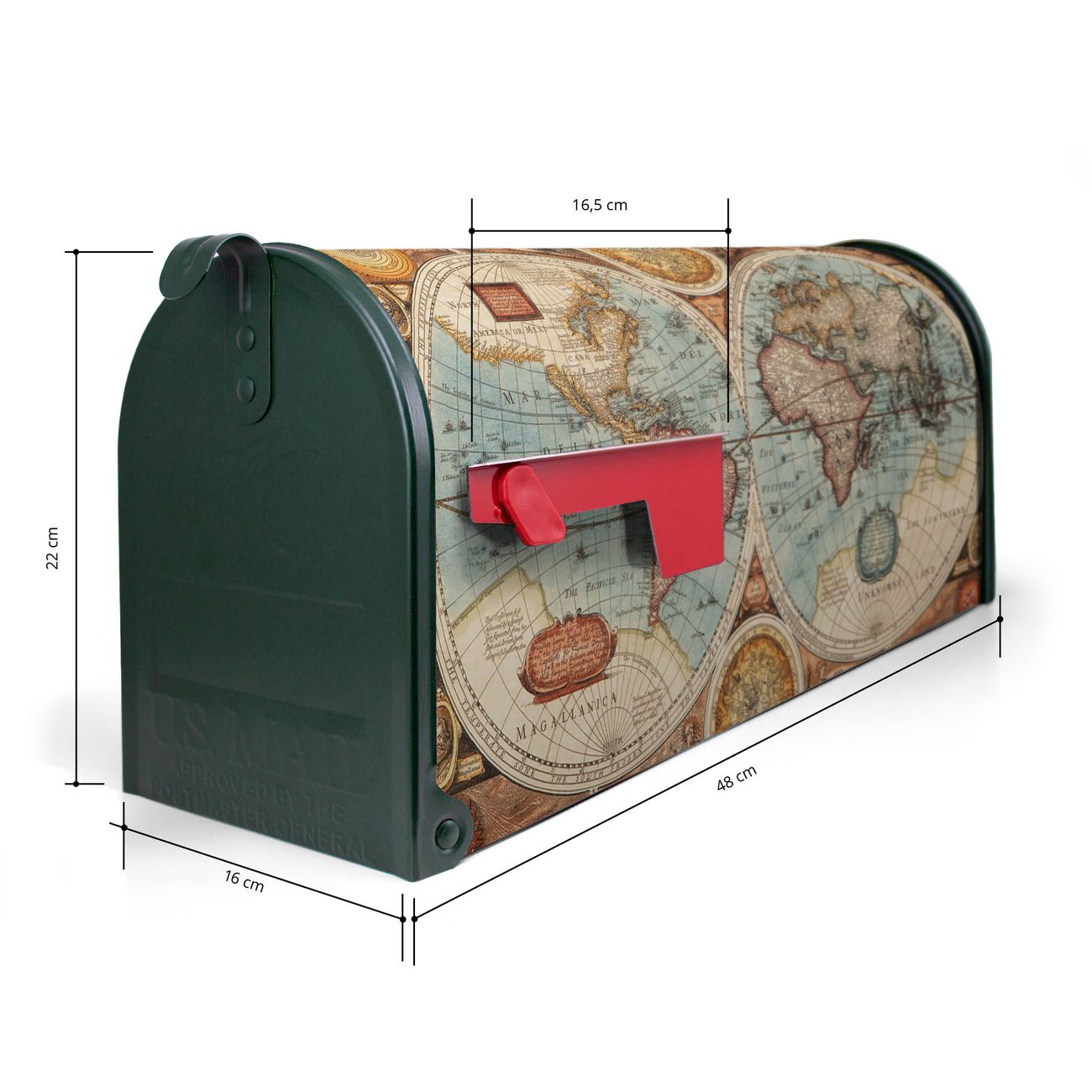 Der amerikanische Briefkasten von banjado mit Historische Weltkarte Motiv bietet Ihnen ausreichend Fassungsvermögen, um große A4 Sendungen und Zeitschriften zu empfangen. Die typisch amerikanische rote Fahne zeigt Ihnen an, wenn Sie Post erhalten haben. Die US-Mailbox besteht aus verzinktem Stahlblech welches lackiert wurde und ist 48 x 22 x 16 CM (BxHxT) groß. Die Folie mit Motiv Historische Weltkarte besteht aus einer wetter- und UV-resistenten Folie, die mit einem Schutzlaminat überzogen ist, sodass die US Mailbox zusätzlich vor Kratzern geschützt ist. An der Unterkante sind 4 Löcher je Seite um die Mailbox, typisch amerikanisch, an einem Holzpfahl oder einem Zaun zu befestigen. Auf Wunsch können Sie bei uns den passenden Standfuß oder die passende Wandhalterung kaufen um die US-Mailbox sicher zu befestigen. Wir bieten Ihnen ebenfalls Namensschilder, bereits beschriftet oder frei zu beschriften, und verschiedene selbst gestaltete Bitte-Keine-Werbung-Aufkleber.