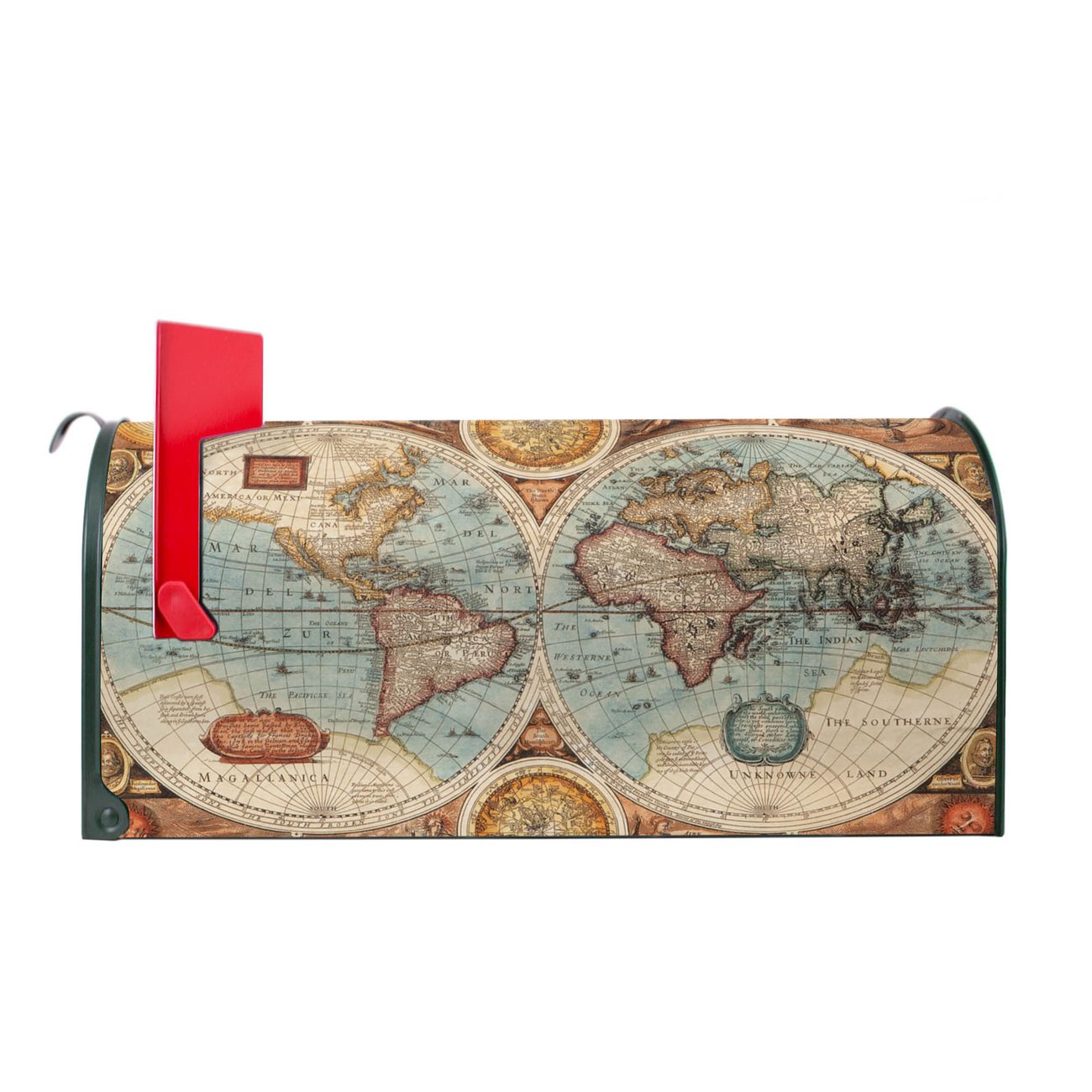Unser amerikanischer Briefkasten mit dem Motiv Historische Weltkarte hat ein sehr ansprechendes und ausgefallenes Design, ist in der Grundfarbe weiß, grün oder schwarz erhältlich. Damit entlocken Sie Ihren Nachbarn und dem Postboten immer wieder ein Lächeln. Die Mailbox ist ein Original Import aus Mississippi USA und wird von unserer kleinen Manufaktur in Sachsen von Hand veredelt. Die US-Mailbox bietet ausreichend Platz auch für große Sendungen, eine Fahne die Ihnen Post anzeigt, wetterfestes und äußerst stabiles Material - so macht Post empfangen Freude.