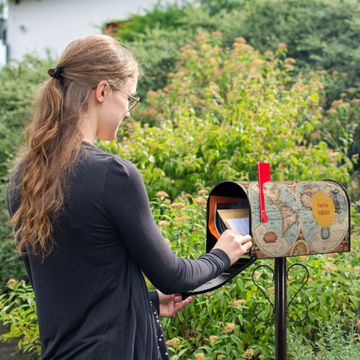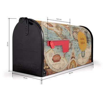 Der amerikanische Briefkasten von banjado mit Historische Weltkarte Motiv bietet Ihnen ausreichend Fassungsvermögen, um große A4 Sendungen und Zeitschriften zu empfangen. Die typisch amerikanische rote Fahne zeigt Ihnen an, wenn Sie Post erhalten haben. Die US-Mailbox besteht aus verzinktem Stahlblech welches lackiert wurde und ist 48 x 22 x 16 CM (BxHxT) groß. Die Folie mit Motiv Historische Weltkarte besteht aus einer wetter- und UV-resistenten Folie, die mit einem Schutzlaminat überzogen ist, sodass die US Mailbox zusätzlich vor Kratzern geschützt ist. An der Unterkante sind 4 Löcher je Seite um die Mailbox, typisch amerikanisch, an einem Holzpfahl oder einem Zaun zu befestigen. Auf Wunsch können Sie bei uns den passenden Standfuß oder die passende Wandhalterung kaufen um die US-Mailbox sicher zu befestigen. Wir bieten Ihnen ebenfalls Namensschilder, bereits beschriftet oder frei zu beschriften, und verschiedene selbst gestaltete Bitte-Keine-Werbung-Aufkleber.