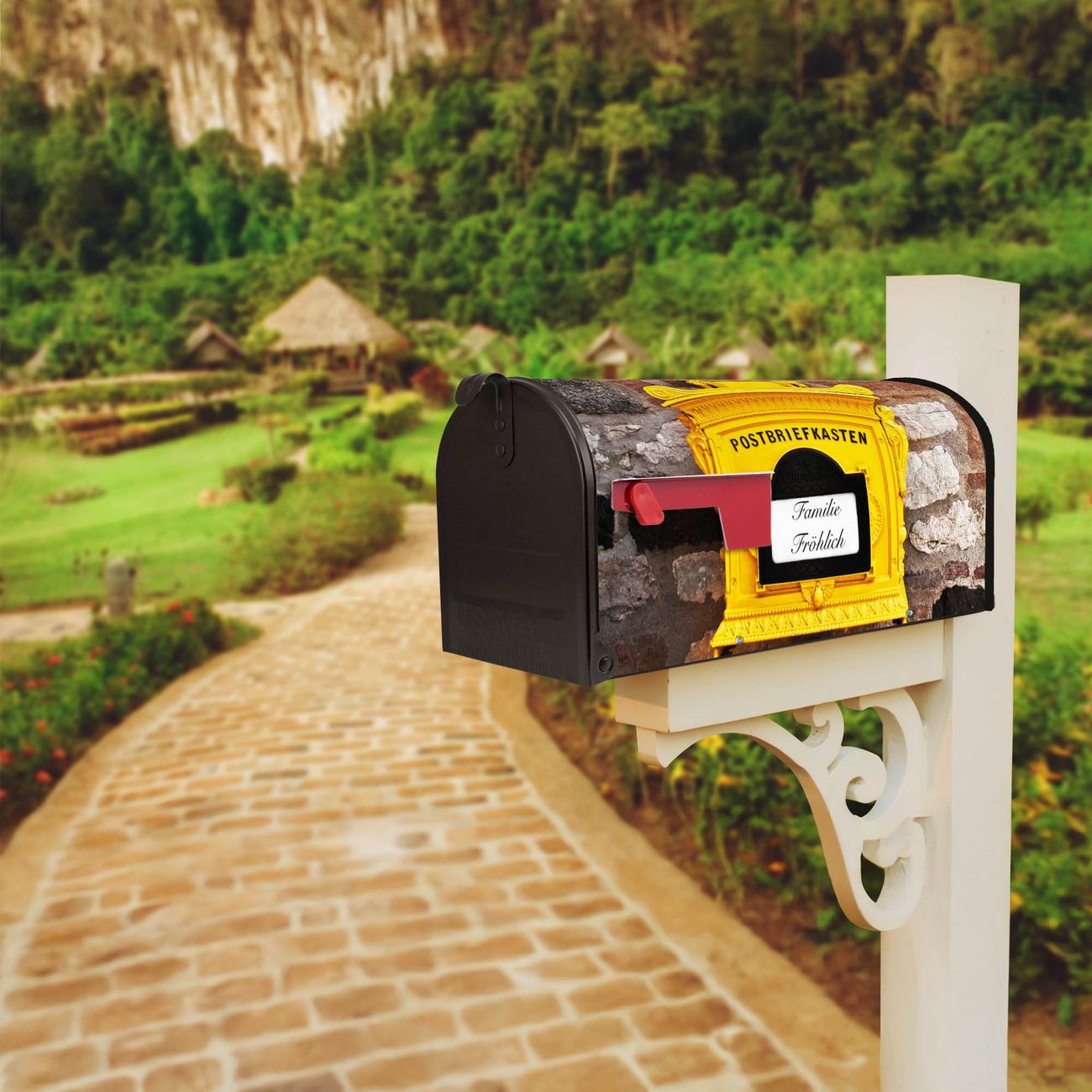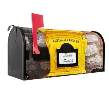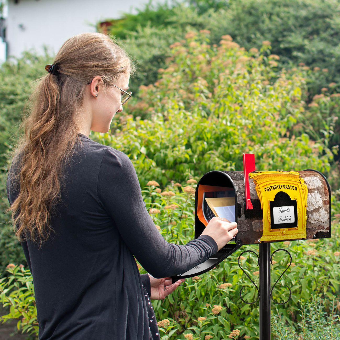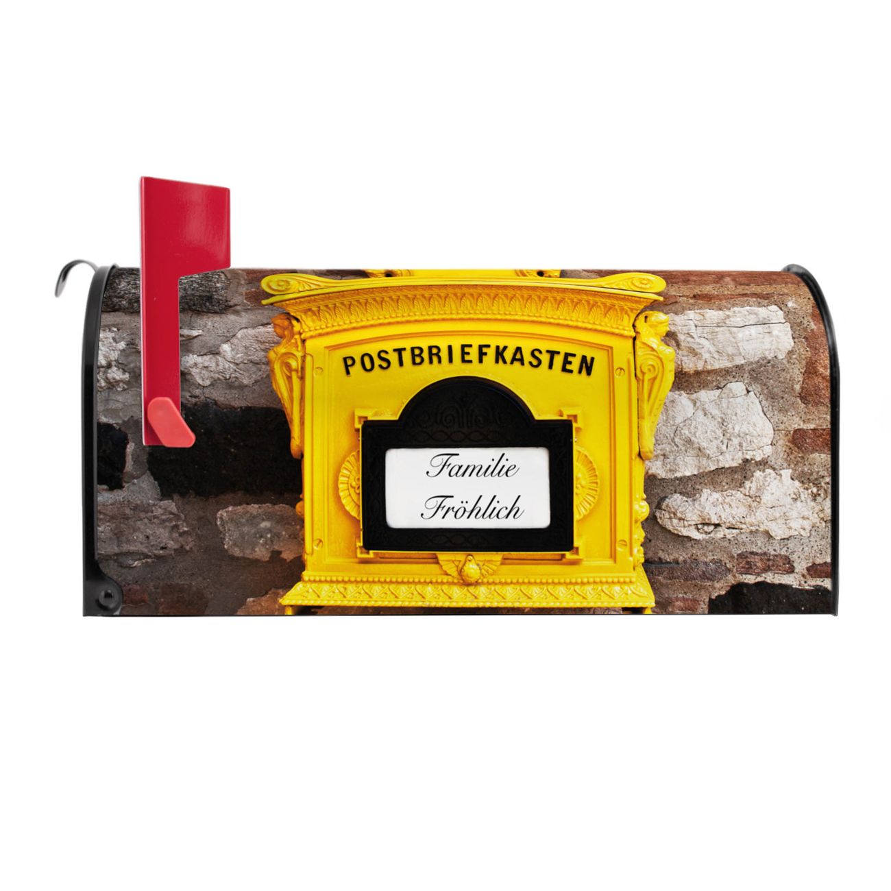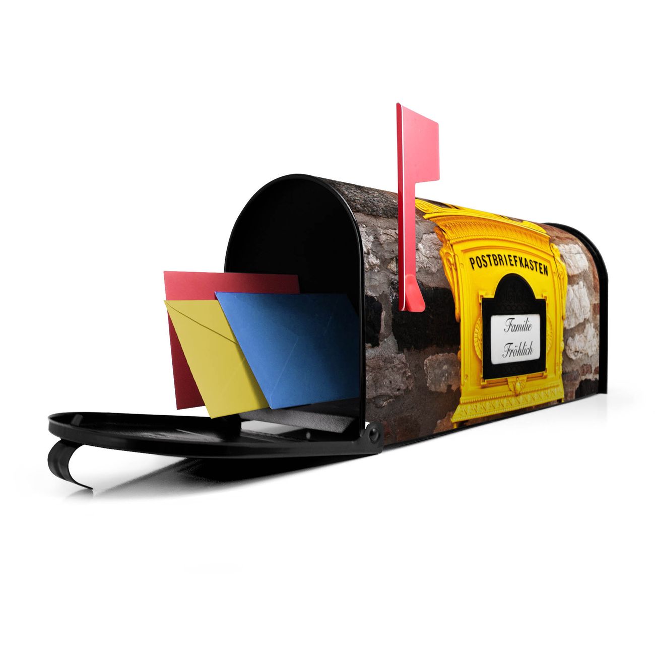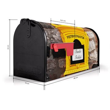 Der amerikanische Briefkasten von banjado mit Historischer Postkasten Motiv bietet Ihnen ausreichend Fassungsvermögen, um große A4 Sendungen und Zeitschriften zu empfangen. Die typisch amerikanische rote Fahne zeigt Ihnen an, wenn Sie Post erhalten haben. Die US-Mailbox besteht aus verzinktem Stahlblech welches lackiert wurde und ist 48 x 22 x 16 CM (BxHxT) groß. Die Folie mit Motiv Historischer Postkasten besteht aus einer wetter- und UV-resistenten Folie, die mit einem Schutzlaminat überzogen ist, sodass die US Mailbox zusätzlich vor Kratzern geschützt ist. An der Unterkante sind 4 Löcher je Seite um die Mailbox, typisch amerikanisch, an einem Holzpfahl oder einem Zaun zu befestigen. Auf Wunsch können Sie bei uns den passenden Standfuß oder die passende Wandhalterung kaufen um die US-Mailbox sicher zu befestigen. Wir bieten Ihnen ebenfalls Namensschilder, bereits beschriftet oder frei zu beschriften, und verschiedene selbst gestaltete Bitte-Keine-Werbung-Aufkleber.