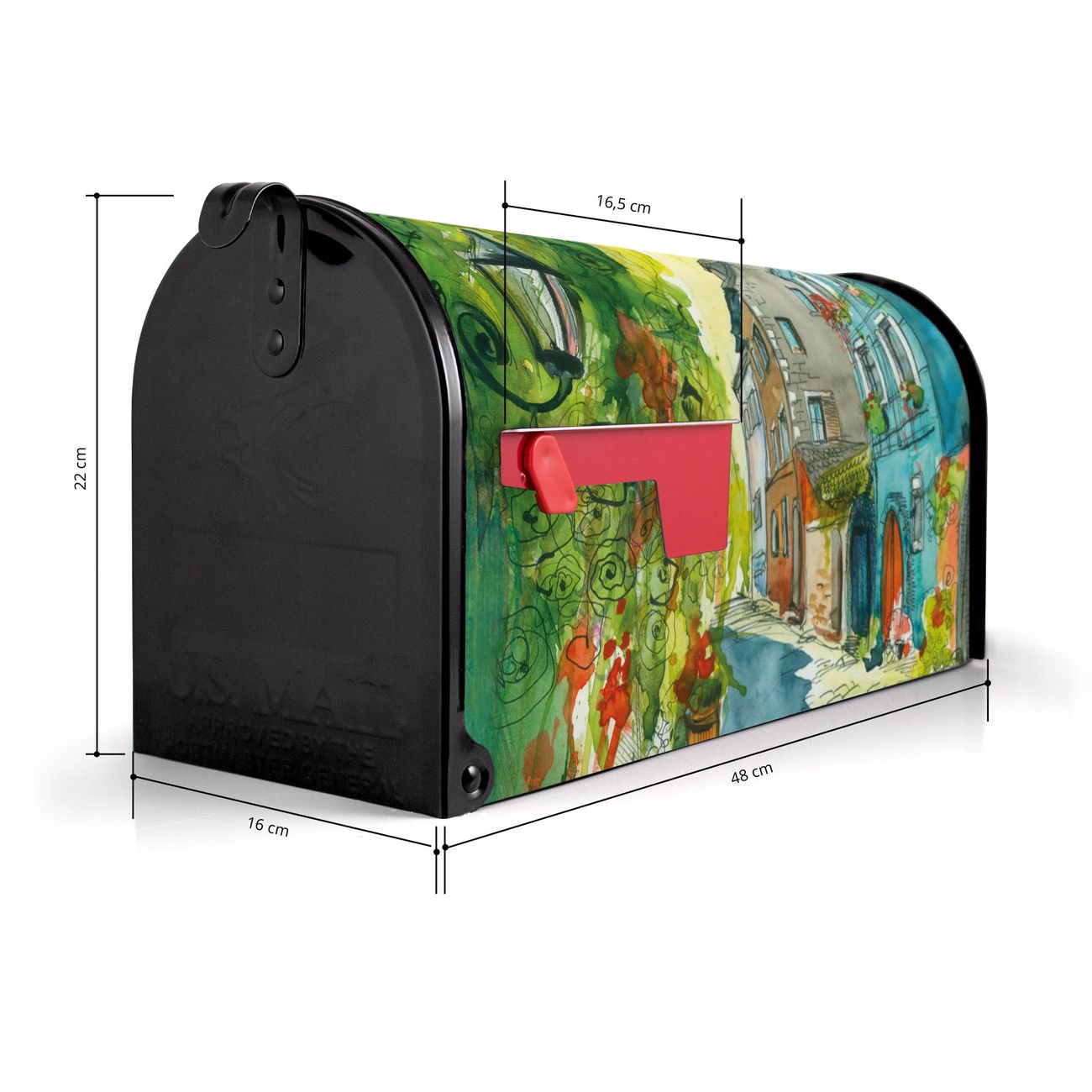 Der amerikanische Briefkasten von banjado mit Historischer Stadtkern Motiv bietet Ihnen ausreichend Fassungsvermögen, um große A4 Sendungen und Zeitschriften zu empfangen. Die typisch amerikanische rote Fahne zeigt Ihnen an, wenn Sie Post erhalten haben. Die US-Mailbox besteht aus verzinktem Stahlblech welches lackiert wurde und ist 48 x 22 x 16 CM (BxHxT) groß. Die Folie mit Motiv Historischer Stadtkern besteht aus einer wetter- und UV-resistenten Folie, die mit einem Schutzlaminat überzogen ist, sodass die US Mailbox zusätzlich vor Kratzern geschützt ist. An der Unterkante sind 4 Löcher je Seite um die Mailbox, typisch amerikanisch, an einem Holzpfahl oder einem Zaun zu befestigen. Auf Wunsch können Sie bei uns den passenden Standfuß oder die passende Wandhalterung kaufen um die US-Mailbox sicher zu befestigen. Wir bieten Ihnen ebenfalls Namensschilder, bereits beschriftet oder frei zu beschriften, und verschiedene selbst gestaltete Bitte-Keine-Werbung-Aufkleber.
