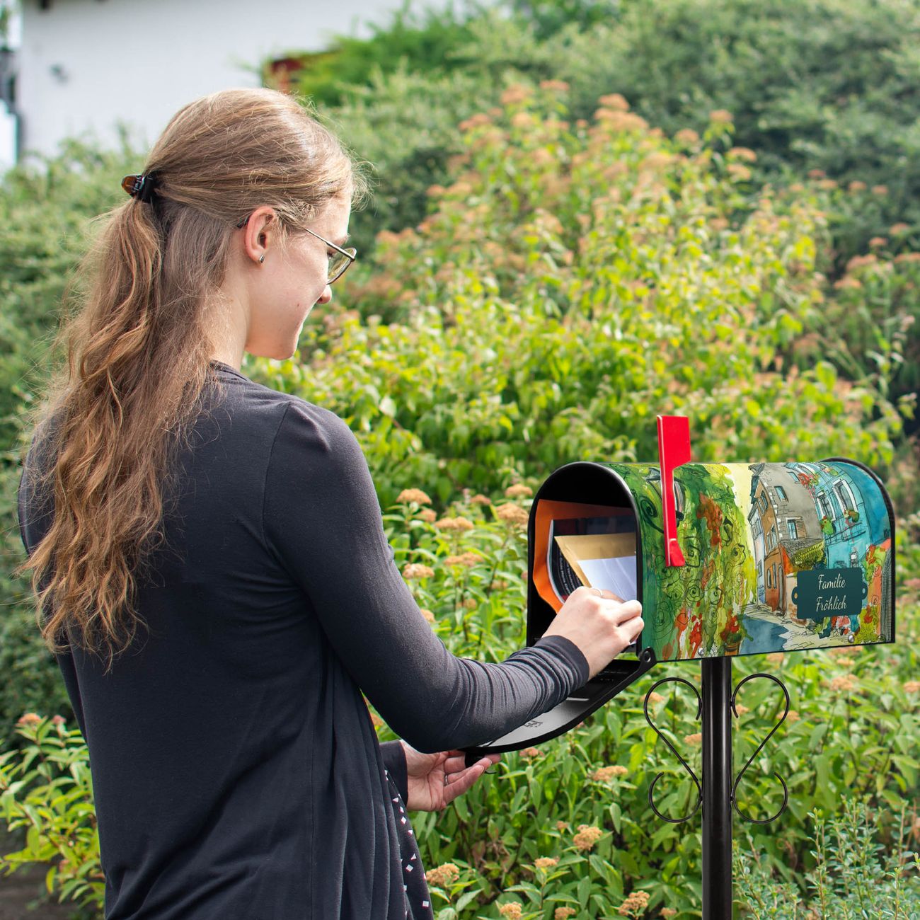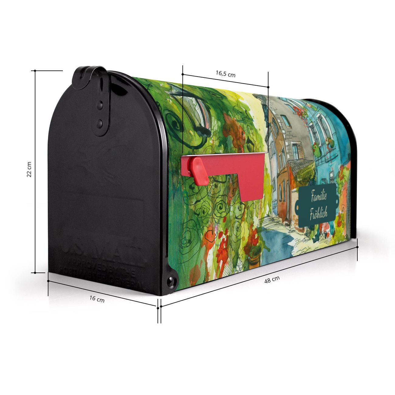 Der amerikanische Briefkasten von banjado mit Historischer Stadtkern Motiv bietet Ihnen ausreichend Fassungsvermögen, um große A4 Sendungen und Zeitschriften zu empfangen. Die typisch amerikanische rote Fahne zeigt Ihnen an, wenn Sie Post erhalten haben. Die US-Mailbox besteht aus verzinktem Stahlblech welches lackiert wurde und ist 48 x 22 x 16 CM (BxHxT) groß. Die Folie mit Motiv Historischer Stadtkern besteht aus einer wetter- und UV-resistenten Folie, die mit einem Schutzlaminat überzogen ist, sodass die US Mailbox zusätzlich vor Kratzern geschützt ist. An der Unterkante sind 4 Löcher je Seite um die Mailbox, typisch amerikanisch, an einem Holzpfahl oder einem Zaun zu befestigen. Auf Wunsch können Sie bei uns den passenden Standfuß oder die passende Wandhalterung kaufen um die US-Mailbox sicher zu befestigen. Wir bieten Ihnen ebenfalls Namensschilder, bereits beschriftet oder frei zu beschriften, und verschiedene selbst gestaltete Bitte-Keine-Werbung-Aufkleber.