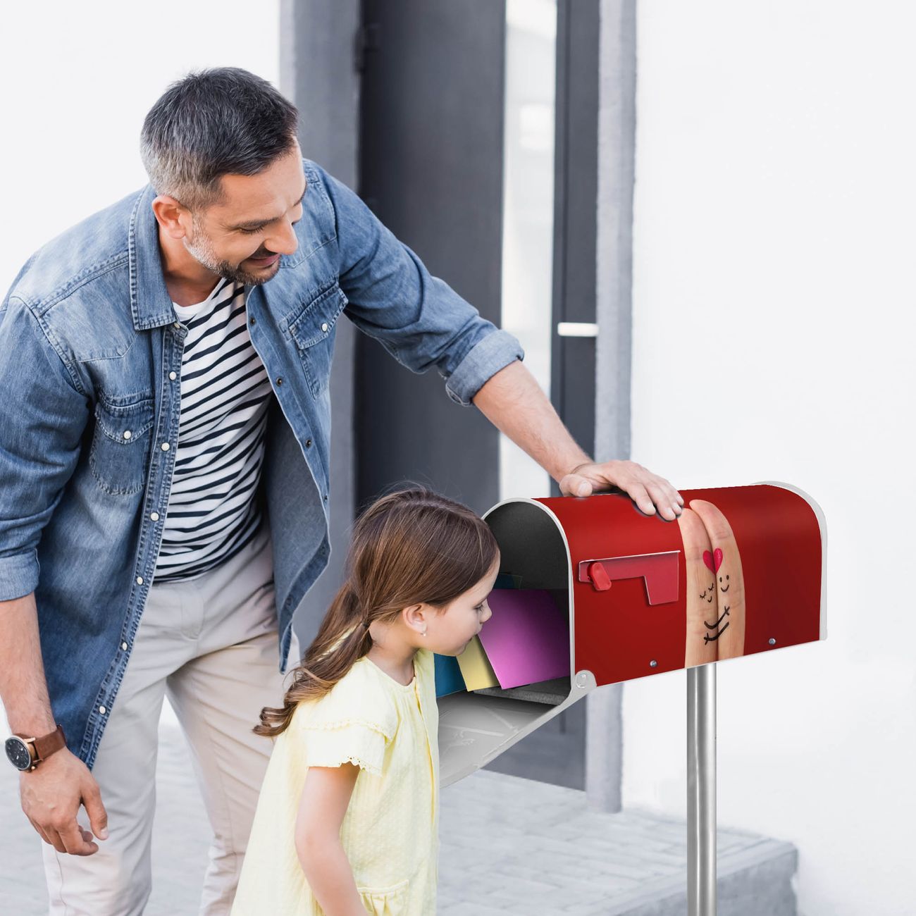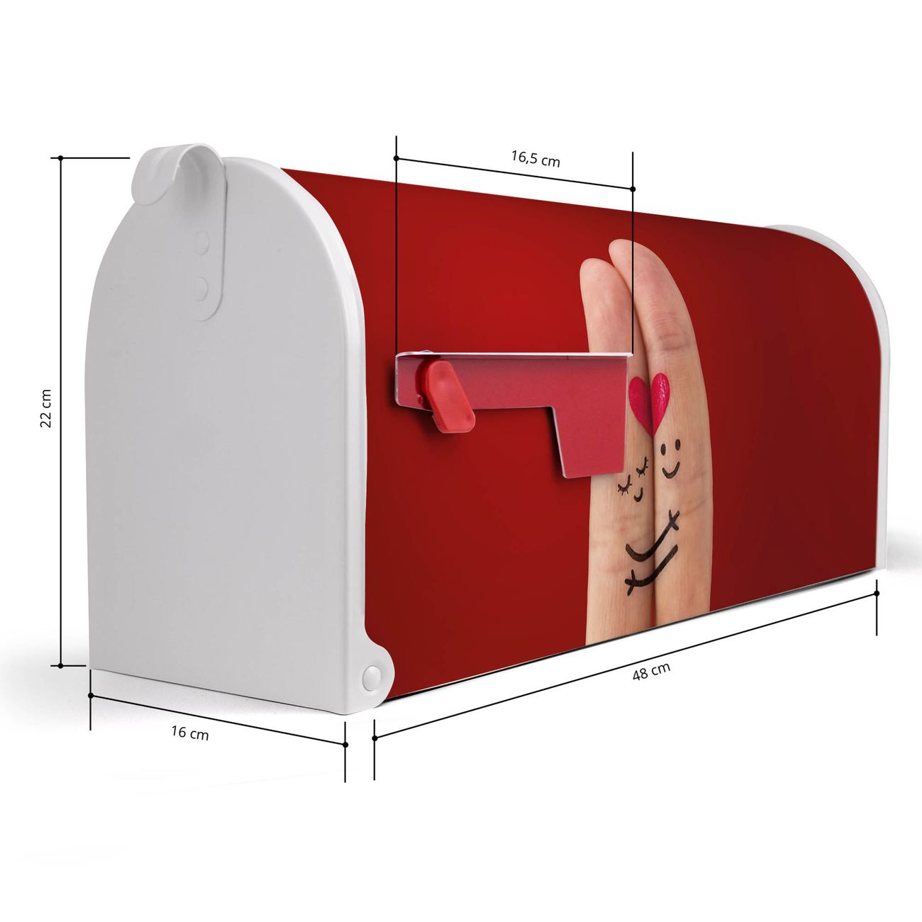Der amerikanische Briefkasten von banjado mit Hold Me Tight Motiv bietet Ihnen ausreichend Fassungsvermögen, um große A4 Sendungen und Zeitschriften zu empfangen. Die typisch amerikanische rote Fahne zeigt Ihnen an, wenn Sie Post erhalten haben. Die US-Mailbox besteht aus verzinktem Stahlblech welches lackiert wurde und ist 48 x 22 x 16 CM (BxHxT) groß. Die Folie mit Motiv Hold Me Tight besteht aus einer wetter- und UV-resistenten Folie, die mit einem Schutzlaminat überzogen ist, sodass die US Mailbox zusätzlich vor Kratzern geschützt ist. An der Unterkante sind 4 Löcher je Seite um die Mailbox, typisch amerikanisch, an einem Holzpfahl oder einem Zaun zu befestigen. Auf Wunsch können Sie bei uns den passenden Standfuß oder die passende Wandhalterung kaufen um die US-Mailbox sicher zu befestigen. Wir bieten Ihnen ebenfalls Namensschilder, bereits beschriftet oder frei zu beschriften, und verschiedene selbst gestaltete Bitte-Keine-Werbung-Aufkleber.