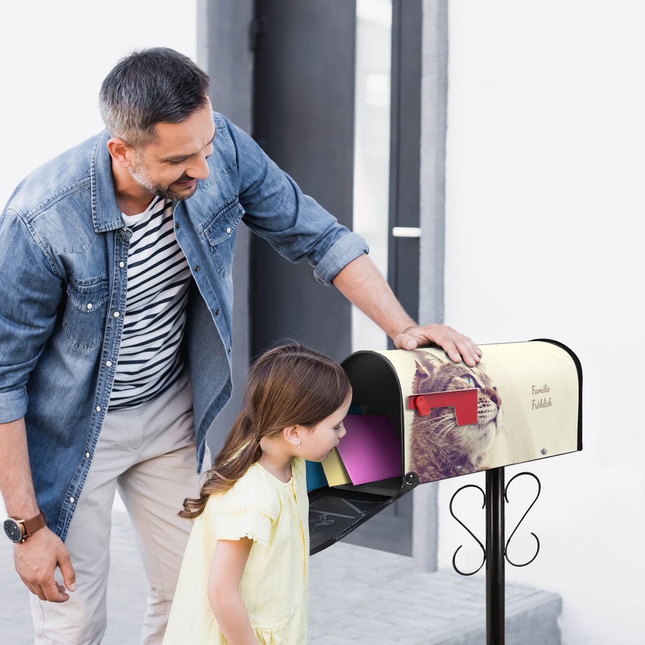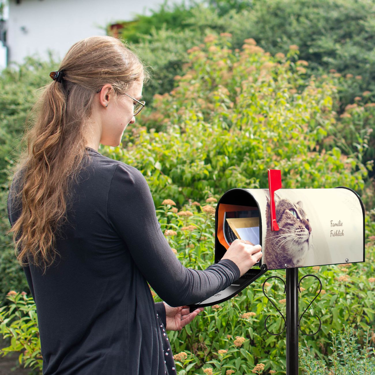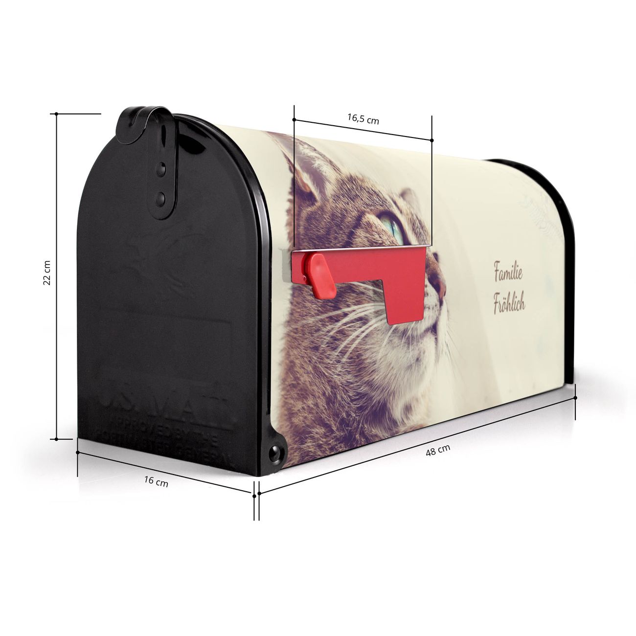 Der amerikanische Briefkasten von banjado mit Holgerson Motiv bietet Ihnen ausreichend Fassungsvermögen, um große A4 Sendungen und Zeitschriften zu empfangen. Die typisch amerikanische rote Fahne zeigt Ihnen an, wenn Sie Post erhalten haben. Die US-Mailbox besteht aus verzinktem Stahlblech welches lackiert wurde und ist 48 x 22 x 16 CM (BxHxT) groß. Die Folie mit Motiv Holgerson besteht aus einer wetter- und UV-resistenten Folie, die mit einem Schutzlaminat überzogen ist, sodass die US Mailbox zusätzlich vor Kratzern geschützt ist. An der Unterkante sind 4 Löcher je Seite um die Mailbox, typisch amerikanisch, an einem Holzpfahl oder einem Zaun zu befestigen. Auf Wunsch können Sie bei uns den passenden Standfuß oder die passende Wandhalterung kaufen um die US-Mailbox sicher zu befestigen. Wir bieten Ihnen ebenfalls Namensschilder, bereits beschriftet oder frei zu beschriften, und verschiedene selbst gestaltete Bitte-Keine-Werbung-Aufkleber.