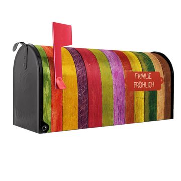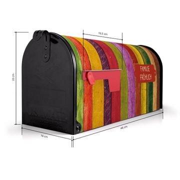 Der amerikanische Briefkasten von banjado mit Holz Collage Bunt Motiv bietet Ihnen ausreichend Fassungsvermögen, um große A4 Sendungen und Zeitschriften zu empfangen. Die typisch amerikanische rote Fahne zeigt Ihnen an, wenn Sie Post erhalten haben. Die US-Mailbox besteht aus verzinktem Stahlblech welches lackiert wurde und ist 48 x 22 x 16 CM (BxHxT) groß. Die Folie mit Motiv Holz Collage Bunt besteht aus einer wetter- und UV-resistenten Folie, die mit einem Schutzlaminat überzogen ist, sodass die US Mailbox zusätzlich vor Kratzern geschützt ist. An der Unterkante sind 4 Löcher je Seite um die Mailbox, typisch amerikanisch, an einem Holzpfahl oder einem Zaun zu befestigen. Auf Wunsch können Sie bei uns den passenden Standfuß oder die passende Wandhalterung kaufen um die US-Mailbox sicher zu befestigen. Wir bieten Ihnen ebenfalls Namensschilder, bereits beschriftet oder frei zu beschriften, und verschiedene selbst gestaltete Bitte-Keine-Werbung-Aufkleber.