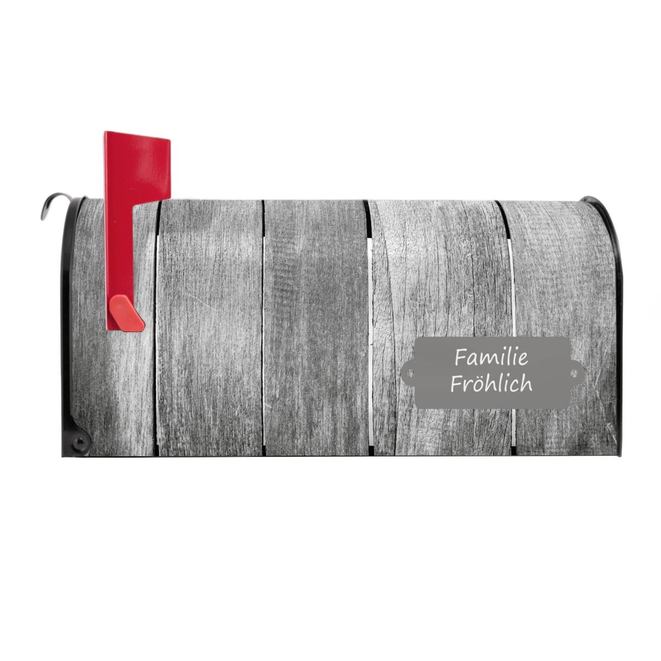 Der amerikanische Briefkasten von banjado mit Holz Monochrom Motiv bietet Ihnen ausreichend Fassungsvermögen, um große A4 Sendungen und Zeitschriften zu empfangen. Die typisch amerikanische rote Fahne zeigt Ihnen an, wenn Sie Post erhalten haben. Die US-Mailbox besteht aus verzinktem Stahlblech welches lackiert wurde und ist 48 x 22 x 16 CM (BxHxT) groß. Die Folie mit Motiv Holz Monochrom besteht aus einer wetter- und UV-resistenten Folie, die mit einem Schutzlaminat überzogen ist, sodass die US Mailbox zusätzlich vor Kratzern geschützt ist. An der Unterkante sind 4 Löcher je Seite um die Mailbox, typisch amerikanisch, an einem Holzpfahl oder einem Zaun zu befestigen. Auf Wunsch können Sie bei uns den passenden Standfuß oder die passende Wandhalterung kaufen um die US-Mailbox sicher zu befestigen. Wir bieten Ihnen ebenfalls Namensschilder, bereits beschriftet oder frei zu beschriften, und verschiedene selbst gestaltete Bitte-Keine-Werbung-Aufkleber.