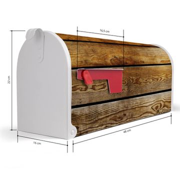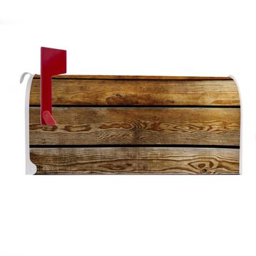 Der amerikanische Briefkasten von banjado mit Holzbretter Motiv bietet Ihnen ausreichend Fassungsvermögen, um große A4 Sendungen und Zeitschriften zu empfangen. Die typisch amerikanische rote Fahne zeigt Ihnen an, wenn Sie Post erhalten haben. Die US-Mailbox besteht aus verzinktem Stahlblech welches lackiert wurde und ist 48 x 22 x 16 CM (BxHxT) groß. Die Folie mit Motiv Holzbretter besteht aus einer wetter- und UV-resistenten Folie, die mit einem Schutzlaminat überzogen ist, sodass die US Mailbox zusätzlich vor Kratzern geschützt ist. An der Unterkante sind 4 Löcher je Seite um die Mailbox, typisch amerikanisch, an einem Holzpfahl oder einem Zaun zu befestigen. Auf Wunsch können Sie bei uns den passenden Standfuß oder die passende Wandhalterung kaufen um die US-Mailbox sicher zu befestigen. Wir bieten Ihnen ebenfalls Namensschilder, bereits beschriftet oder frei zu beschriften, und verschiedene selbst gestaltete Bitte-Keine-Werbung-Aufkleber.