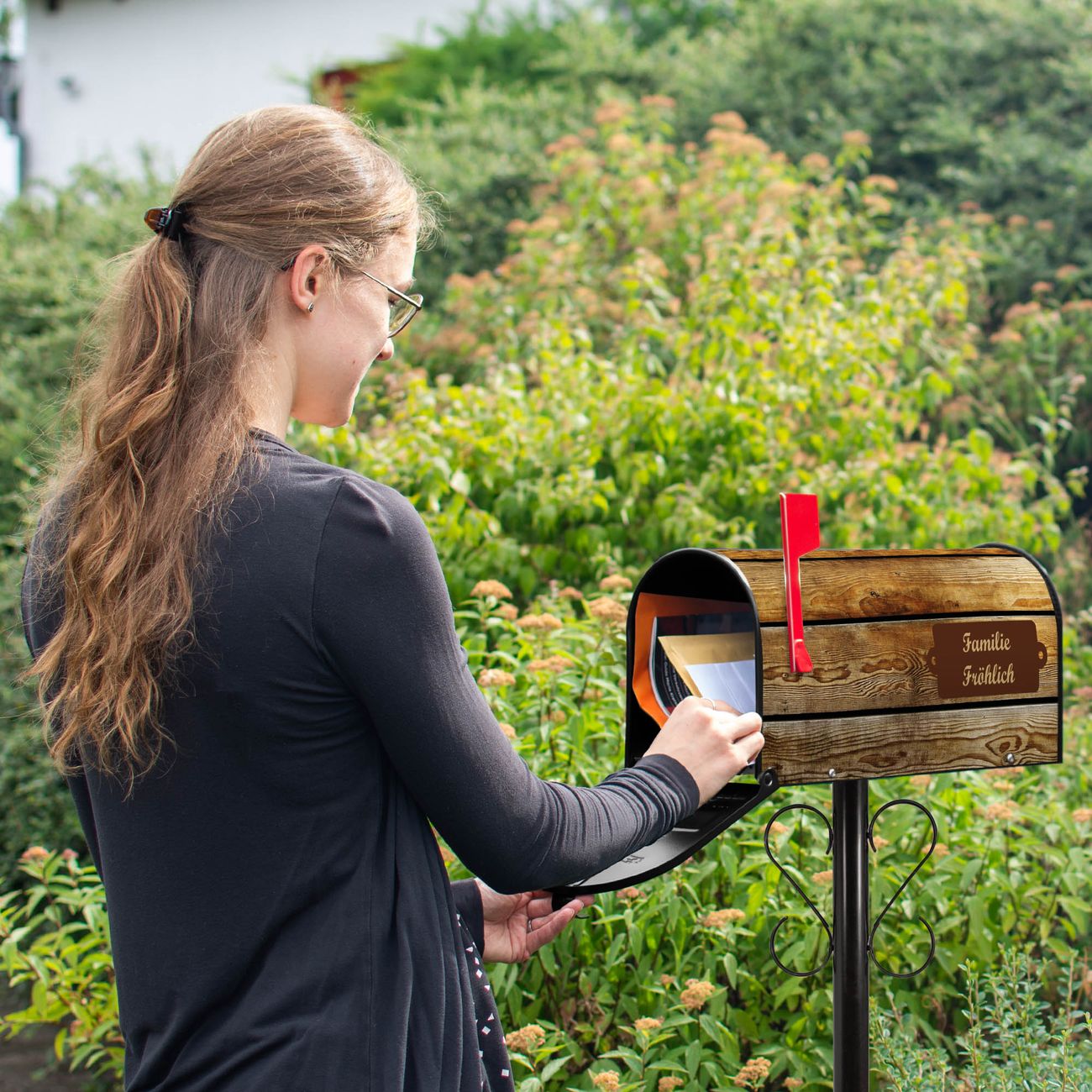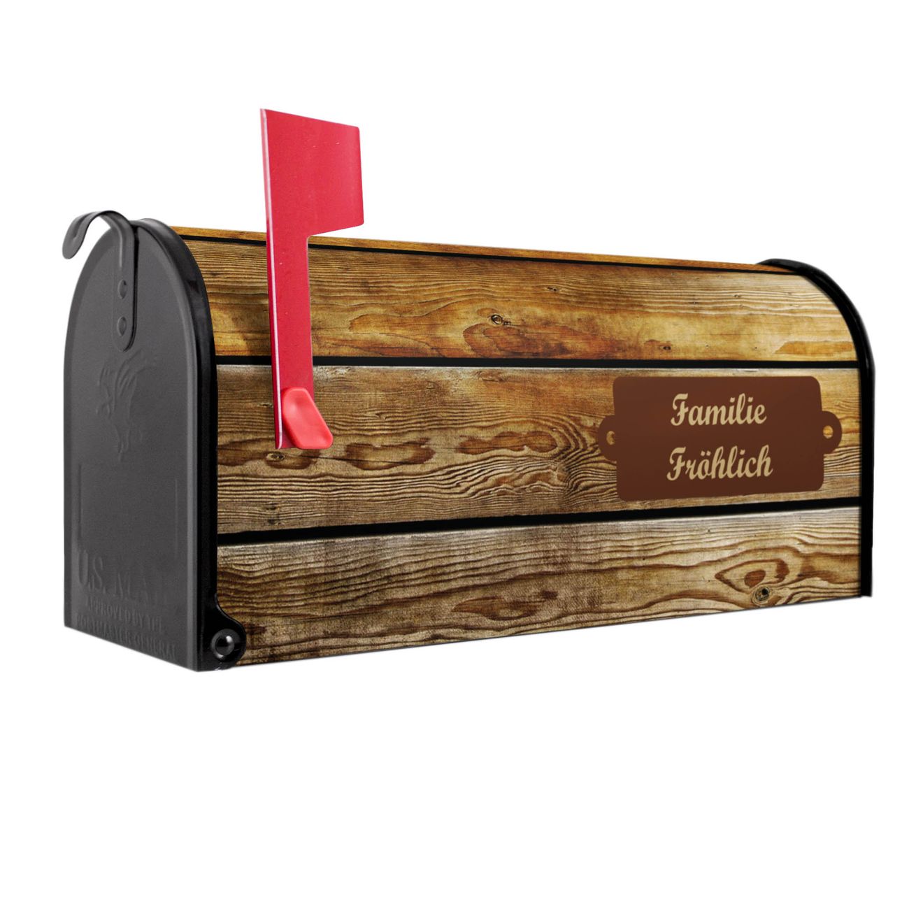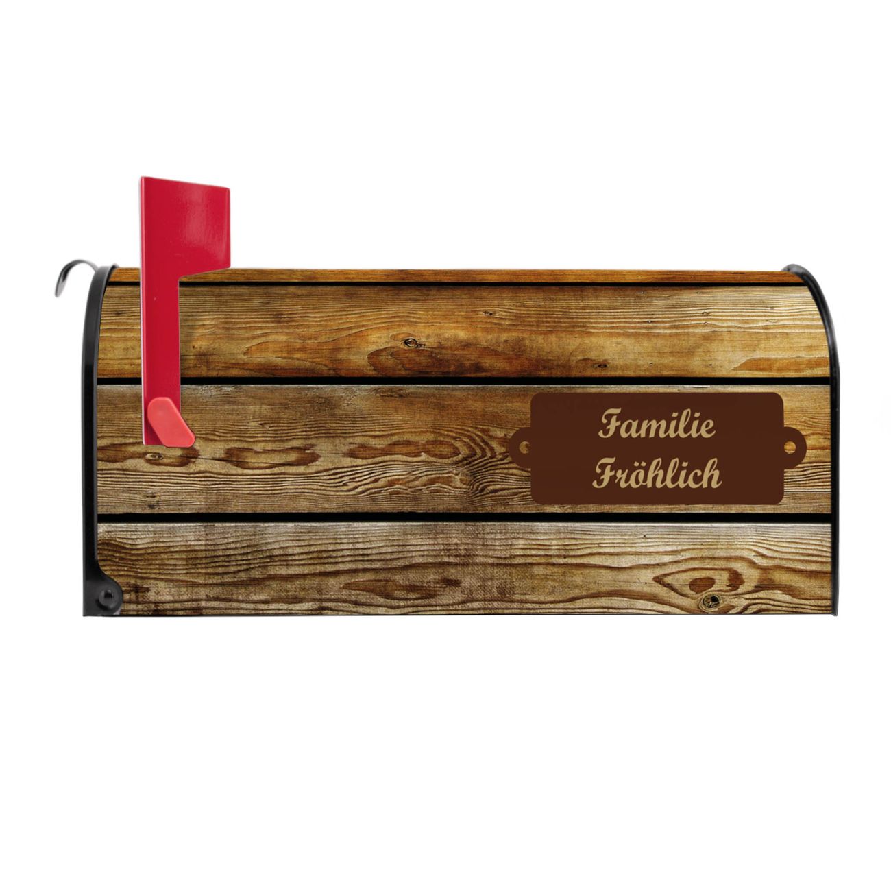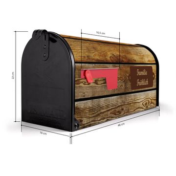 Der amerikanische Briefkasten von banjado mit Holzbretter Motiv bietet Ihnen ausreichend Fassungsvermögen, um große A4 Sendungen und Zeitschriften zu empfangen. Die typisch amerikanische rote Fahne zeigt Ihnen an, wenn Sie Post erhalten haben. Die US-Mailbox besteht aus verzinktem Stahlblech welches lackiert wurde und ist 48 x 22 x 16 CM (BxHxT) groß. Die Folie mit Motiv Holzbretter besteht aus einer wetter- und UV-resistenten Folie, die mit einem Schutzlaminat überzogen ist, sodass die US Mailbox zusätzlich vor Kratzern geschützt ist. An der Unterkante sind 4 Löcher je Seite um die Mailbox, typisch amerikanisch, an einem Holzpfahl oder einem Zaun zu befestigen. Auf Wunsch können Sie bei uns den passenden Standfuß oder die passende Wandhalterung kaufen um die US-Mailbox sicher zu befestigen. Wir bieten Ihnen ebenfalls Namensschilder, bereits beschriftet oder frei zu beschriften, und verschiedene selbst gestaltete Bitte-Keine-Werbung-Aufkleber.