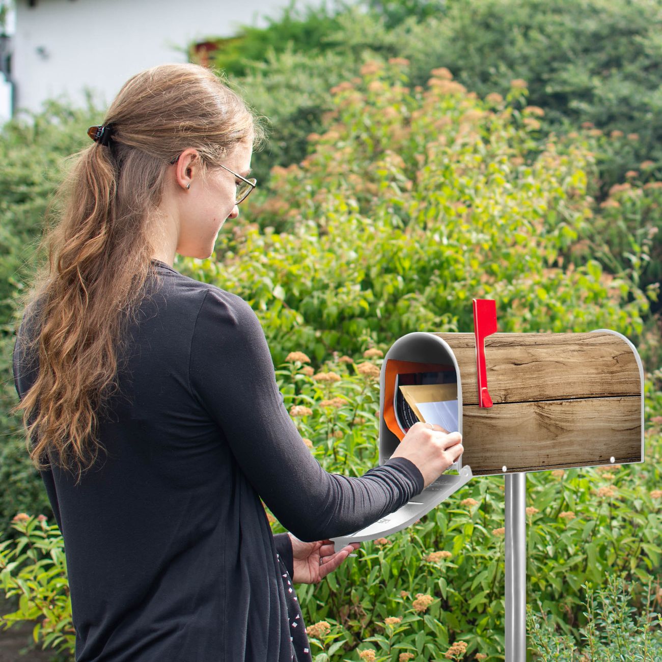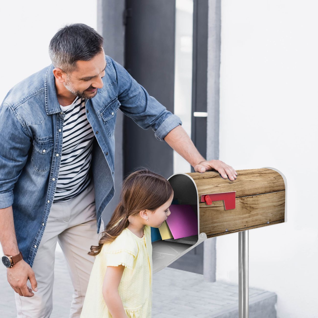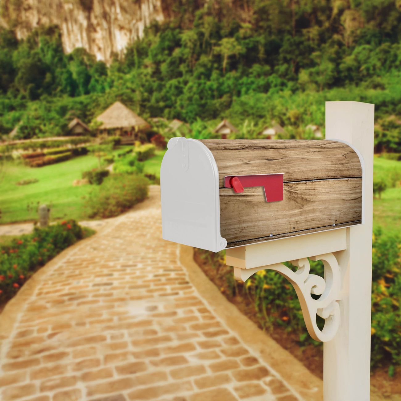 Der amerikanische Briefkasten von banjado mit Holzplanken Motiv bietet Ihnen ausreichend Fassungsvermögen, um große A4 Sendungen und Zeitschriften zu empfangen. Die typisch amerikanische rote Fahne zeigt Ihnen an, wenn Sie Post erhalten haben. Die US-Mailbox besteht aus verzinktem Stahlblech welches lackiert wurde und ist 48 x 22 x 16 CM (BxHxT) groß. Die Folie mit Motiv Holzplanken besteht aus einer wetter- und UV-resistenten Folie, die mit einem Schutzlaminat überzogen ist, sodass die US Mailbox zusätzlich vor Kratzern geschützt ist. An der Unterkante sind 4 Löcher je Seite um die Mailbox, typisch amerikanisch, an einem Holzpfahl oder einem Zaun zu befestigen. Auf Wunsch können Sie bei uns den passenden Standfuß oder die passende Wandhalterung kaufen um die US-Mailbox sicher zu befestigen. Wir bieten Ihnen ebenfalls Namensschilder, bereits beschriftet oder frei zu beschriften, und verschiedene selbst gestaltete Bitte-Keine-Werbung-Aufkleber.