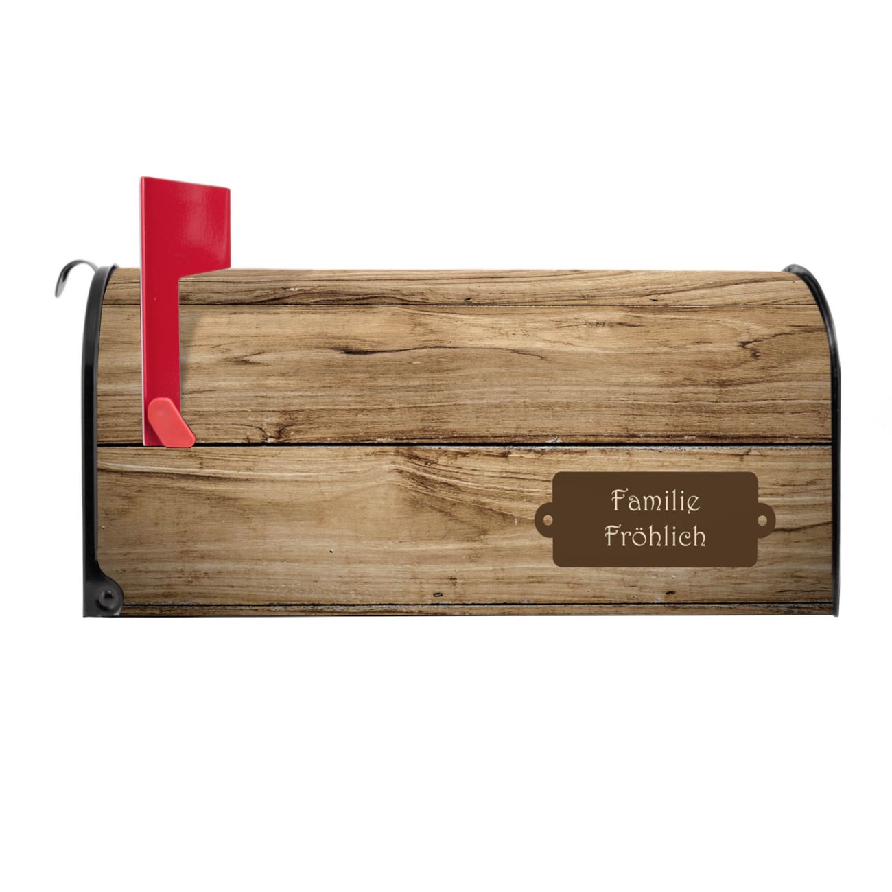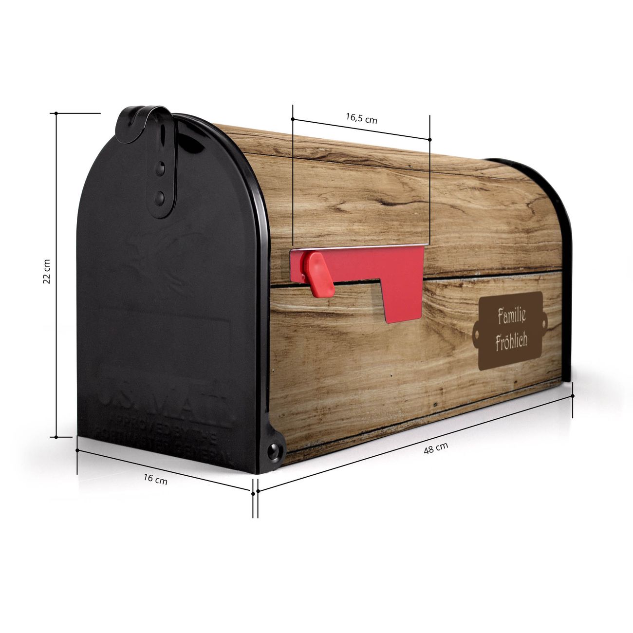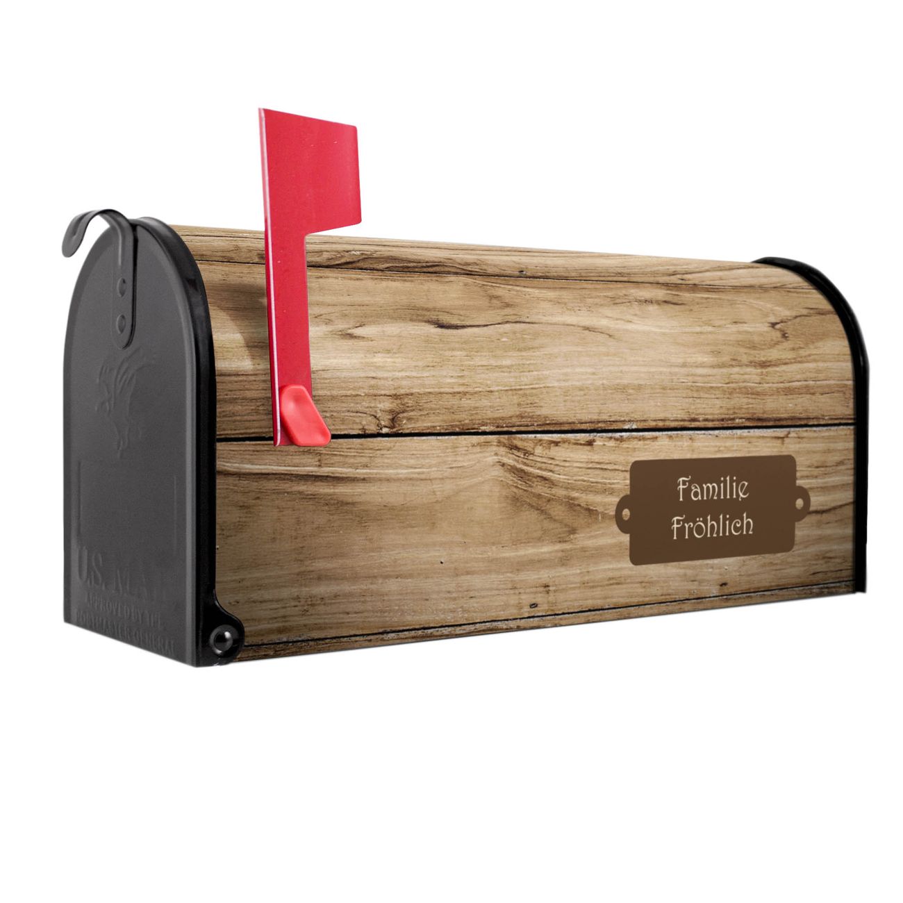 Der amerikanische Briefkasten von banjado mit Holzplanken Motiv bietet Ihnen ausreichend Fassungsvermögen, um große A4 Sendungen und Zeitschriften zu empfangen. Die typisch amerikanische rote Fahne zeigt Ihnen an, wenn Sie Post erhalten haben. Die US-Mailbox besteht aus verzinktem Stahlblech welches lackiert wurde und ist 48 x 22 x 16 CM (BxHxT) groß. Die Folie mit Motiv Holzplanken besteht aus einer wetter- und UV-resistenten Folie, die mit einem Schutzlaminat überzogen ist, sodass die US Mailbox zusätzlich vor Kratzern geschützt ist. An der Unterkante sind 4 Löcher je Seite um die Mailbox, typisch amerikanisch, an einem Holzpfahl oder einem Zaun zu befestigen. Auf Wunsch können Sie bei uns den passenden Standfuß oder die passende Wandhalterung kaufen um die US-Mailbox sicher zu befestigen. Wir bieten Ihnen ebenfalls Namensschilder, bereits beschriftet oder frei zu beschriften, und verschiedene selbst gestaltete Bitte-Keine-Werbung-Aufkleber.