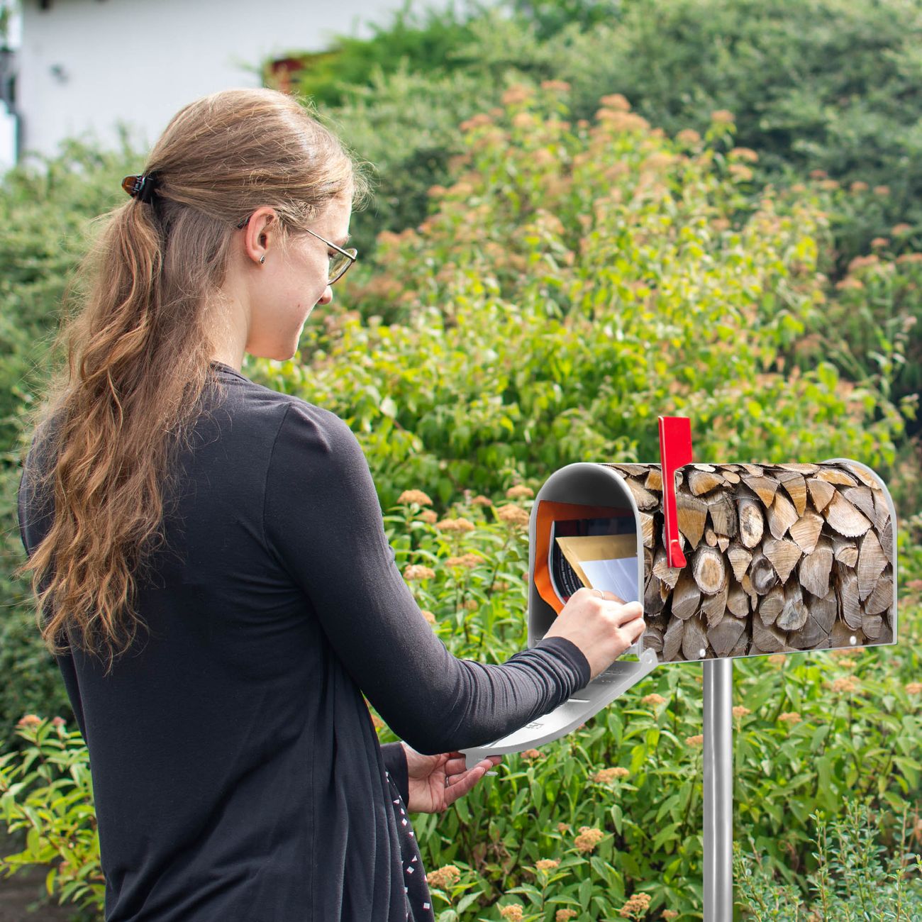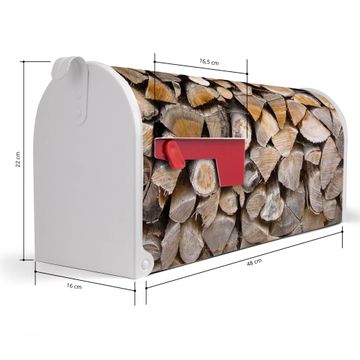 Der amerikanische Briefkasten von banjado mit Holzstapel Motiv bietet Ihnen ausreichend Fassungsvermögen, um große A4 Sendungen und Zeitschriften zu empfangen. Die typisch amerikanische rote Fahne zeigt Ihnen an, wenn Sie Post erhalten haben. Die US-Mailbox besteht aus verzinktem Stahlblech welches lackiert wurde und ist 48 x 22 x 16 CM (BxHxT) groß. Die Folie mit Motiv Holzstapel besteht aus einer wetter- und UV-resistenten Folie, die mit einem Schutzlaminat überzogen ist, sodass die US Mailbox zusätzlich vor Kratzern geschützt ist. An der Unterkante sind 4 Löcher je Seite um die Mailbox, typisch amerikanisch, an einem Holzpfahl oder einem Zaun zu befestigen. Auf Wunsch können Sie bei uns den passenden Standfuß oder die passende Wandhalterung kaufen um die US-Mailbox sicher zu befestigen. Wir bieten Ihnen ebenfalls Namensschilder, bereits beschriftet oder frei zu beschriften, und verschiedene selbst gestaltete Bitte-Keine-Werbung-Aufkleber.