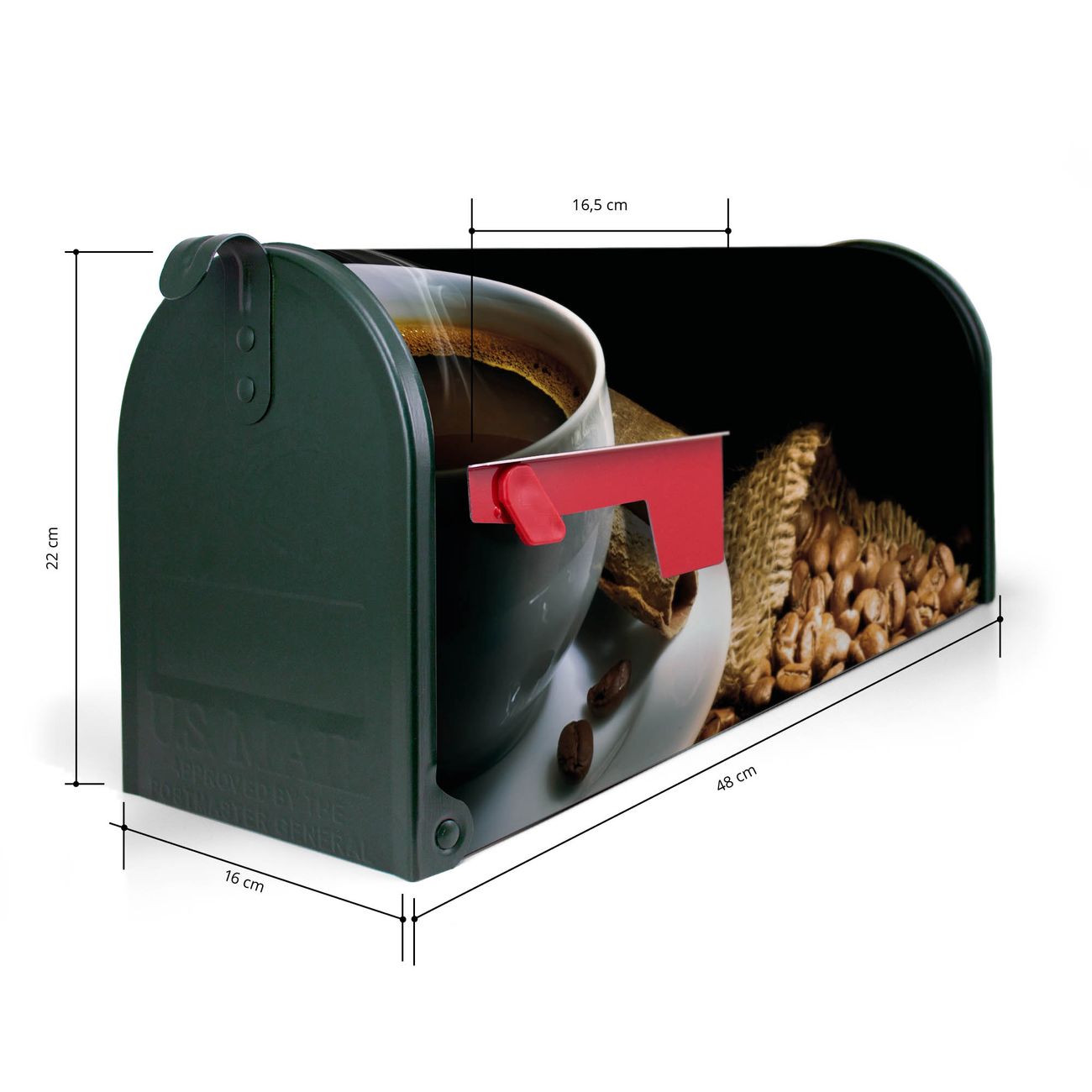 Der amerikanische Briefkasten von banjado mit Hot Coffee Motiv bietet Ihnen ausreichend Fassungsvermögen, um große A4 Sendungen und Zeitschriften zu empfangen. Die typisch amerikanische rote Fahne zeigt Ihnen an, wenn Sie Post erhalten haben. Die US-Mailbox besteht aus verzinktem Stahlblech welches lackiert wurde und ist 48 x 22 x 16 CM (BxHxT) groß. Die Folie mit Motiv Hot Coffee besteht aus einer wetter- und UV-resistenten Folie, die mit einem Schutzlaminat überzogen ist, sodass die US Mailbox zusätzlich vor Kratzern geschützt ist. An der Unterkante sind 4 Löcher je Seite um die Mailbox, typisch amerikanisch, an einem Holzpfahl oder einem Zaun zu befestigen. Auf Wunsch können Sie bei uns den passenden Standfuß oder die passende Wandhalterung kaufen um die US-Mailbox sicher zu befestigen. Wir bieten Ihnen ebenfalls Namensschilder, bereits beschriftet oder frei zu beschriften, und verschiedene selbst gestaltete Bitte-Keine-Werbung-Aufkleber.