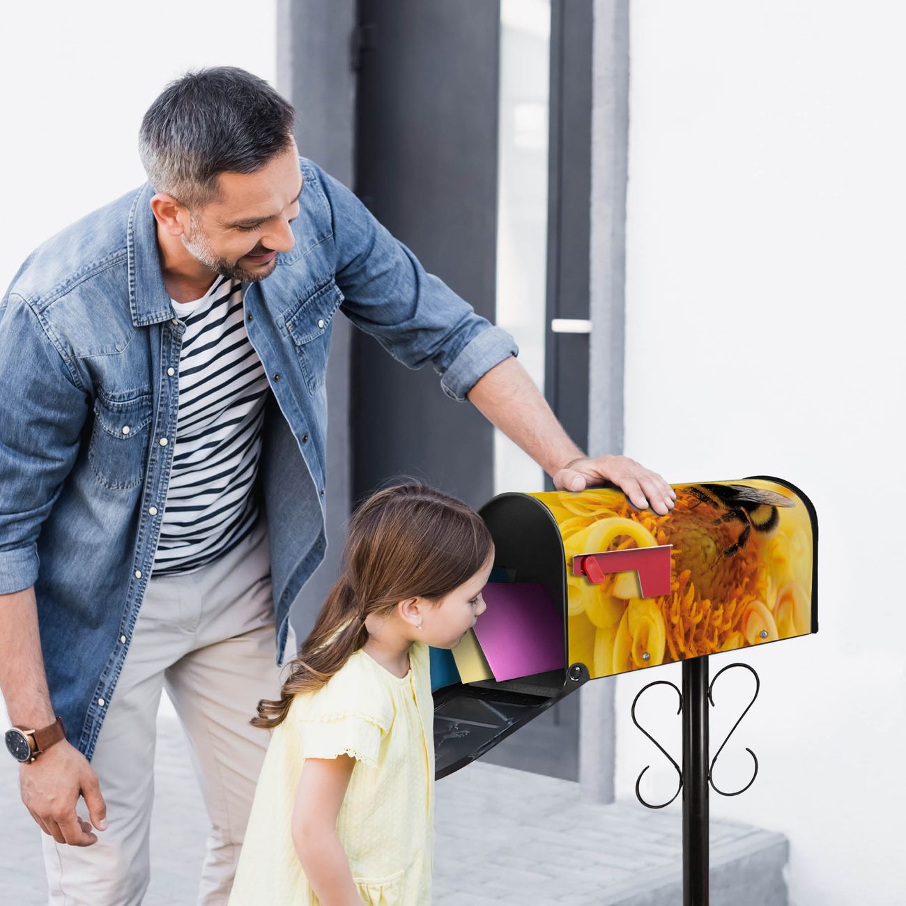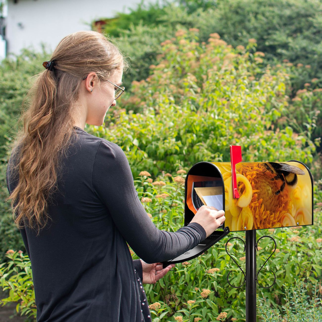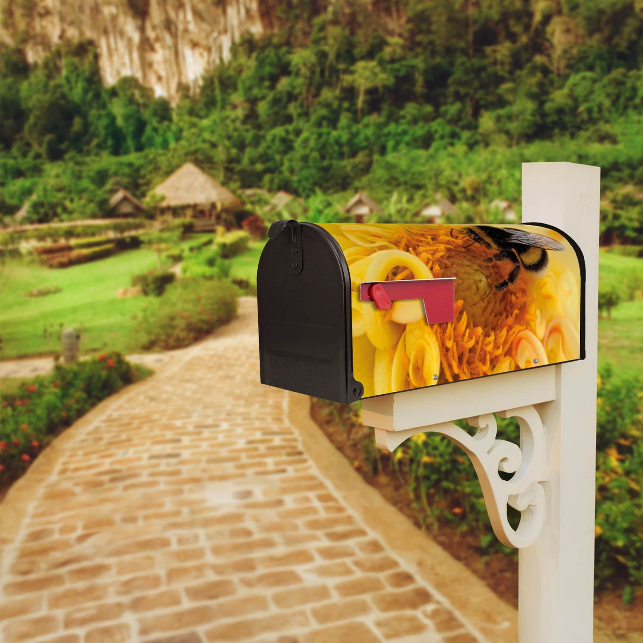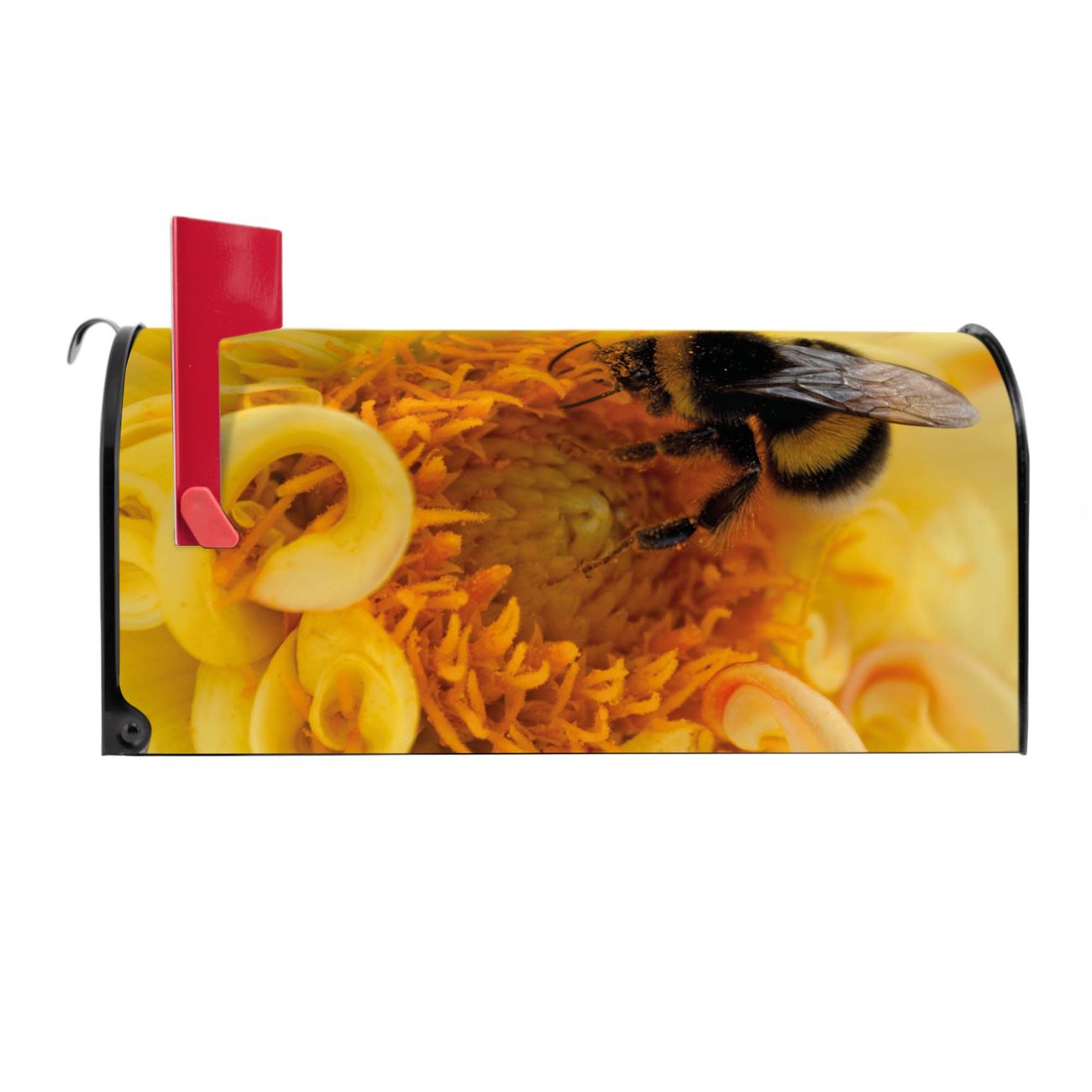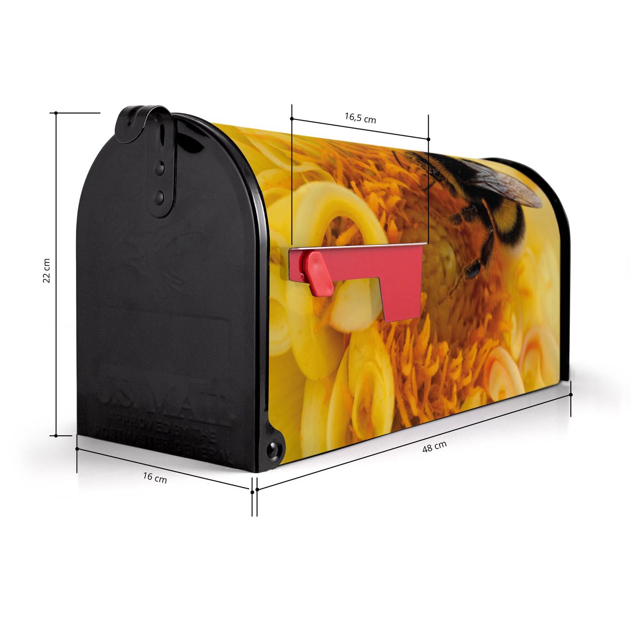 Der amerikanische Briefkasten von banjado mit Hummel Motiv bietet Ihnen ausreichend Fassungsvermögen, um große A4 Sendungen und Zeitschriften zu empfangen. Die typisch amerikanische rote Fahne zeigt Ihnen an, wenn Sie Post erhalten haben. Die US-Mailbox besteht aus verzinktem Stahlblech welches lackiert wurde und ist 48 x 22 x 16 CM (BxHxT) groß. Die Folie mit Motiv Hummel besteht aus einer wetter- und UV-resistenten Folie, die mit einem Schutzlaminat überzogen ist, sodass die US Mailbox zusätzlich vor Kratzern geschützt ist. An der Unterkante sind 4 Löcher je Seite um die Mailbox, typisch amerikanisch, an einem Holzpfahl oder einem Zaun zu befestigen. Auf Wunsch können Sie bei uns den passenden Standfuß oder die passende Wandhalterung kaufen um die US-Mailbox sicher zu befestigen. Wir bieten Ihnen ebenfalls Namensschilder, bereits beschriftet oder frei zu beschriften, und verschiedene selbst gestaltete Bitte-Keine-Werbung-Aufkleber.