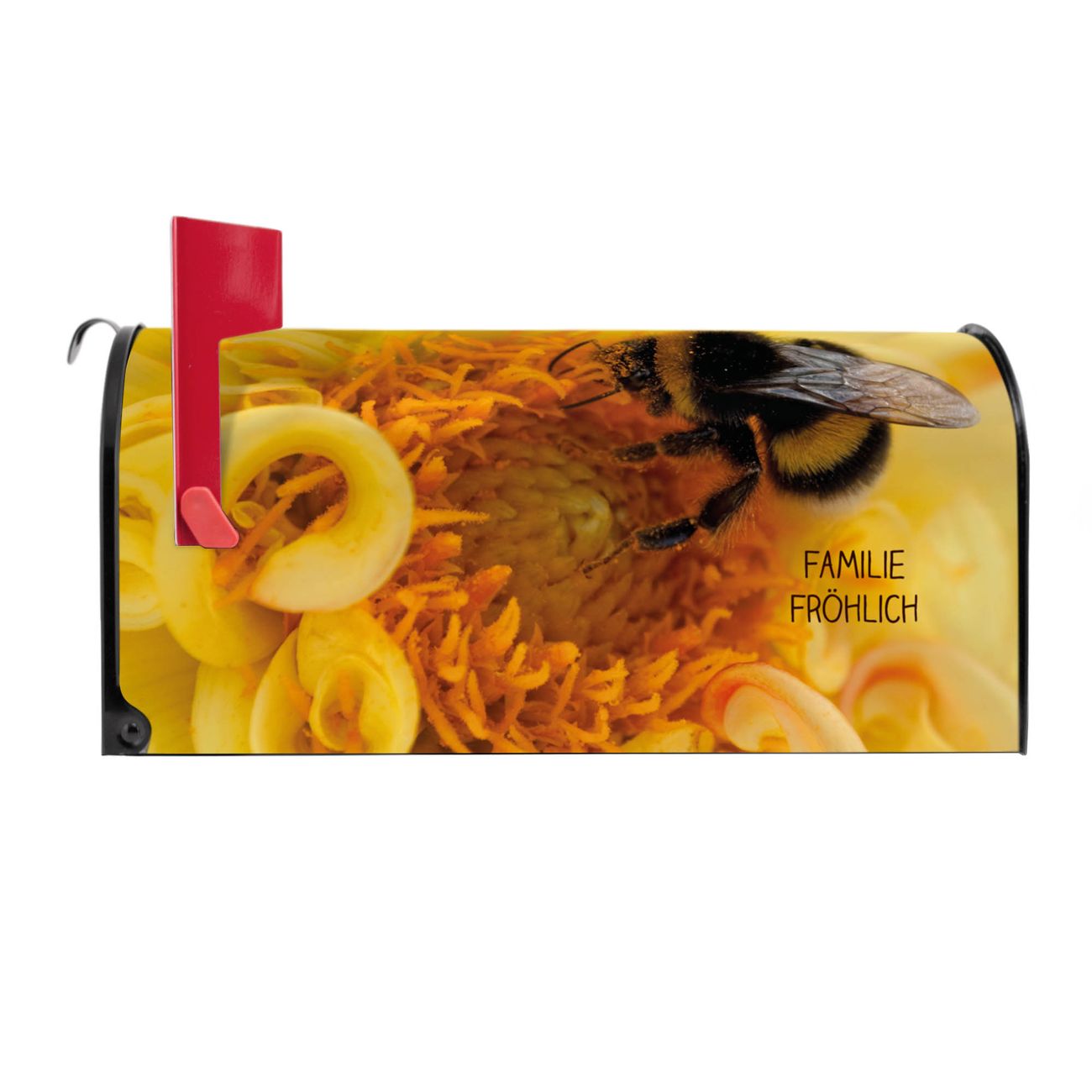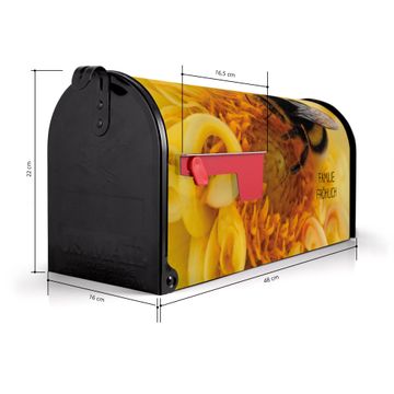 Der amerikanische Briefkasten von banjado mit Hummel Motiv bietet Ihnen ausreichend Fassungsvermögen, um große A4 Sendungen und Zeitschriften zu empfangen. Die typisch amerikanische rote Fahne zeigt Ihnen an, wenn Sie Post erhalten haben. Die US-Mailbox besteht aus verzinktem Stahlblech welches lackiert wurde und ist 48 x 22 x 16 CM (BxHxT) groß. Die Folie mit Motiv Hummel besteht aus einer wetter- und UV-resistenten Folie, die mit einem Schutzlaminat überzogen ist, sodass die US Mailbox zusätzlich vor Kratzern geschützt ist. An der Unterkante sind 4 Löcher je Seite um die Mailbox, typisch amerikanisch, an einem Holzpfahl oder einem Zaun zu befestigen. Auf Wunsch können Sie bei uns den passenden Standfuß oder die passende Wandhalterung kaufen um die US-Mailbox sicher zu befestigen. Wir bieten Ihnen ebenfalls Namensschilder, bereits beschriftet oder frei zu beschriften, und verschiedene selbst gestaltete Bitte-Keine-Werbung-Aufkleber.