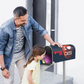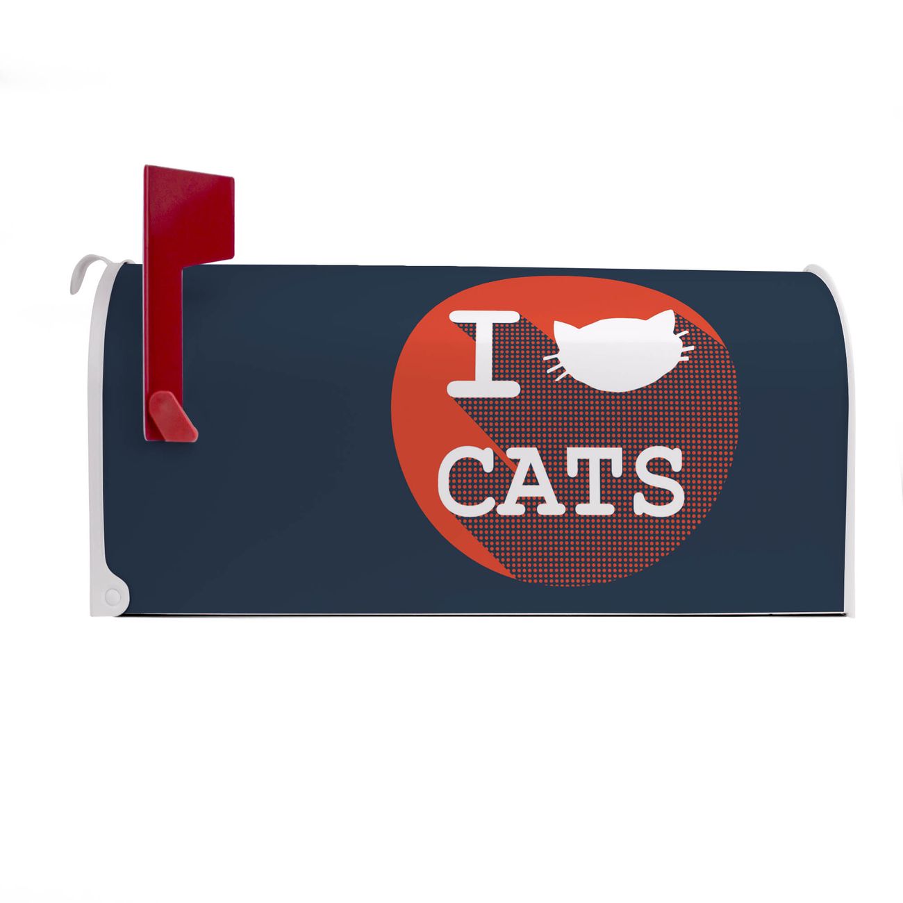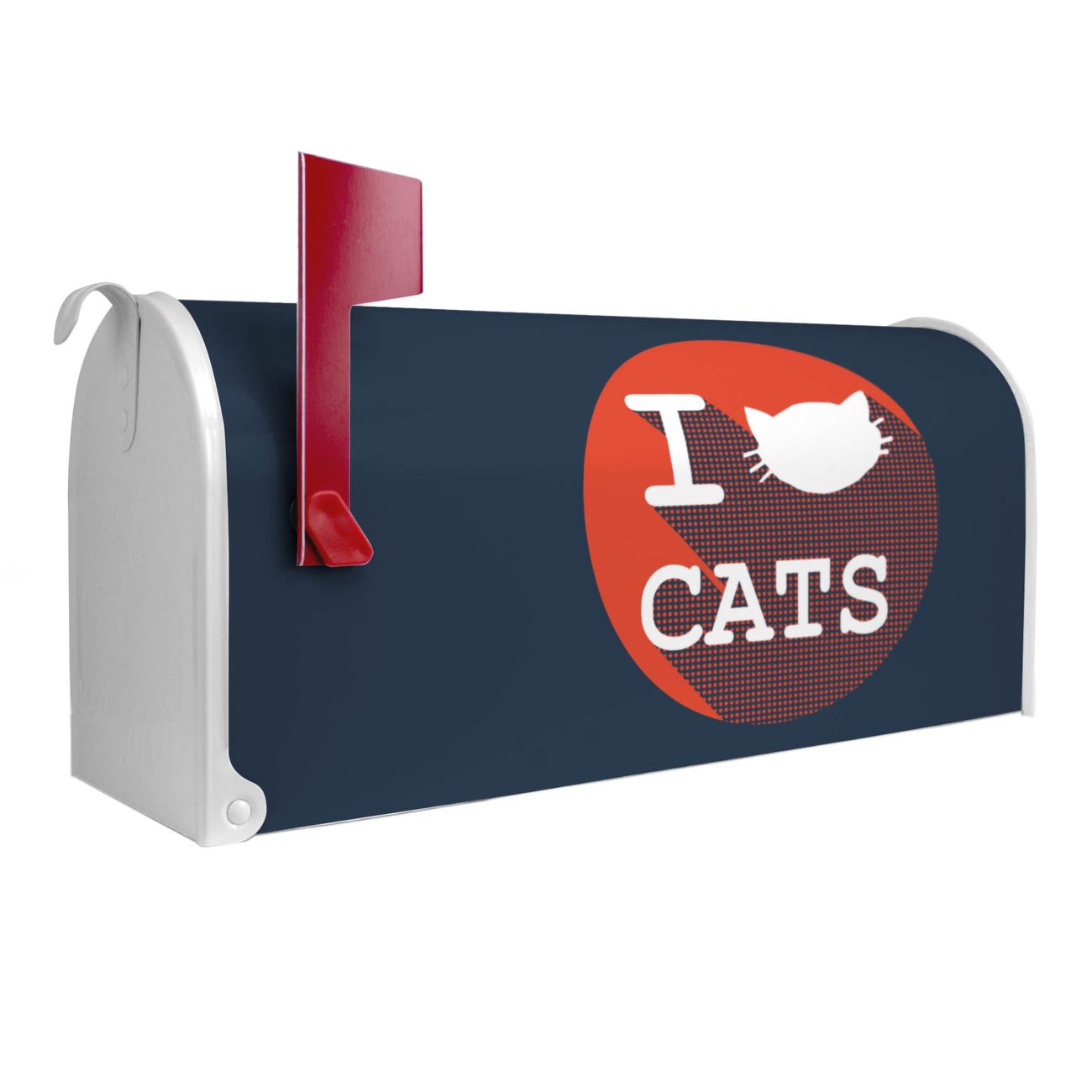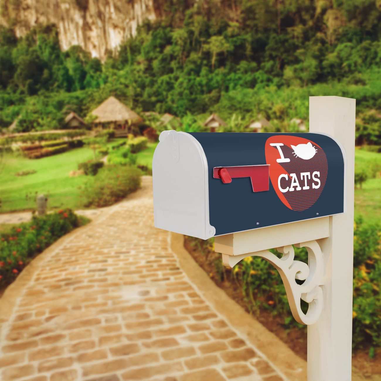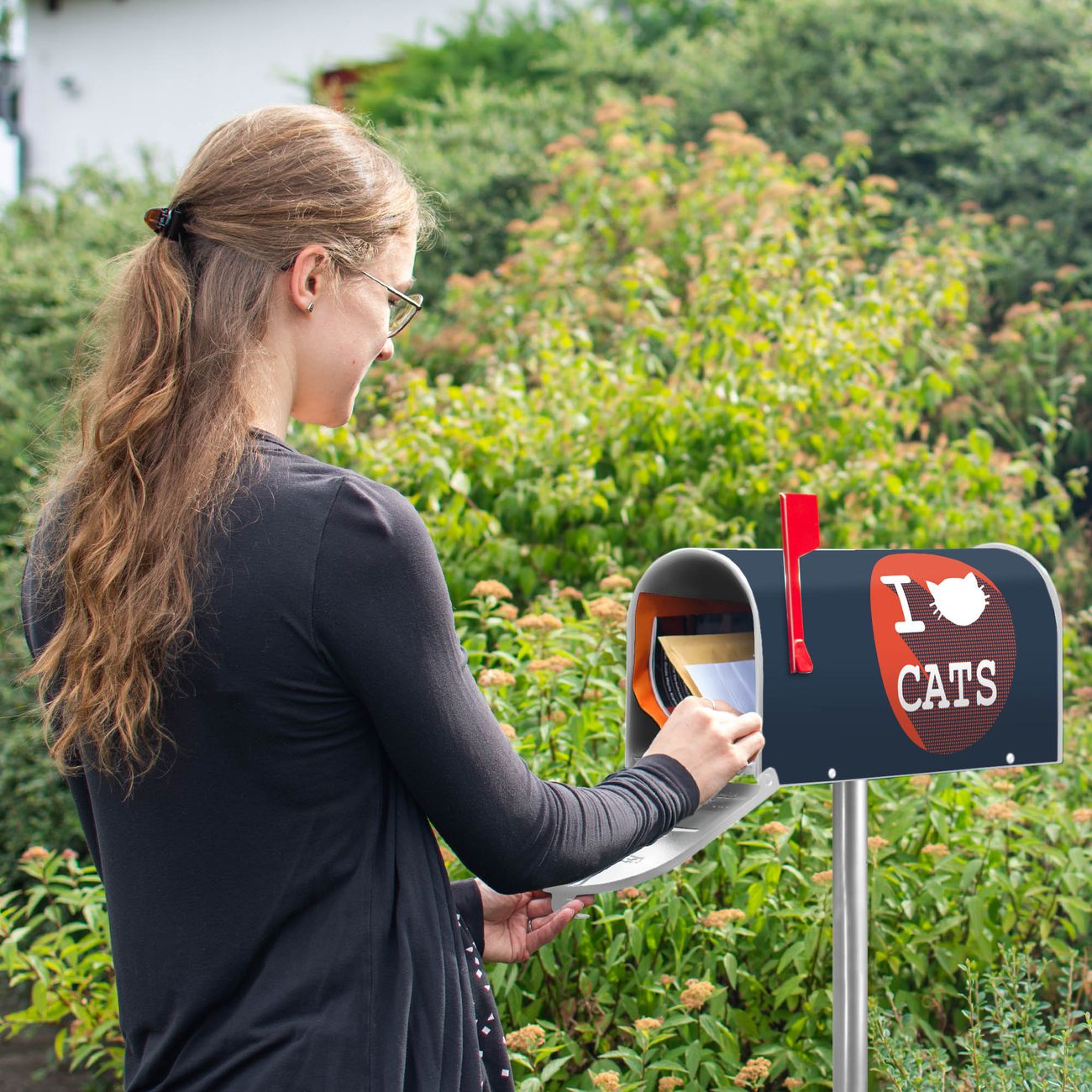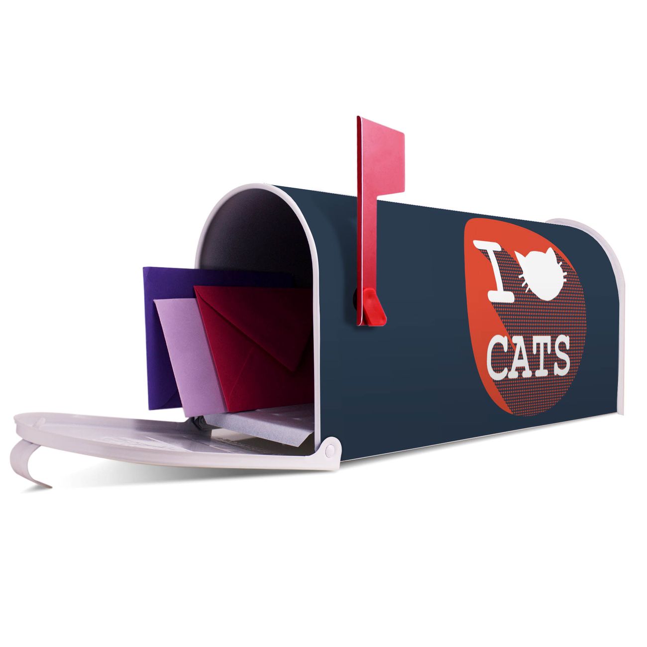 Der amerikanische Briefkasten von banjado mit I Love Cats Motiv bietet Ihnen ausreichend Fassungsvermögen, um große A4 Sendungen und Zeitschriften zu empfangen. Die typisch amerikanische rote Fahne zeigt Ihnen an, wenn Sie Post erhalten haben. Die US-Mailbox besteht aus verzinktem Stahlblech welches lackiert wurde und ist 48 x 22 x 16 CM (BxHxT) groß. Die Folie mit Motiv I Love Cats besteht aus einer wetter- und UV-resistenten Folie, die mit einem Schutzlaminat überzogen ist, sodass die US Mailbox zusätzlich vor Kratzern geschützt ist. An der Unterkante sind 4 Löcher je Seite um die Mailbox, typisch amerikanisch, an einem Holzpfahl oder einem Zaun zu befestigen. Auf Wunsch können Sie bei uns den passenden Standfuß oder die passende Wandhalterung kaufen um die US-Mailbox sicher zu befestigen. Wir bieten Ihnen ebenfalls Namensschilder, bereits beschriftet oder frei zu beschriften, und verschiedene selbst gestaltete Bitte-Keine-Werbung-Aufkleber.
