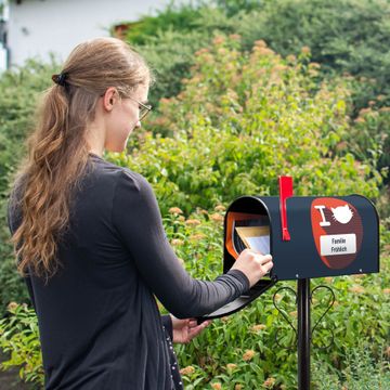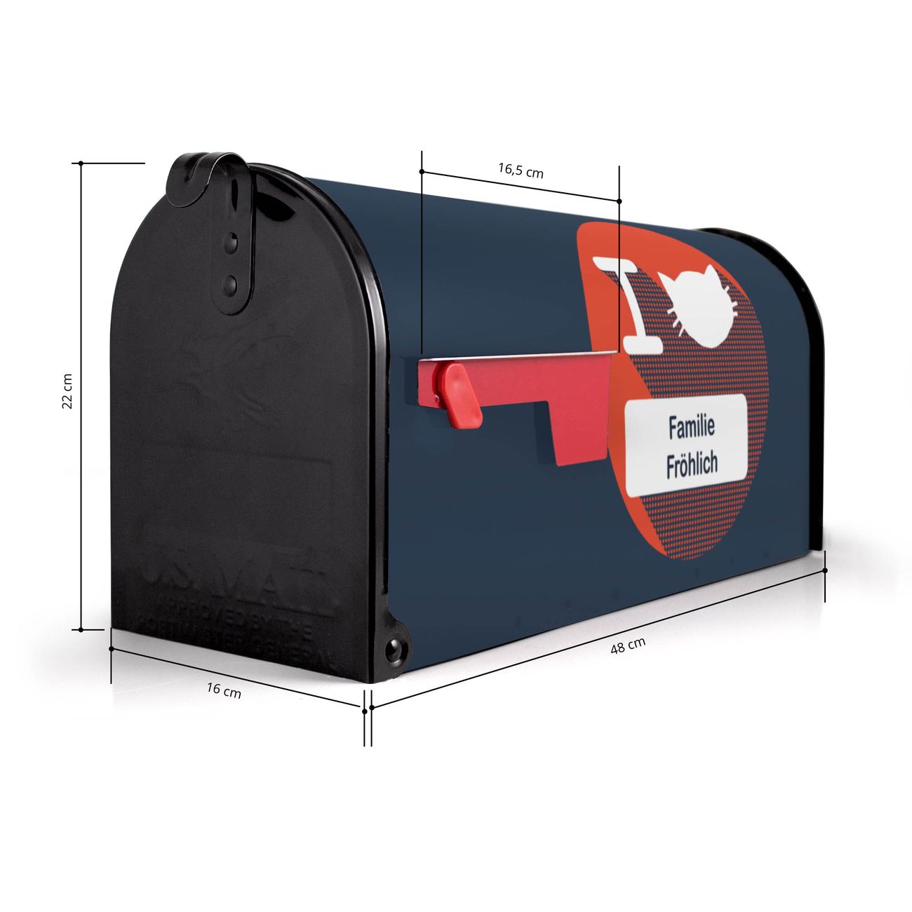 Der amerikanische Briefkasten von banjado mit I Love Cats Motiv bietet Ihnen ausreichend Fassungsvermögen, um große A4 Sendungen und Zeitschriften zu empfangen. Die typisch amerikanische rote Fahne zeigt Ihnen an, wenn Sie Post erhalten haben. Die US-Mailbox besteht aus verzinktem Stahlblech welches lackiert wurde und ist 48 x 22 x 16 CM (BxHxT) groß. Die Folie mit Motiv I Love Cats besteht aus einer wetter- und UV-resistenten Folie, die mit einem Schutzlaminat überzogen ist, sodass die US Mailbox zusätzlich vor Kratzern geschützt ist. An der Unterkante sind 4 Löcher je Seite um die Mailbox, typisch amerikanisch, an einem Holzpfahl oder einem Zaun zu befestigen. Auf Wunsch können Sie bei uns den passenden Standfuß oder die passende Wandhalterung kaufen um die US-Mailbox sicher zu befestigen. Wir bieten Ihnen ebenfalls Namensschilder, bereits beschriftet oder frei zu beschriften, und verschiedene selbst gestaltete Bitte-Keine-Werbung-Aufkleber.