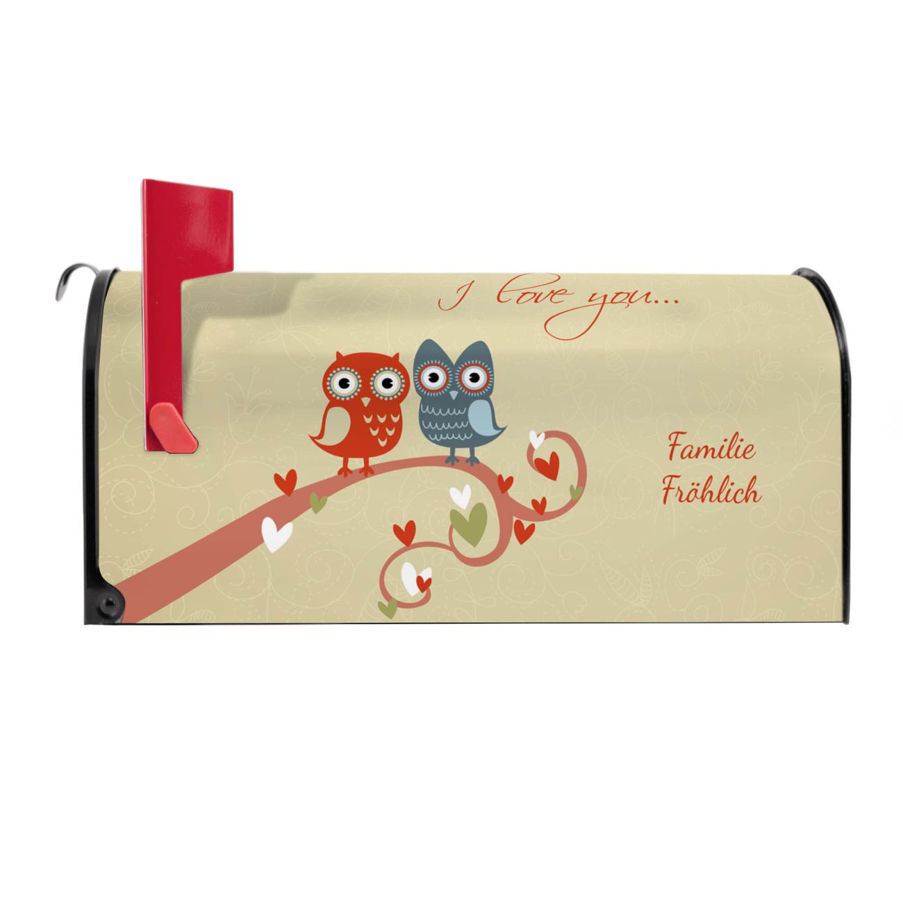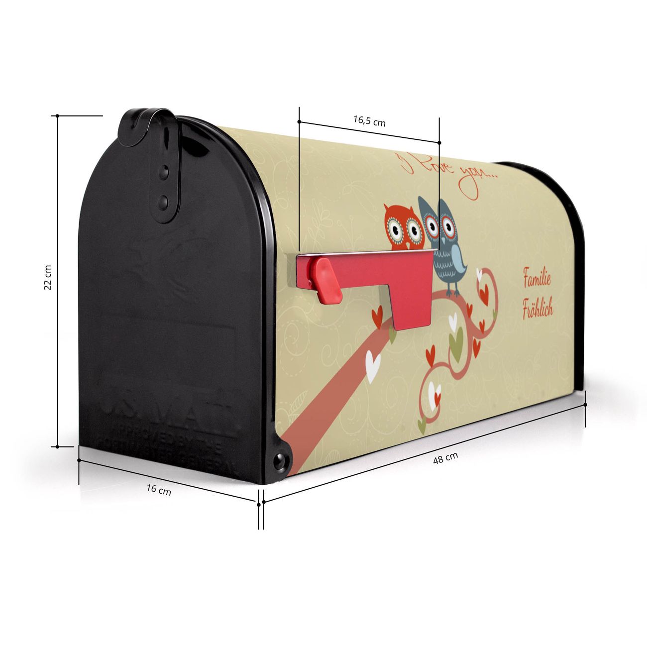 Der amerikanische Briefkasten von banjado mit I Love You Motiv bietet Ihnen ausreichend Fassungsvermögen, um große A4 Sendungen und Zeitschriften zu empfangen. Die typisch amerikanische rote Fahne zeigt Ihnen an, wenn Sie Post erhalten haben. Die US-Mailbox besteht aus verzinktem Stahlblech welches lackiert wurde und ist 48 x 22 x 16 CM (BxHxT) groß. Die Folie mit Motiv I Love You besteht aus einer wetter- und UV-resistenten Folie, die mit einem Schutzlaminat überzogen ist, sodass die US Mailbox zusätzlich vor Kratzern geschützt ist. An der Unterkante sind 4 Löcher je Seite um die Mailbox, typisch amerikanisch, an einem Holzpfahl oder einem Zaun zu befestigen. Auf Wunsch können Sie bei uns den passenden Standfuß oder die passende Wandhalterung kaufen um die US-Mailbox sicher zu befestigen. Wir bieten Ihnen ebenfalls Namensschilder, bereits beschriftet oder frei zu beschriften, und verschiedene selbst gestaltete Bitte-Keine-Werbung-Aufkleber.